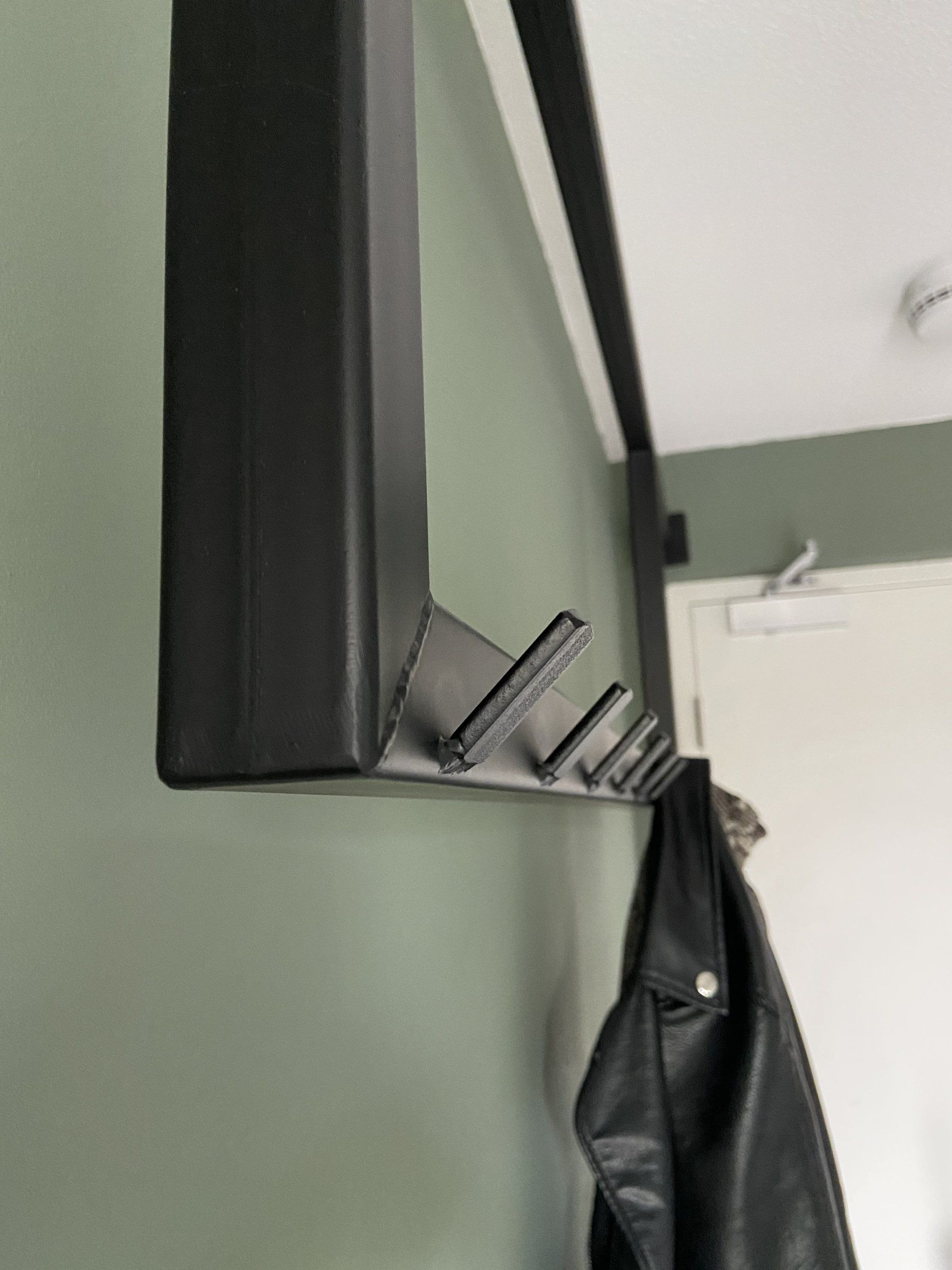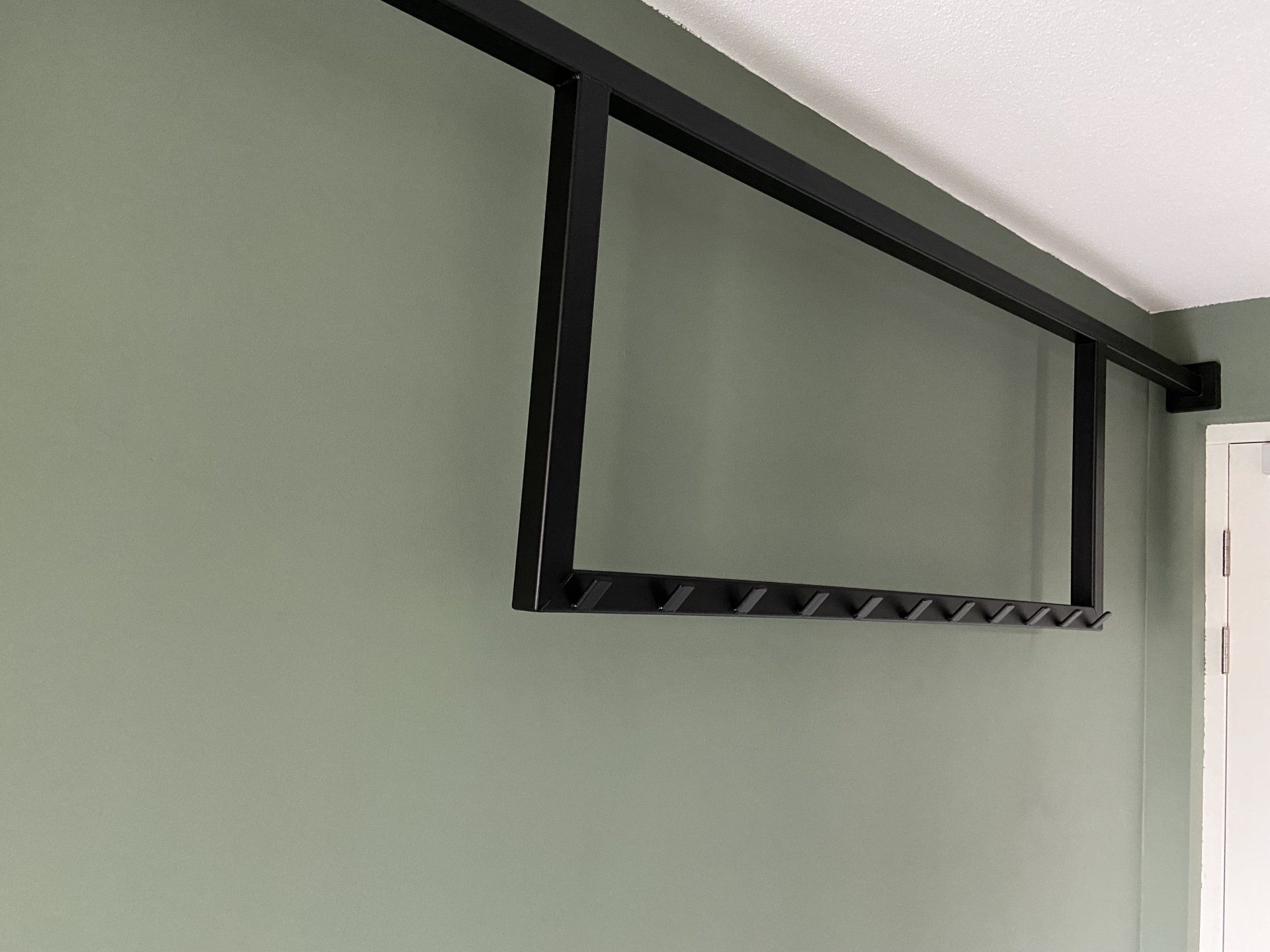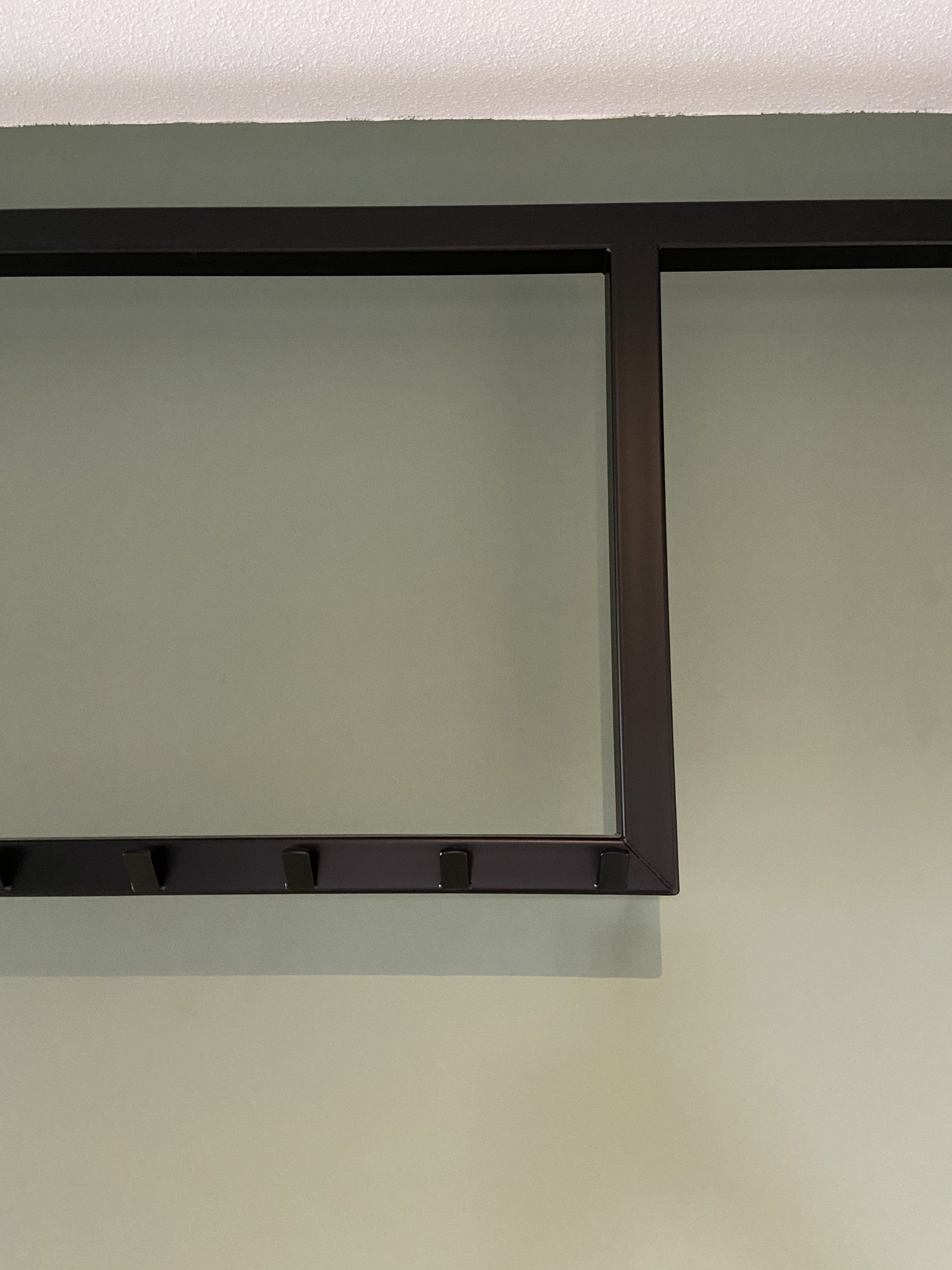 Een kapstok van staal welke de drie meter hal overspant. Met elf haakjes genoeg ruimte voor jassen en tassen. De kapstok is tevens een dragend onderdeel voor de stalen deur aan het eind van de gang. Zonder zichtbare schroeven gemonteerd.