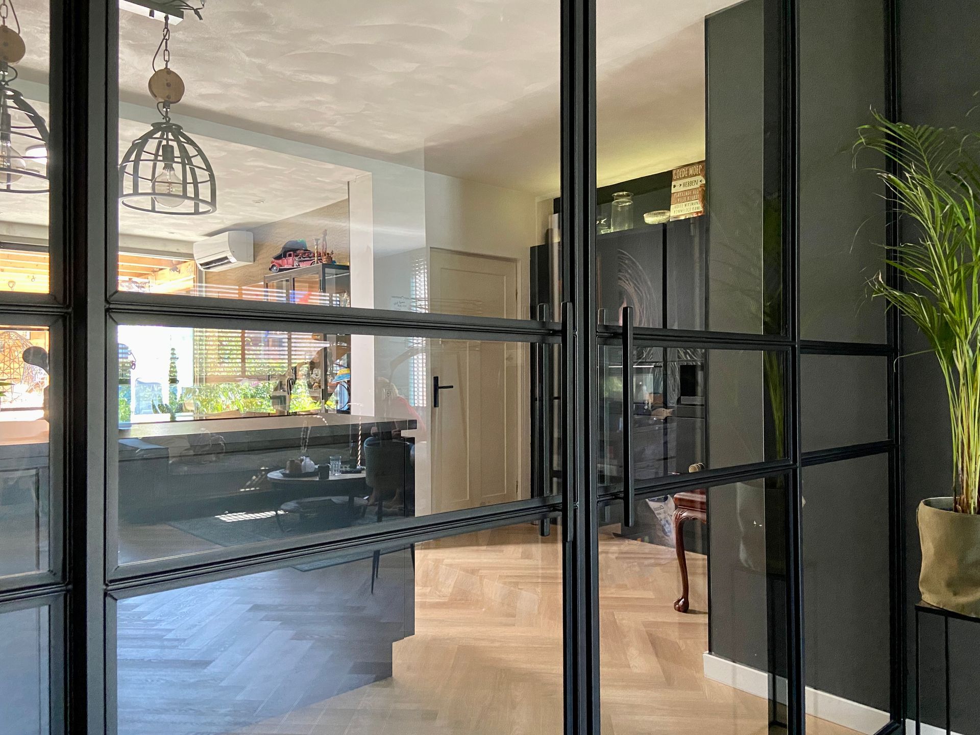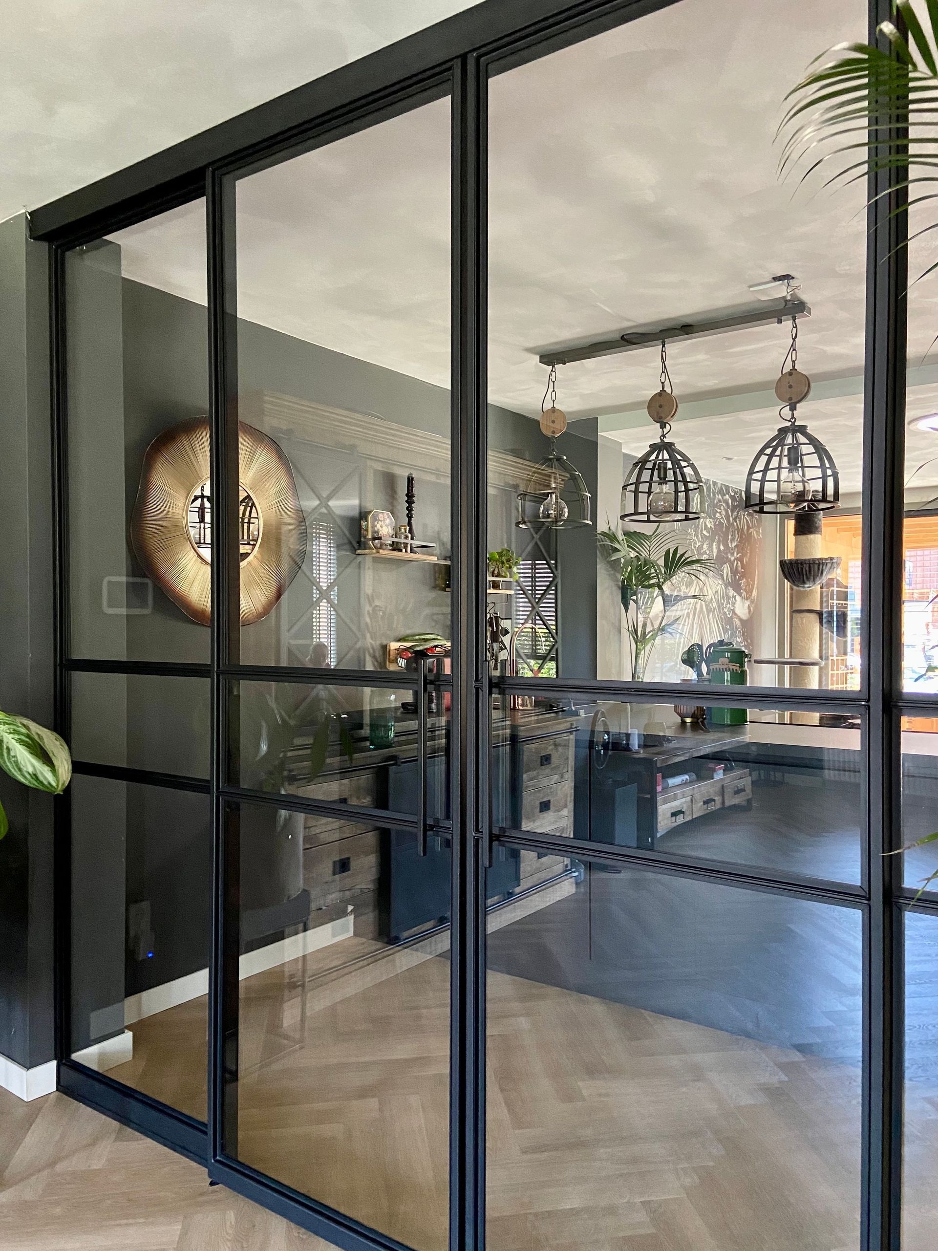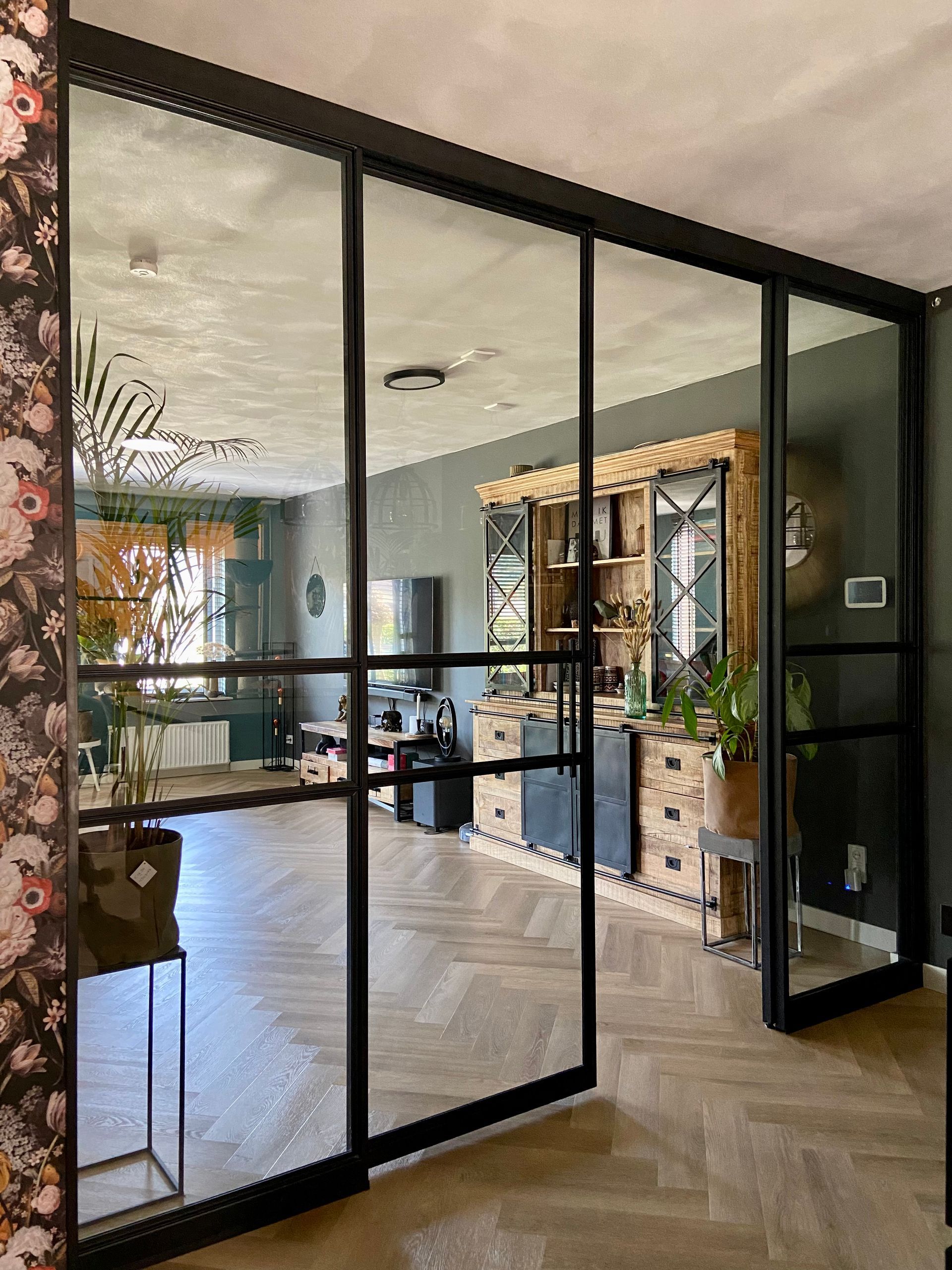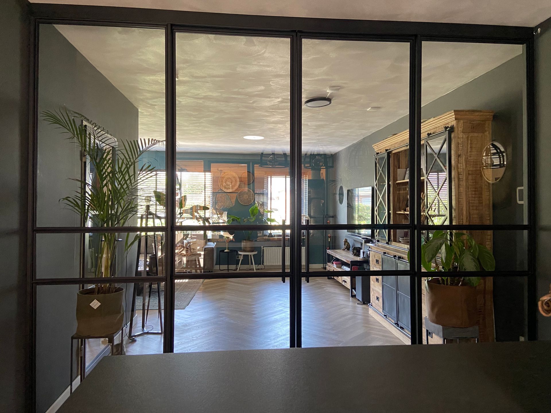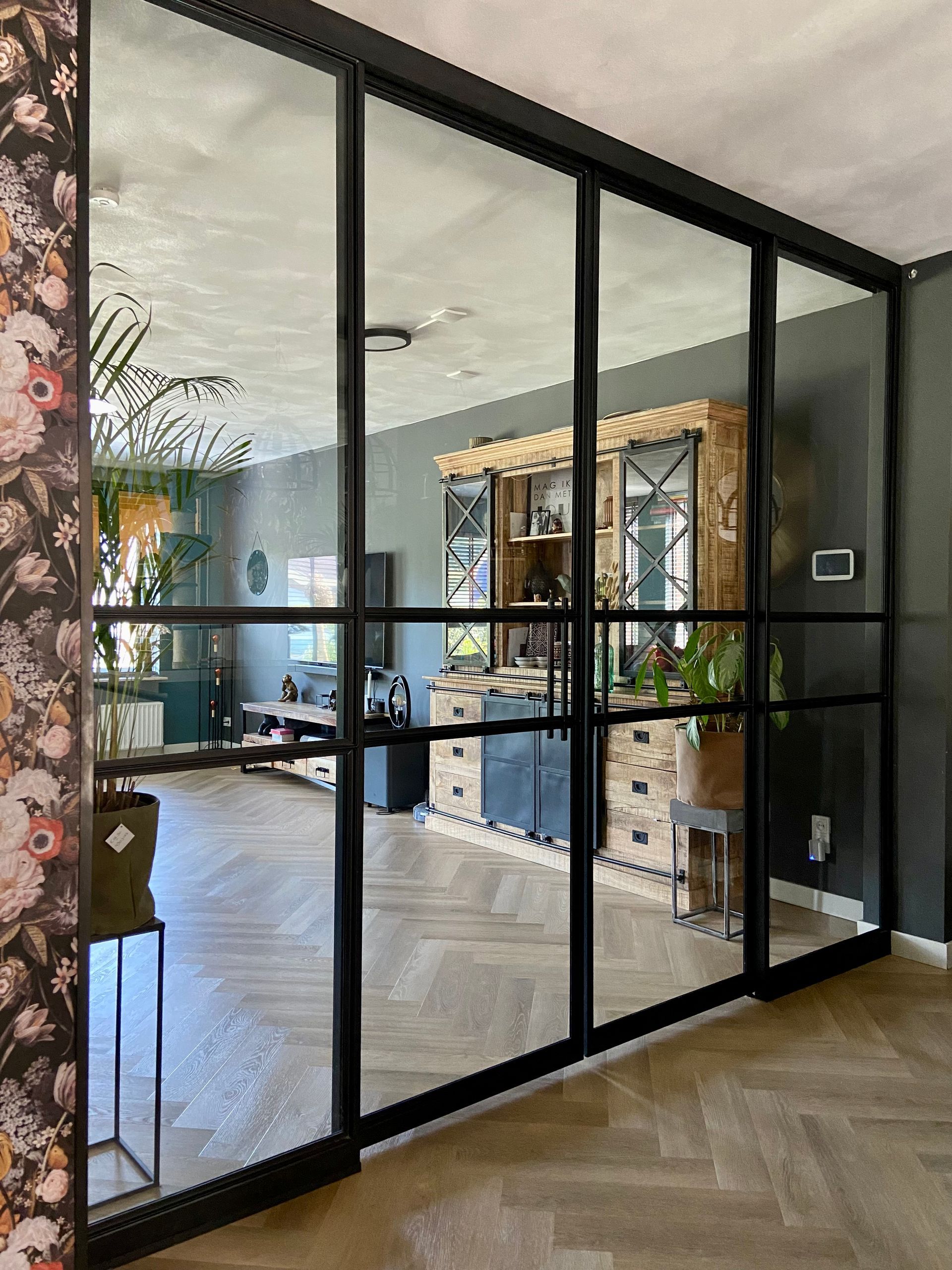 Twee schuifdeuren met twee zijlichten. Een scheiding tussen woonkamer en keuken. Een wand met smal middenvak voor een mooi lijnenspel. Ideaal wanneer de deuren vaak open of juist dicht blijven.