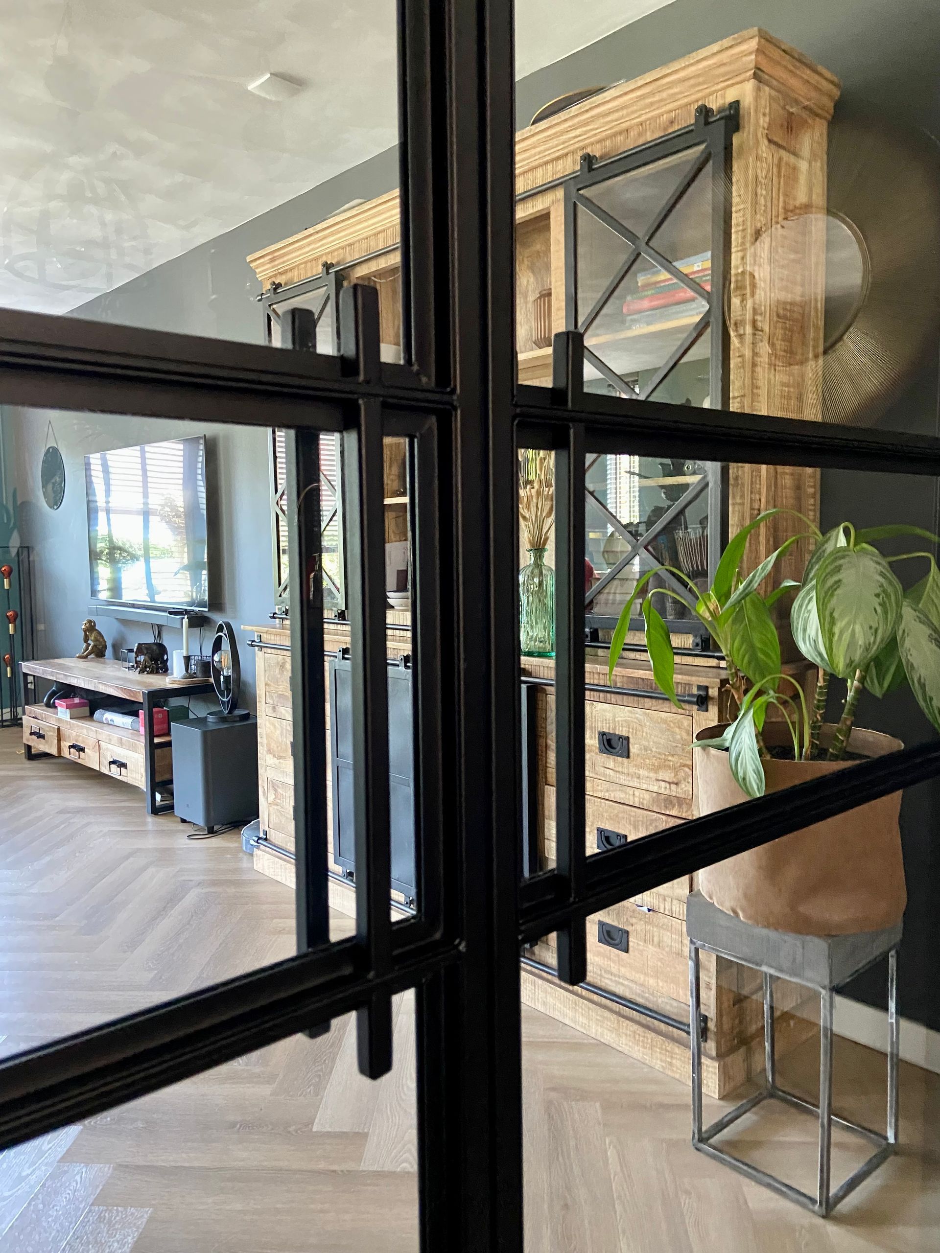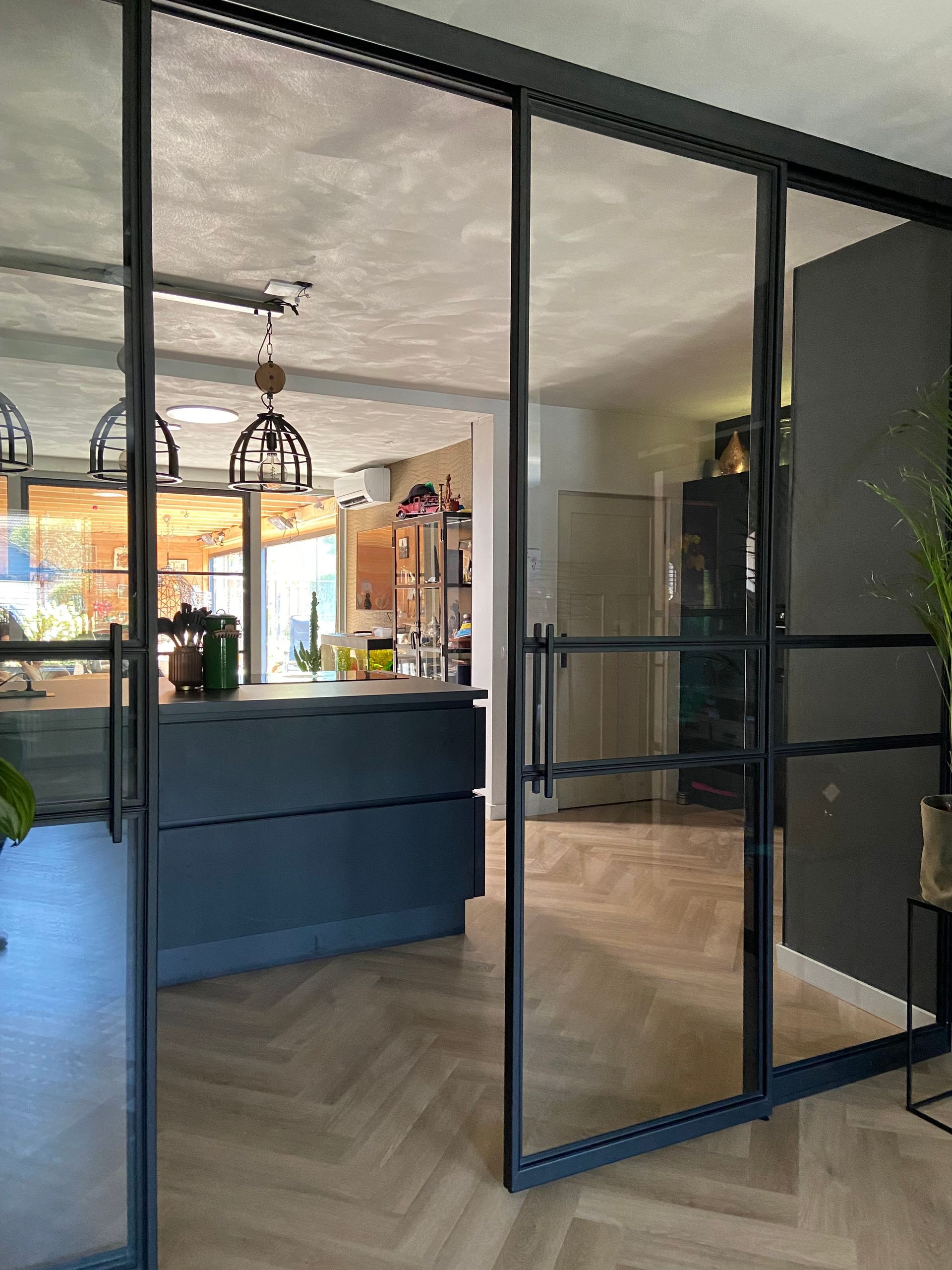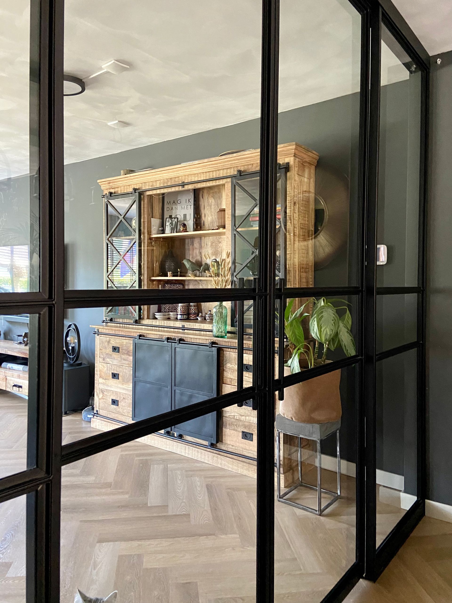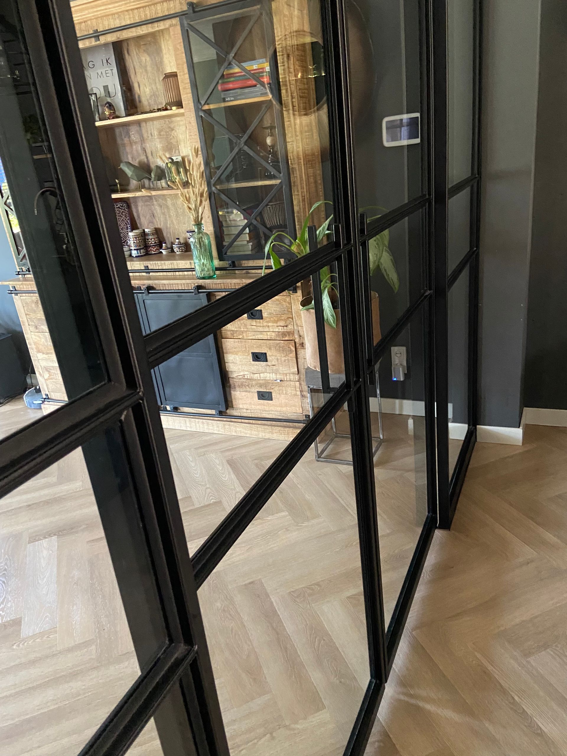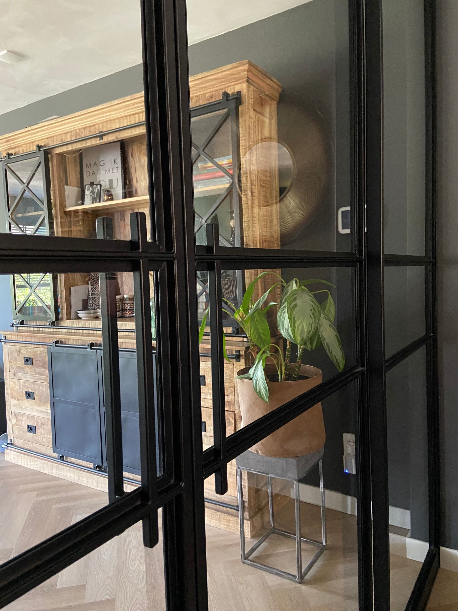 Twee schuifdeuren met twee zijlichten. Een scheiding tussen woonkamer en keuken. Een wand met smal middenvak voor een mooi lijnenspel. Ideaal wanneer de deuren vaak open of juist dicht blijven.