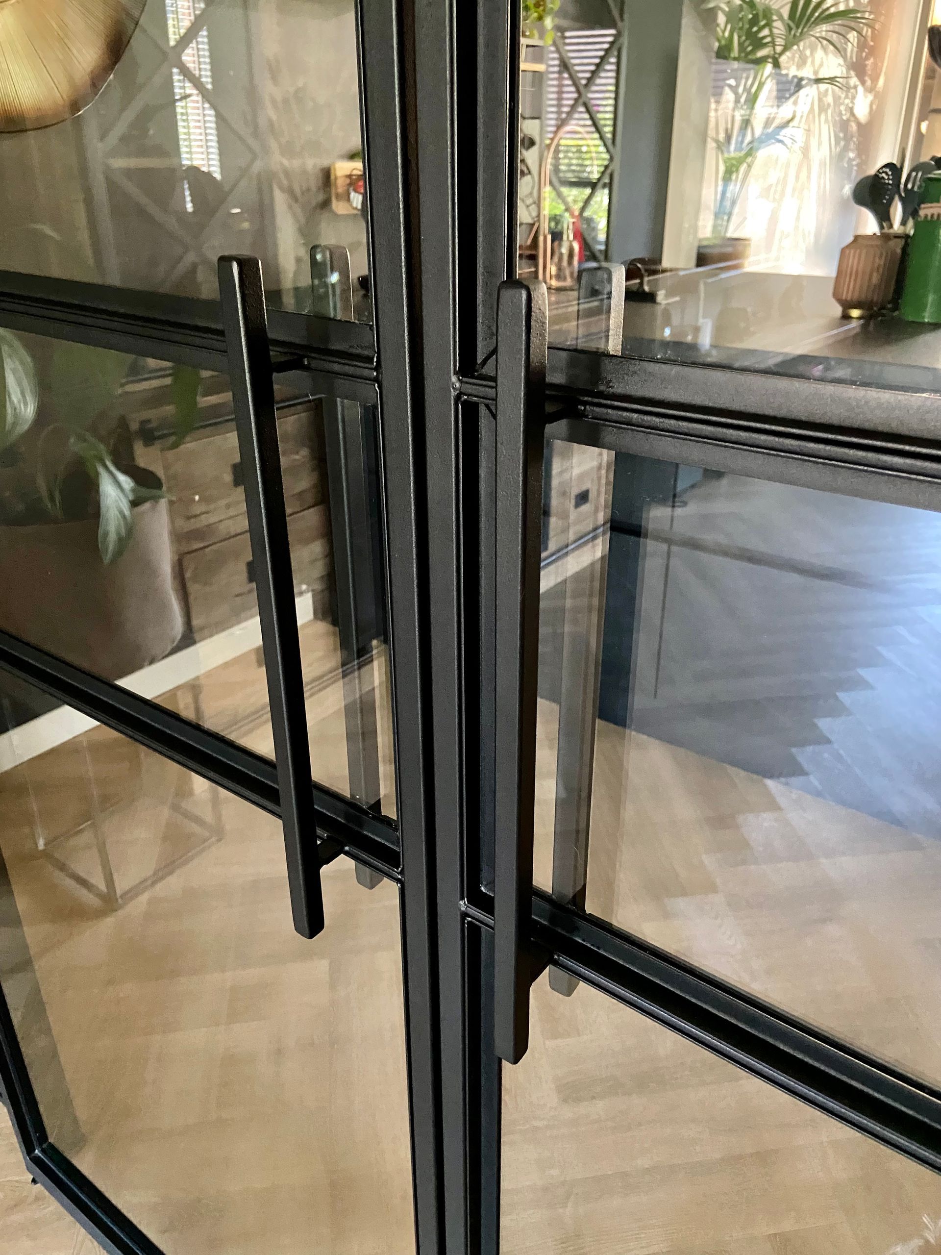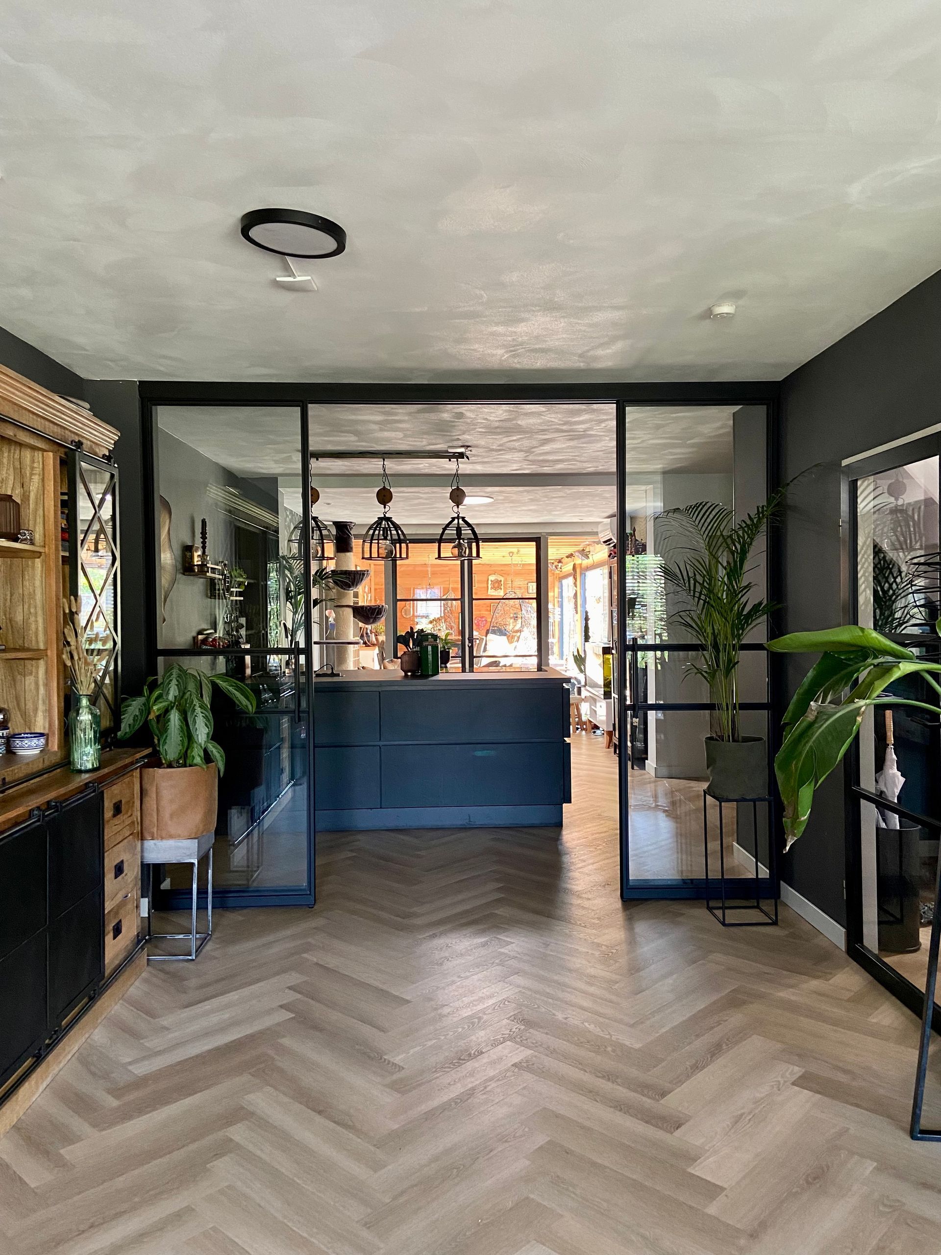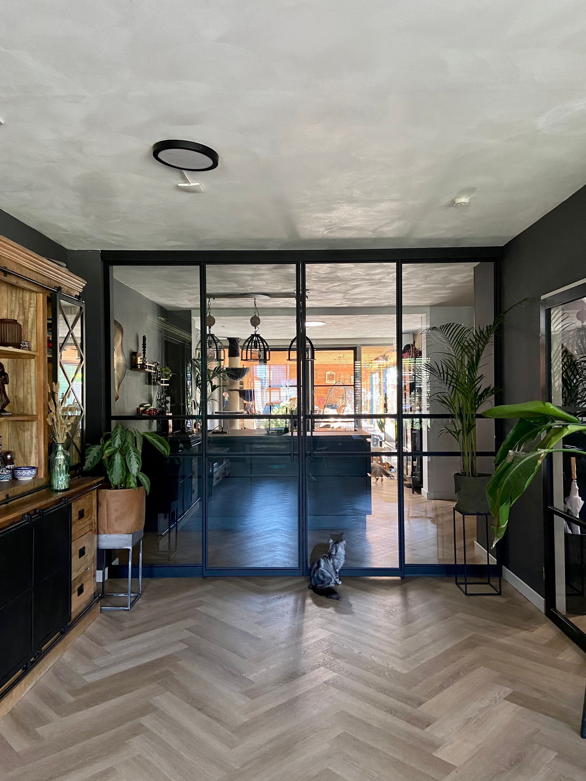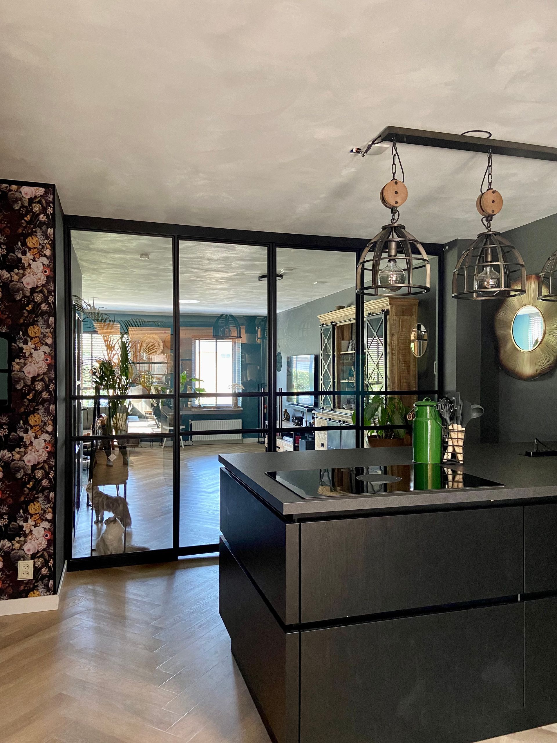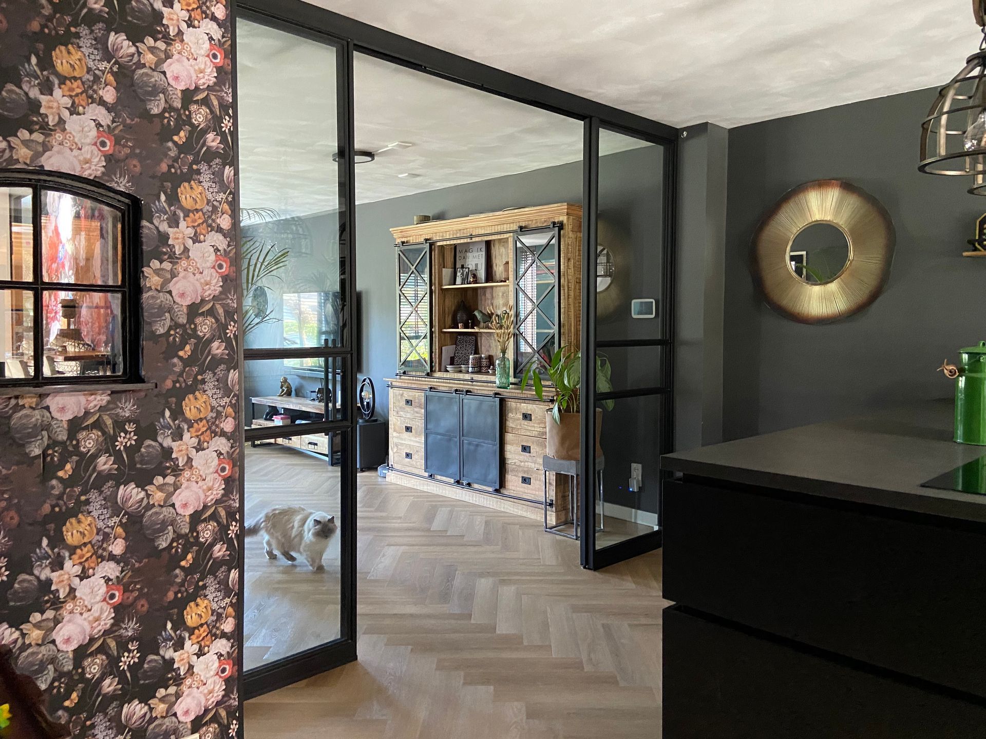 Twee schuifdeuren met twee zijlichten. Een scheiding tussen woonkamer en keuken. Een wand met smal middenvak voor een mooi lijnenspel. Ideaal wanneer de deuren vaak open of juist dicht blijven.