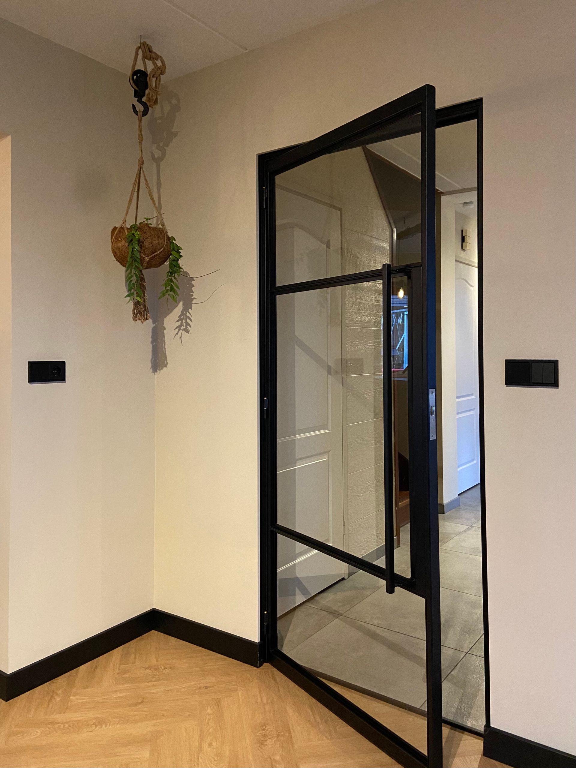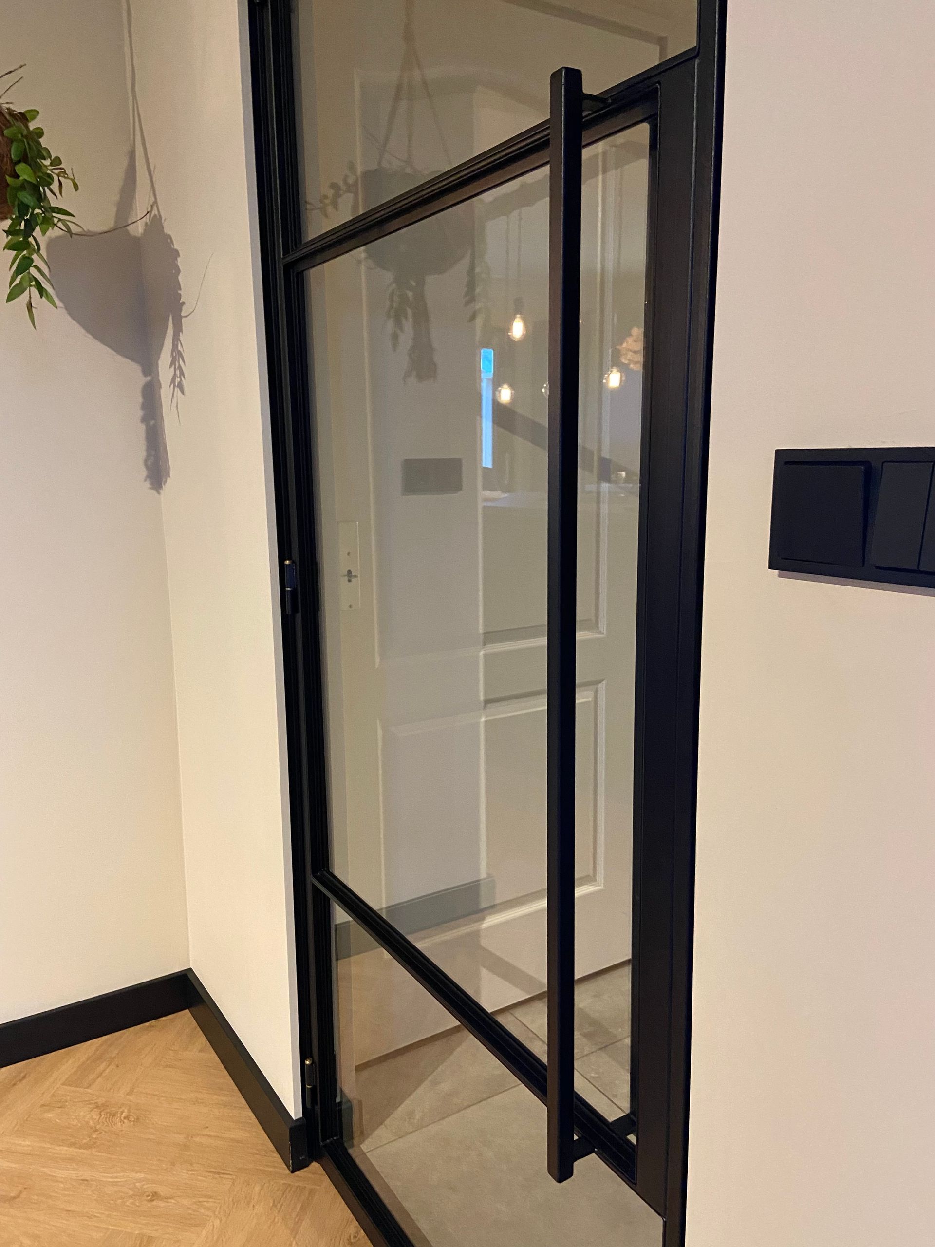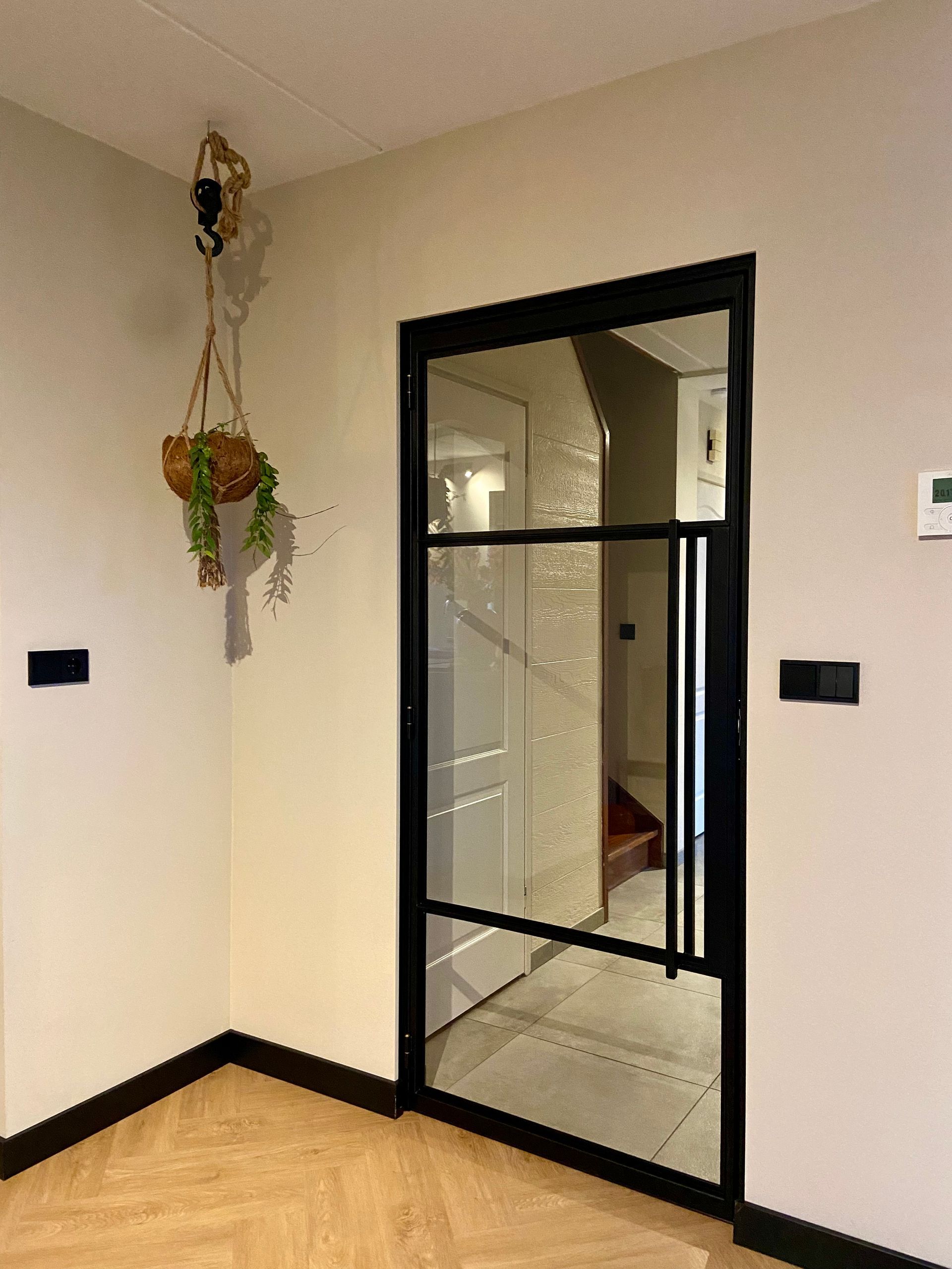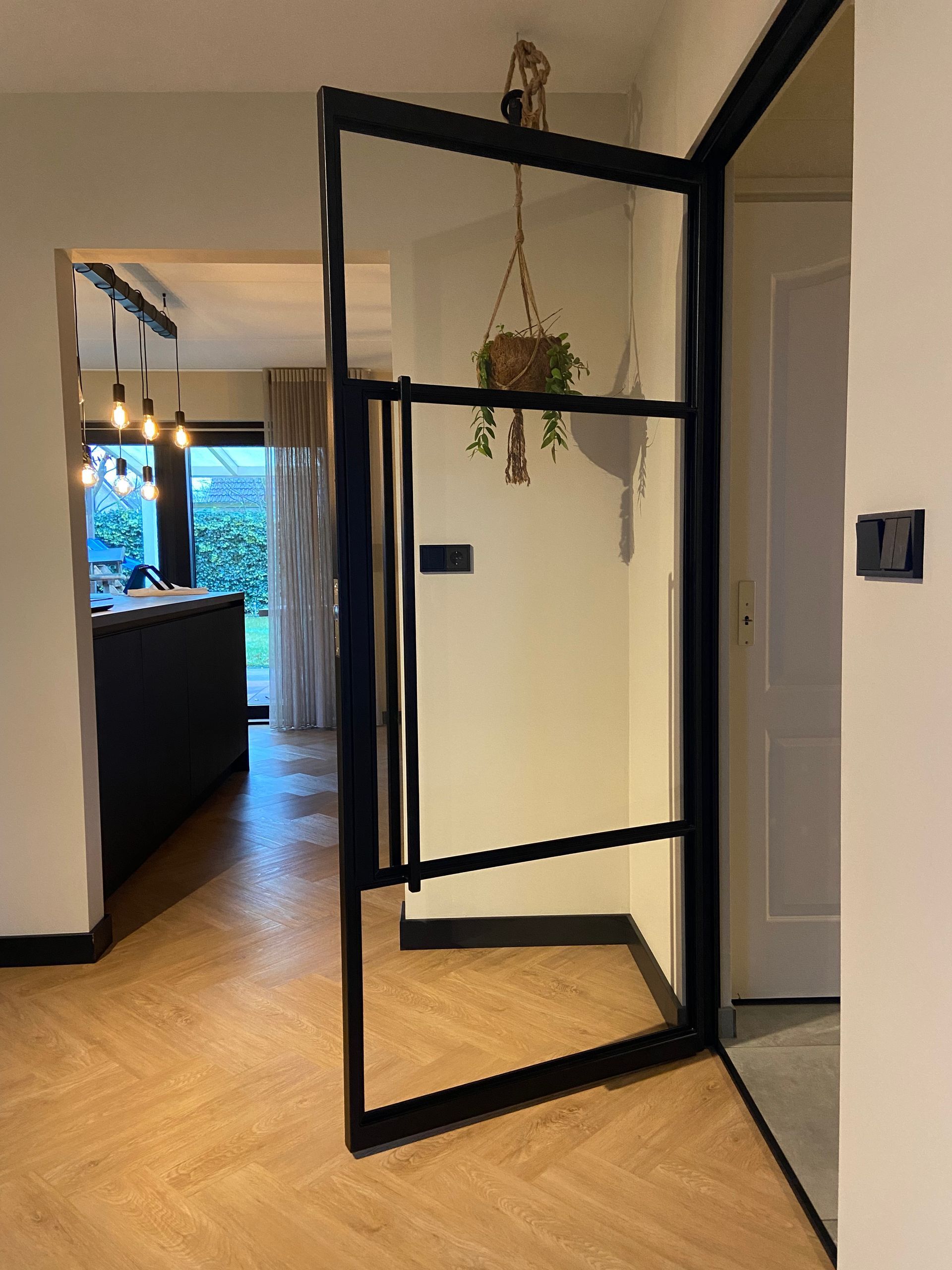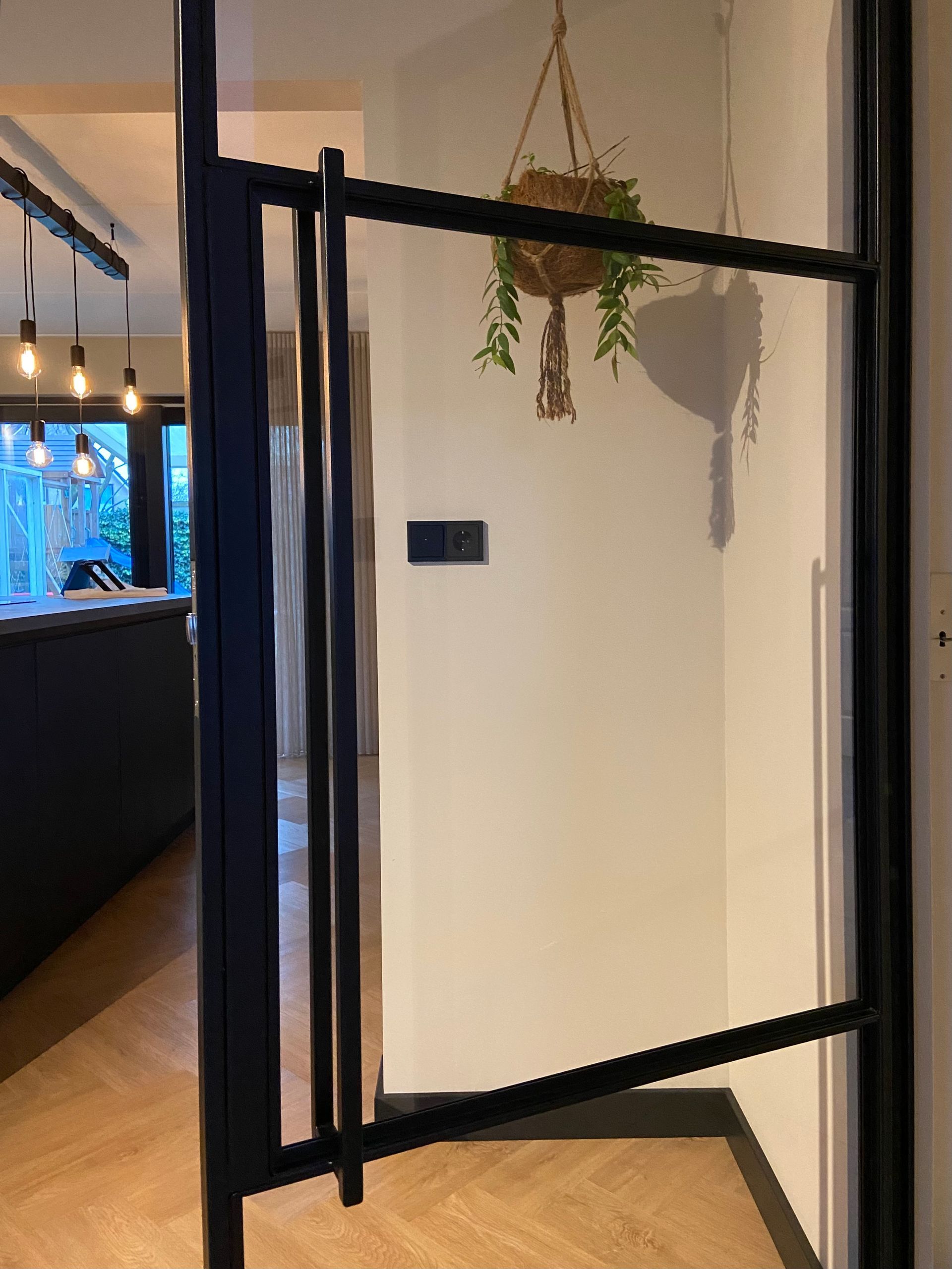 Een zwarte scharnierdeur tussen hal en woonkamer. Een vakverdeling met moderne, rustige uitstraling. Met lange greep en tonrolslot voor een makkelijke doorgang.
