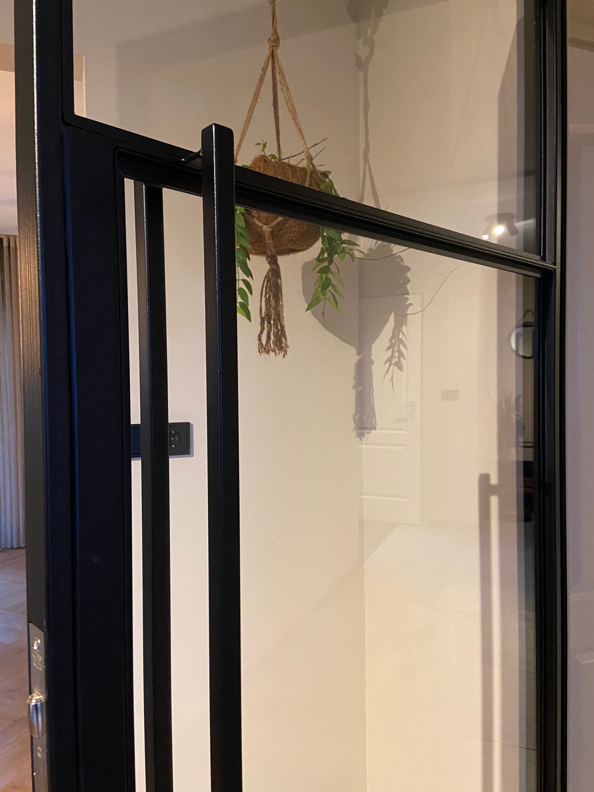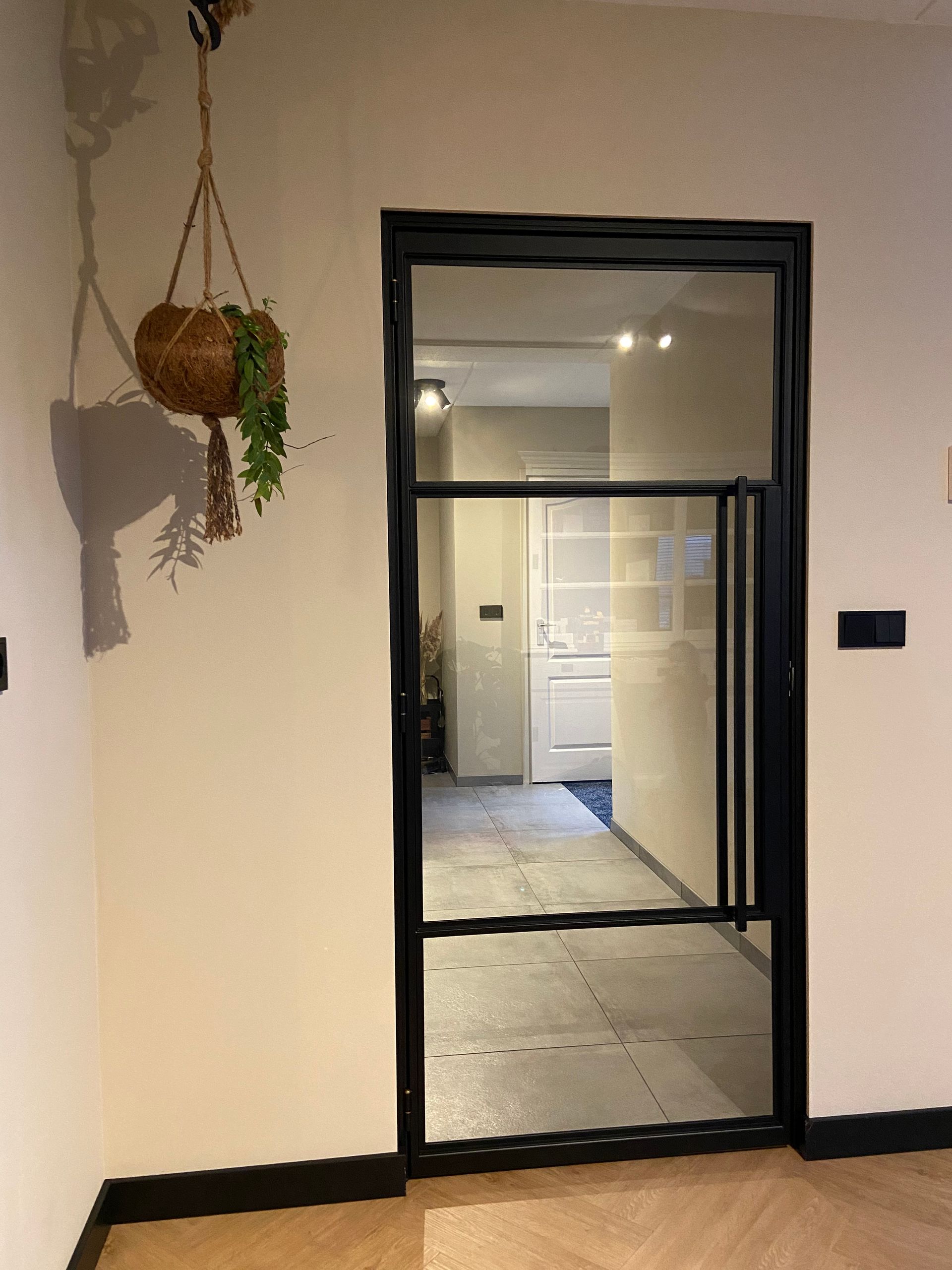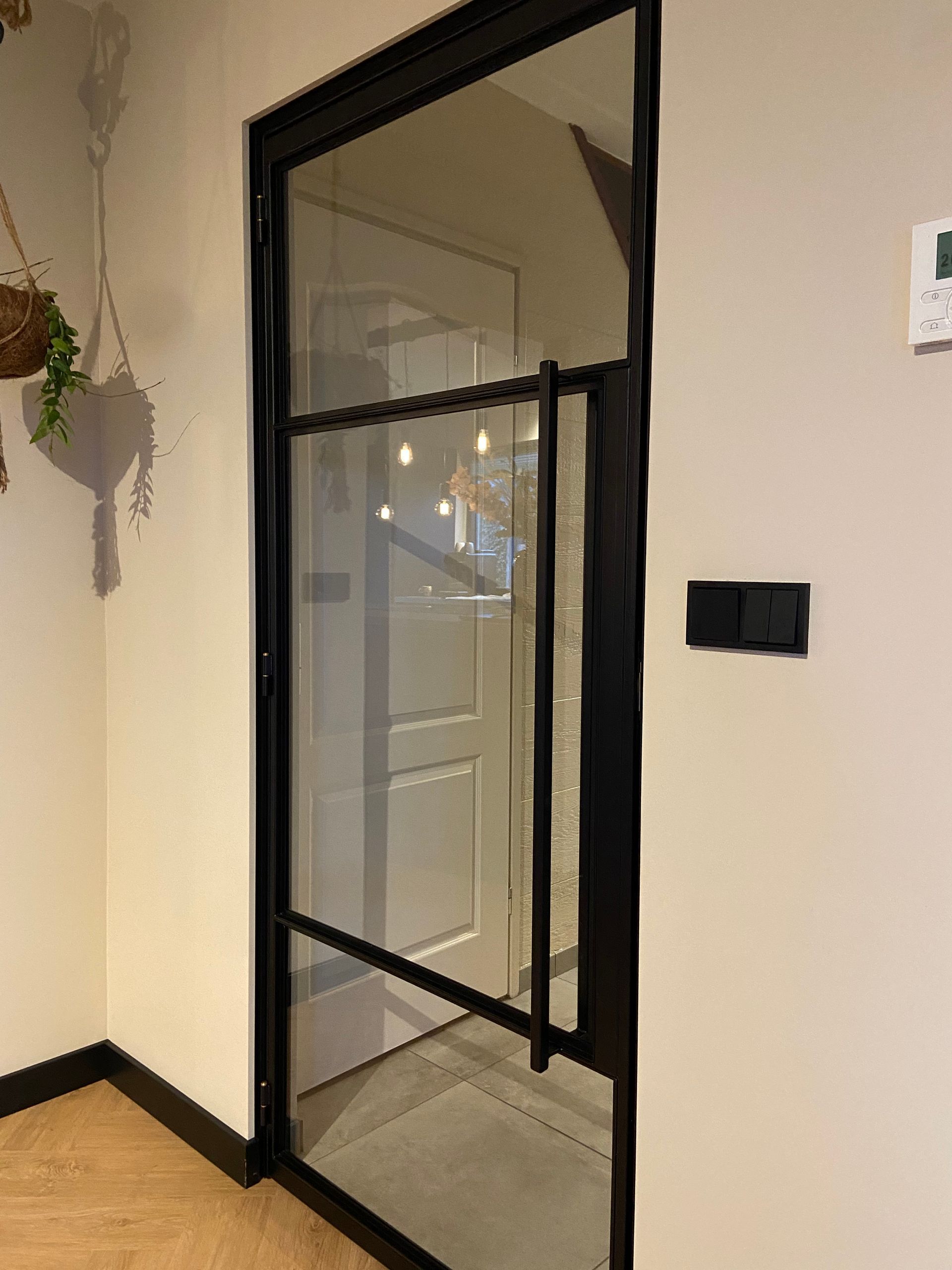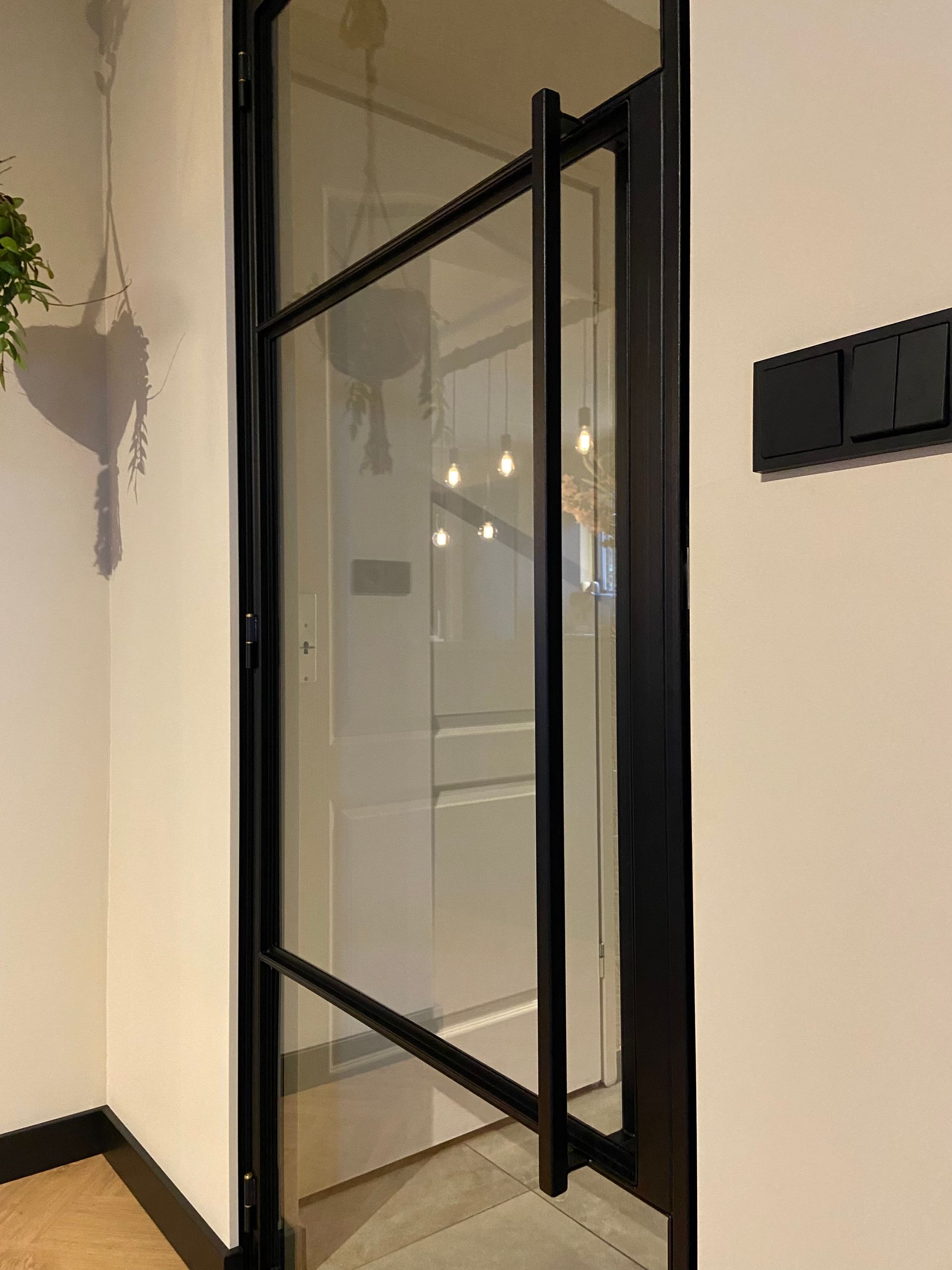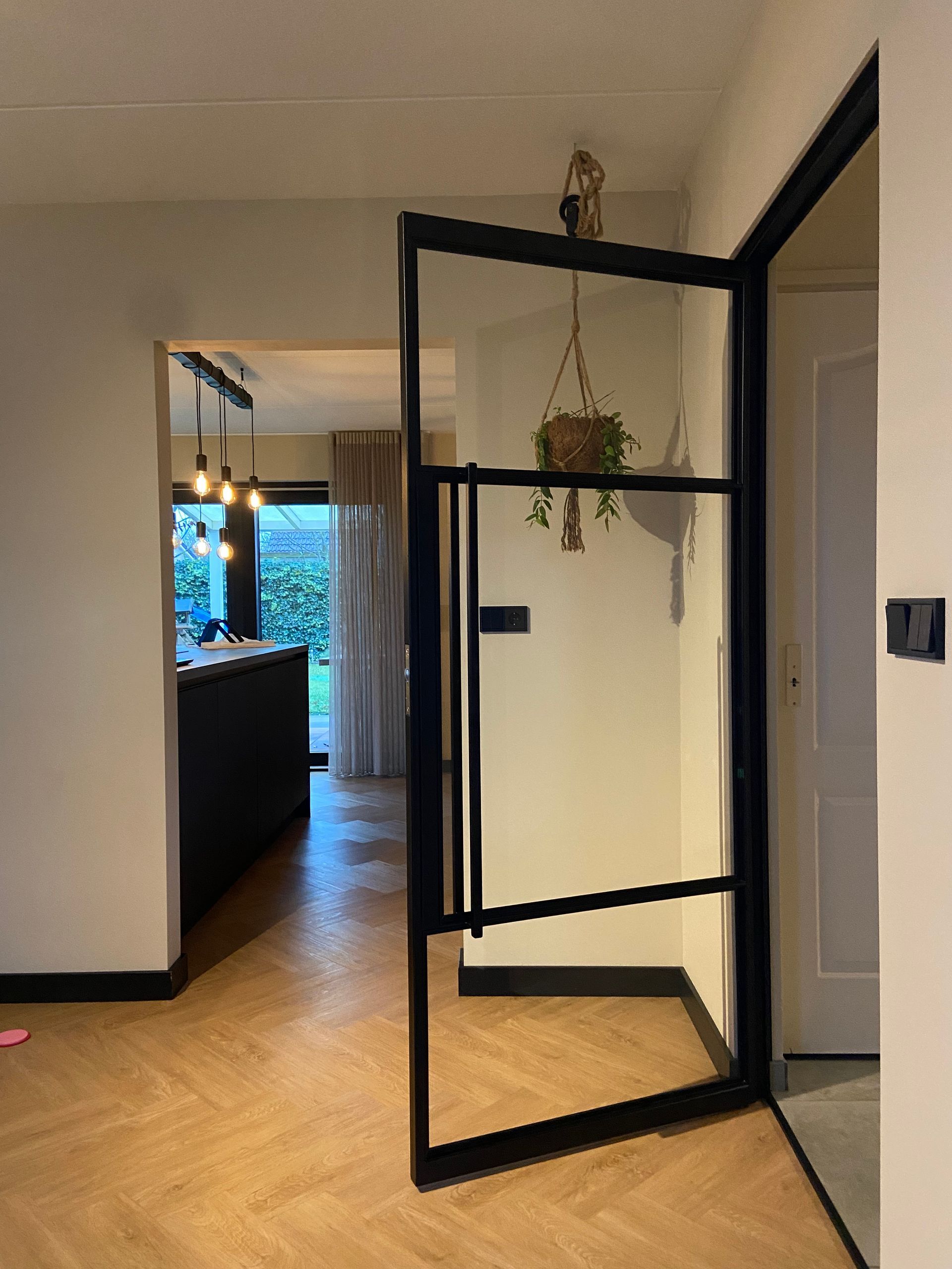 Een zwarte scharnierdeur tussen hal en woonkamer. Een vakverdeling met moderne, rustige uitstraling. Met lange greep en tonrolslot voor een makkelijke doorgang.