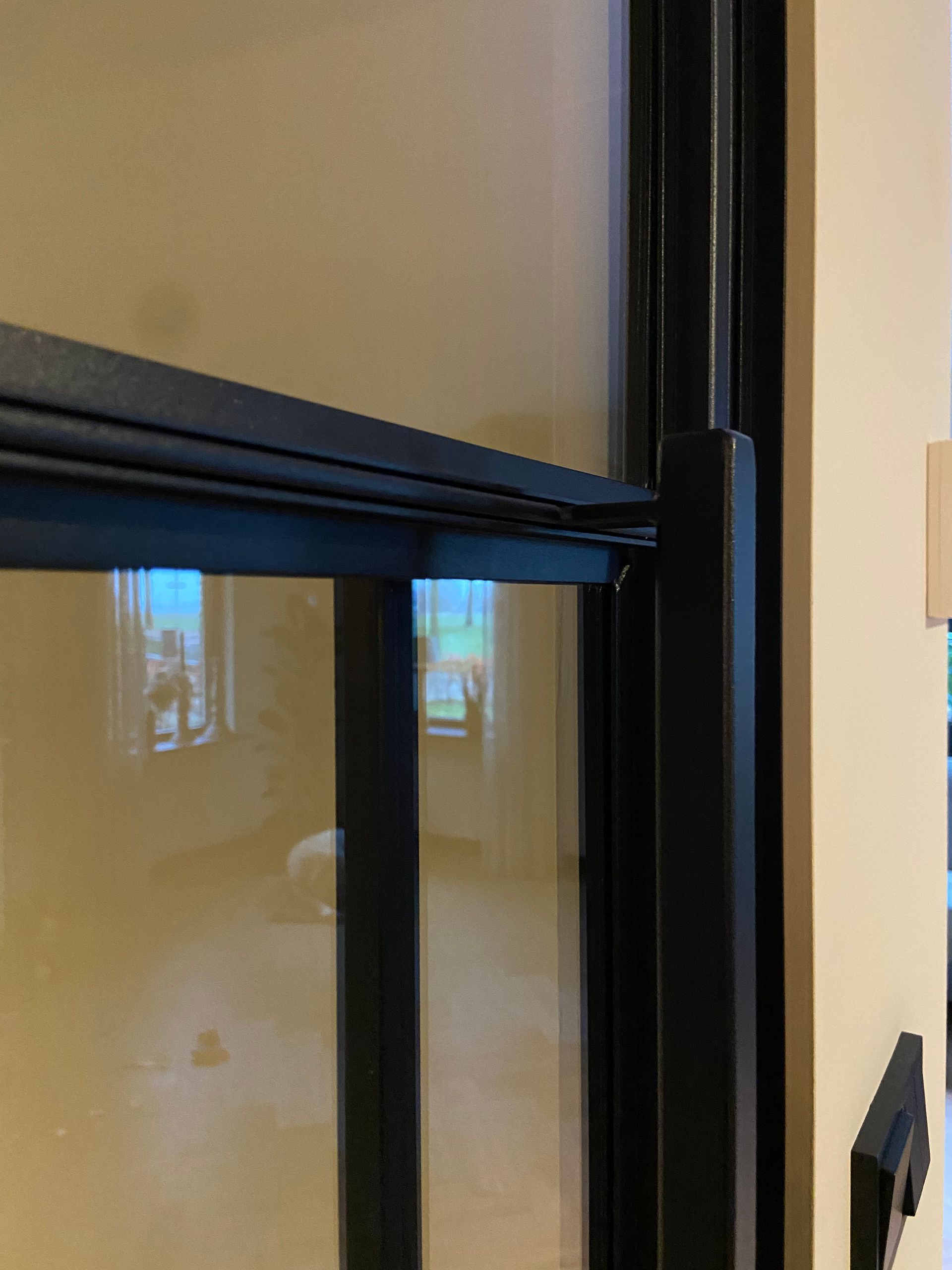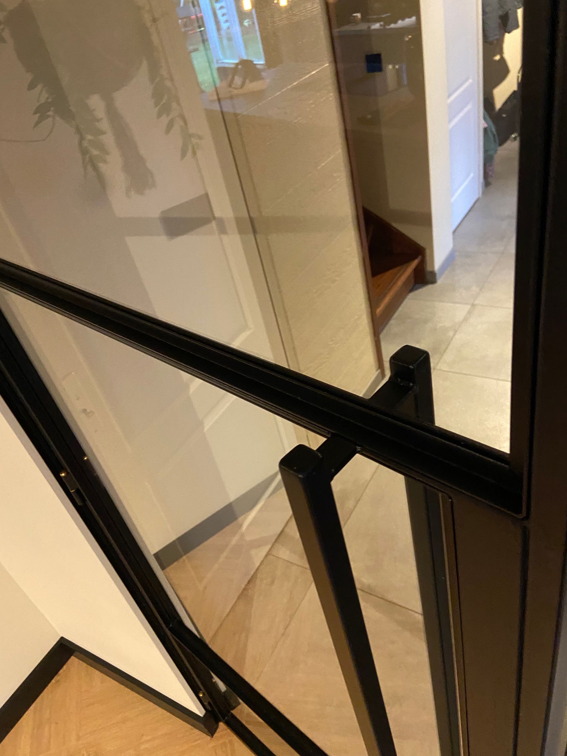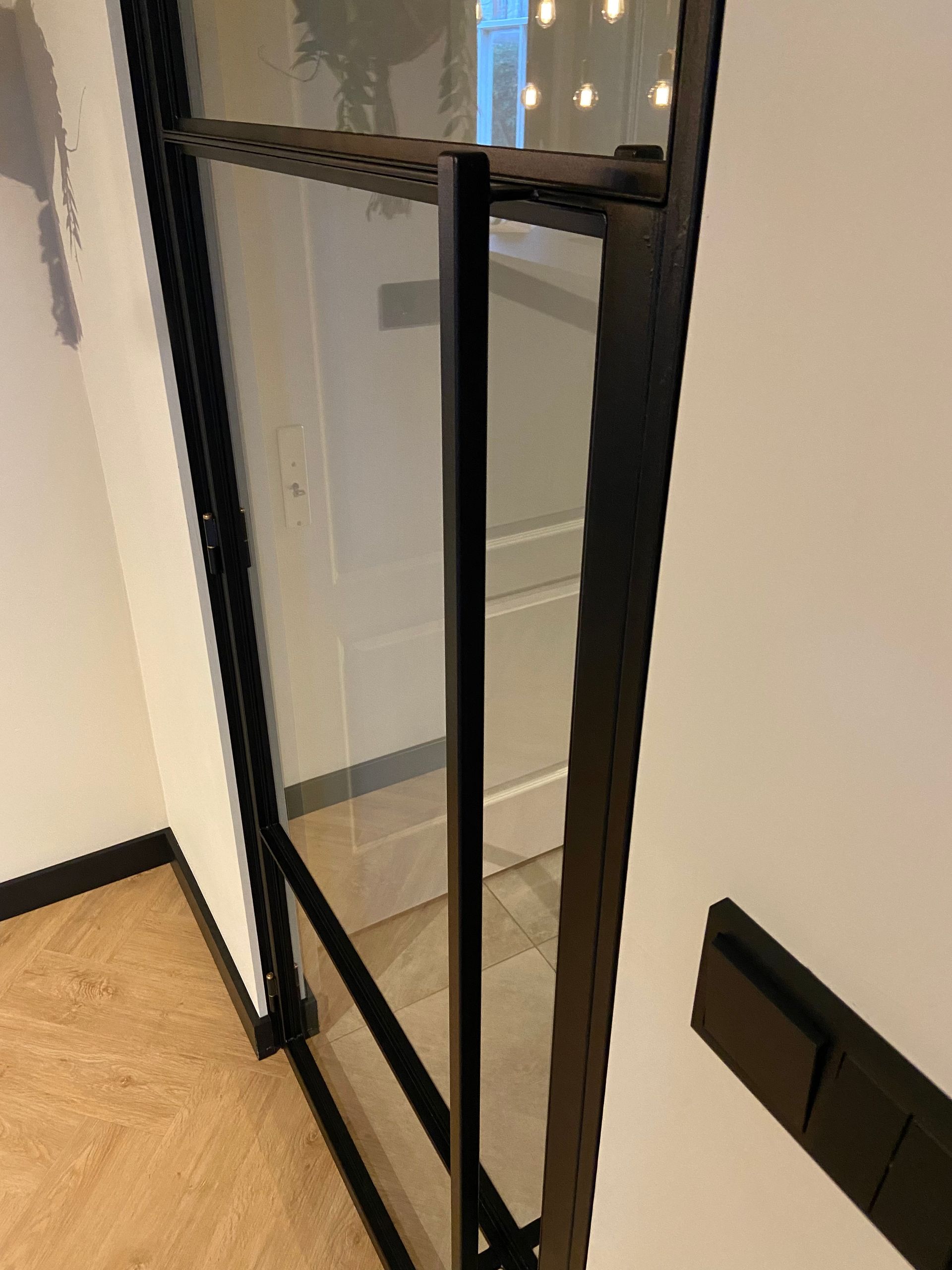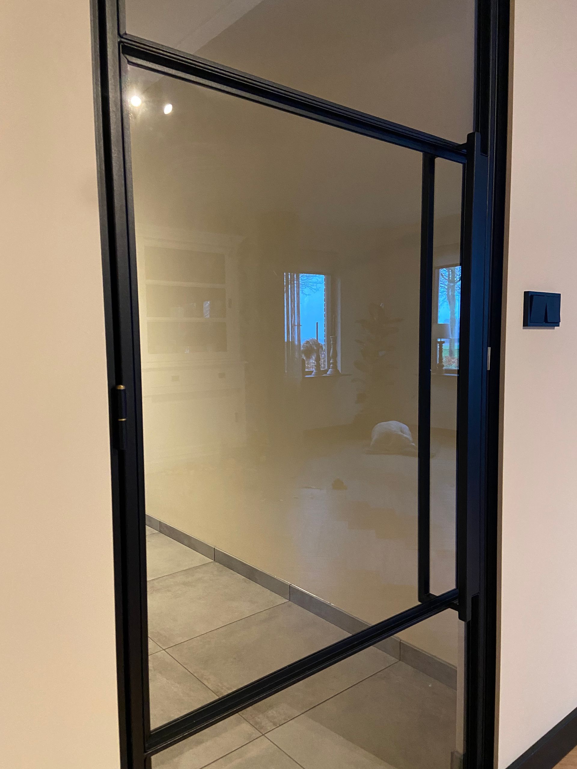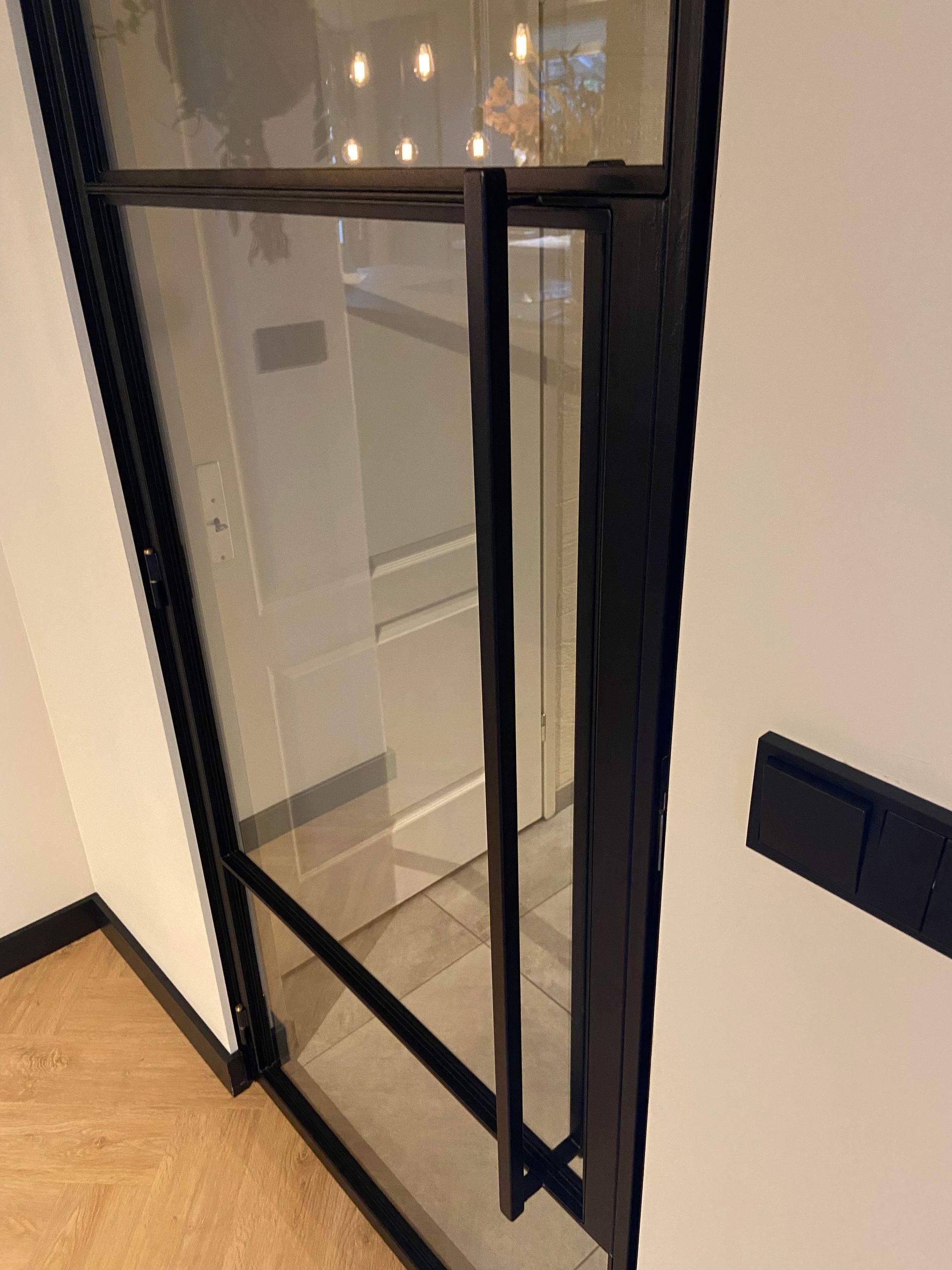 Een zwarte scharnierdeur tussen hal en woonkamer. Een vakverdeling met moderne, rustige uitstraling. Met lange greep en tonrolslot voor een makkelijke doorgang.