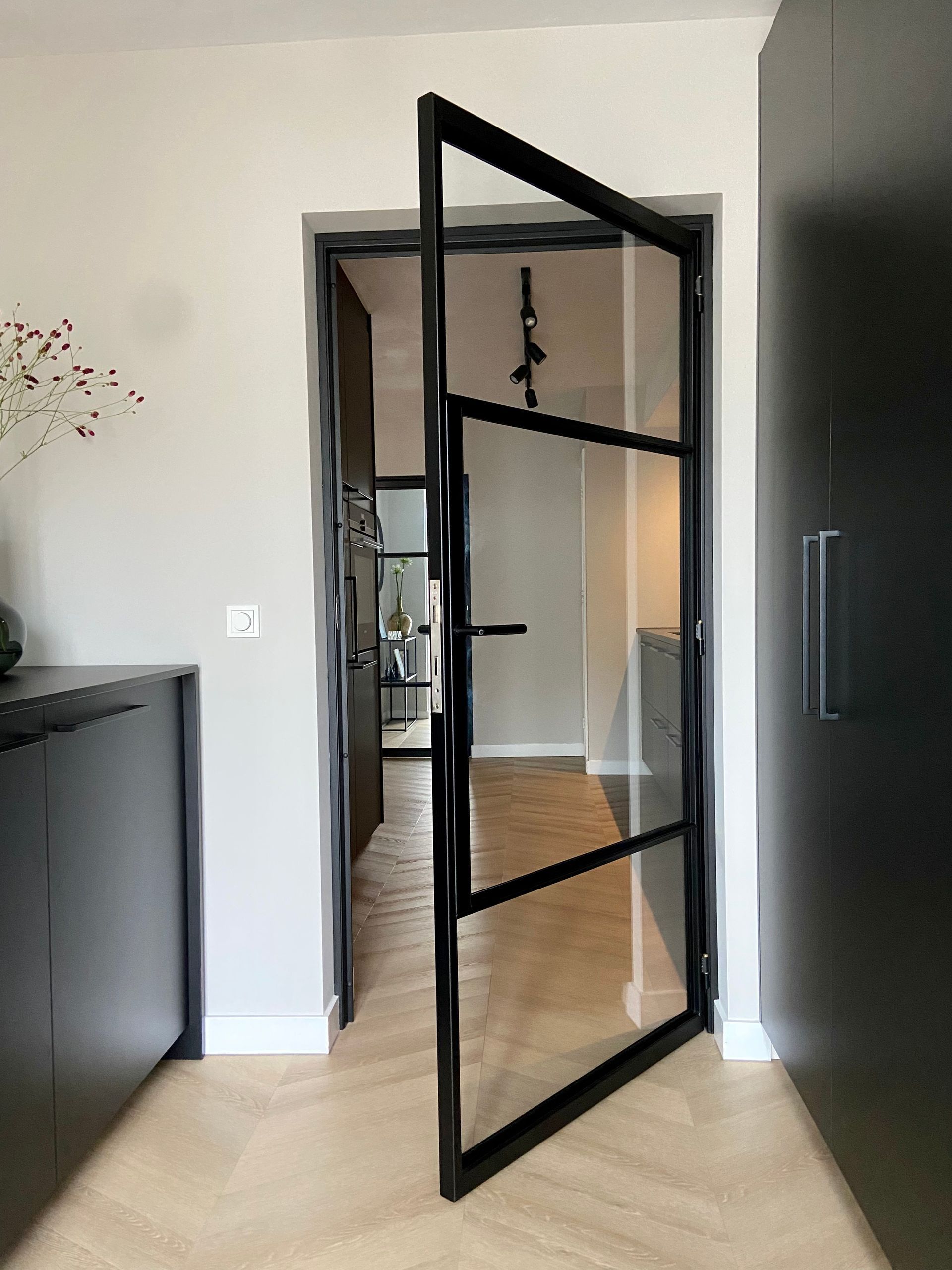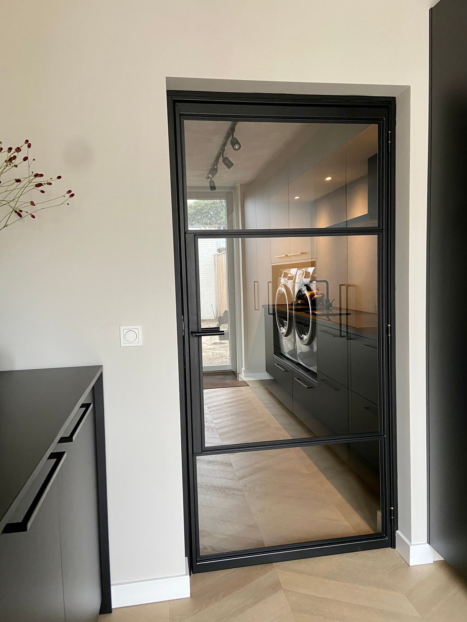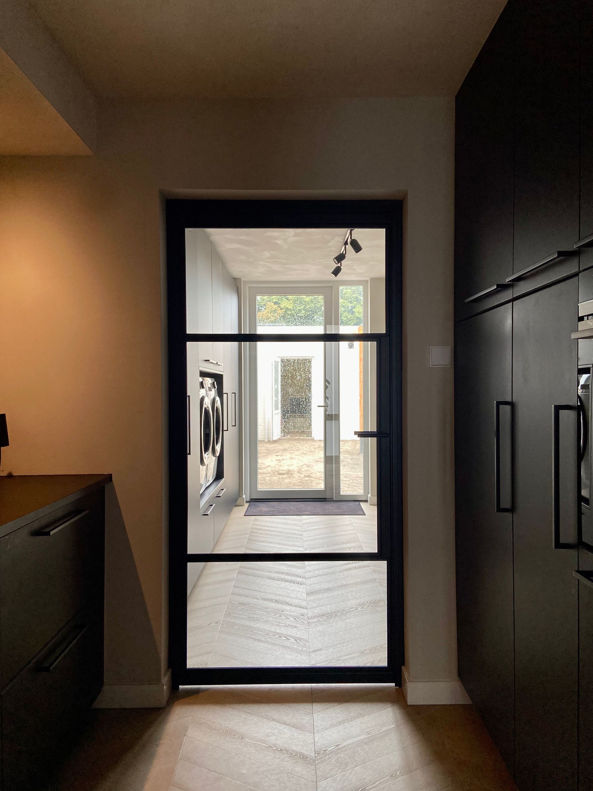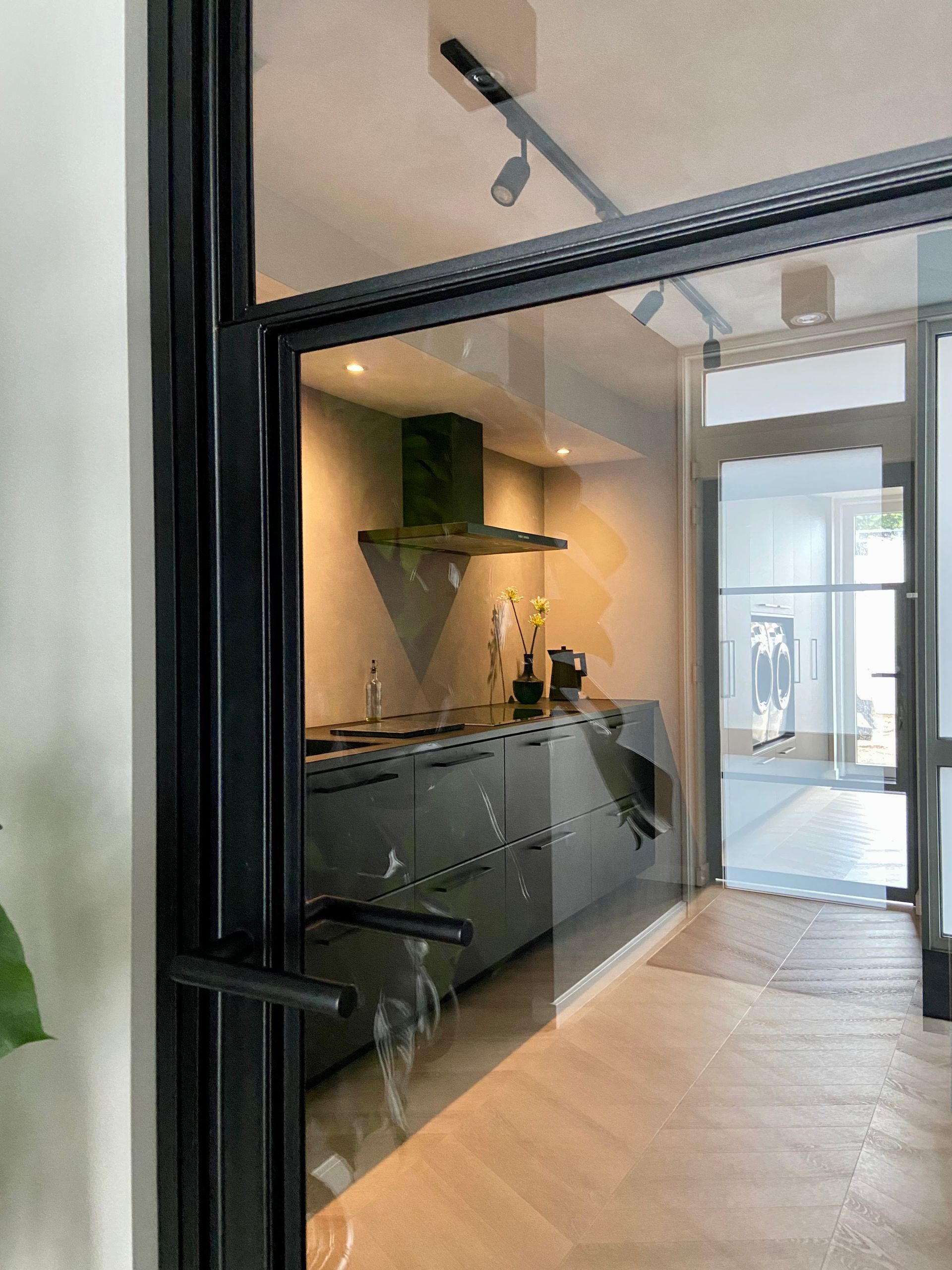 Twee scharnierdeuren in één zichtslijn. Aan beide kanten van de keuken een stalen deur voor extra licht en een mooi open geheel. Met een moderne, subtiele vakverdeling.