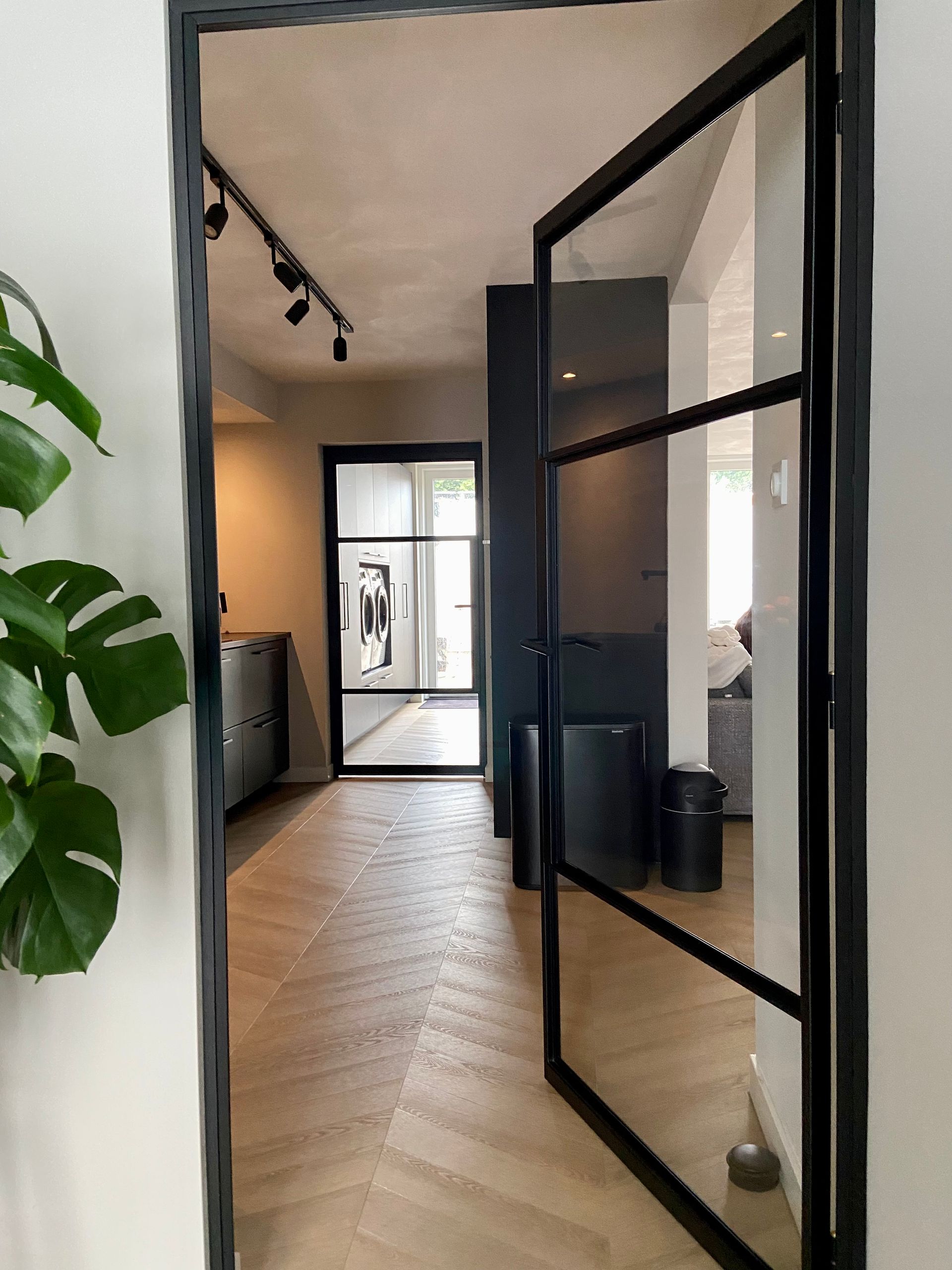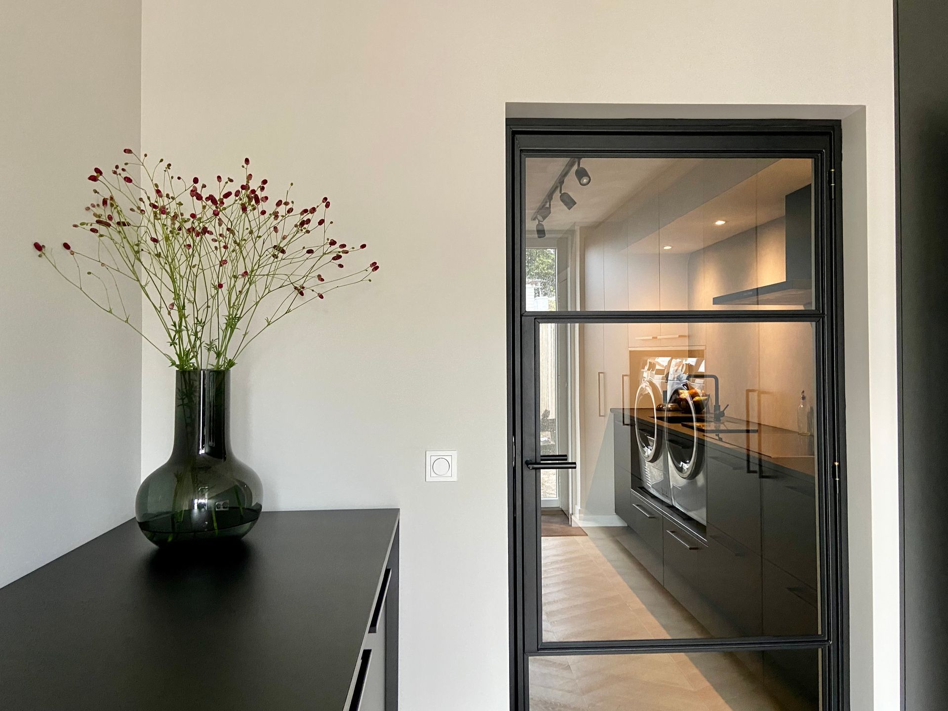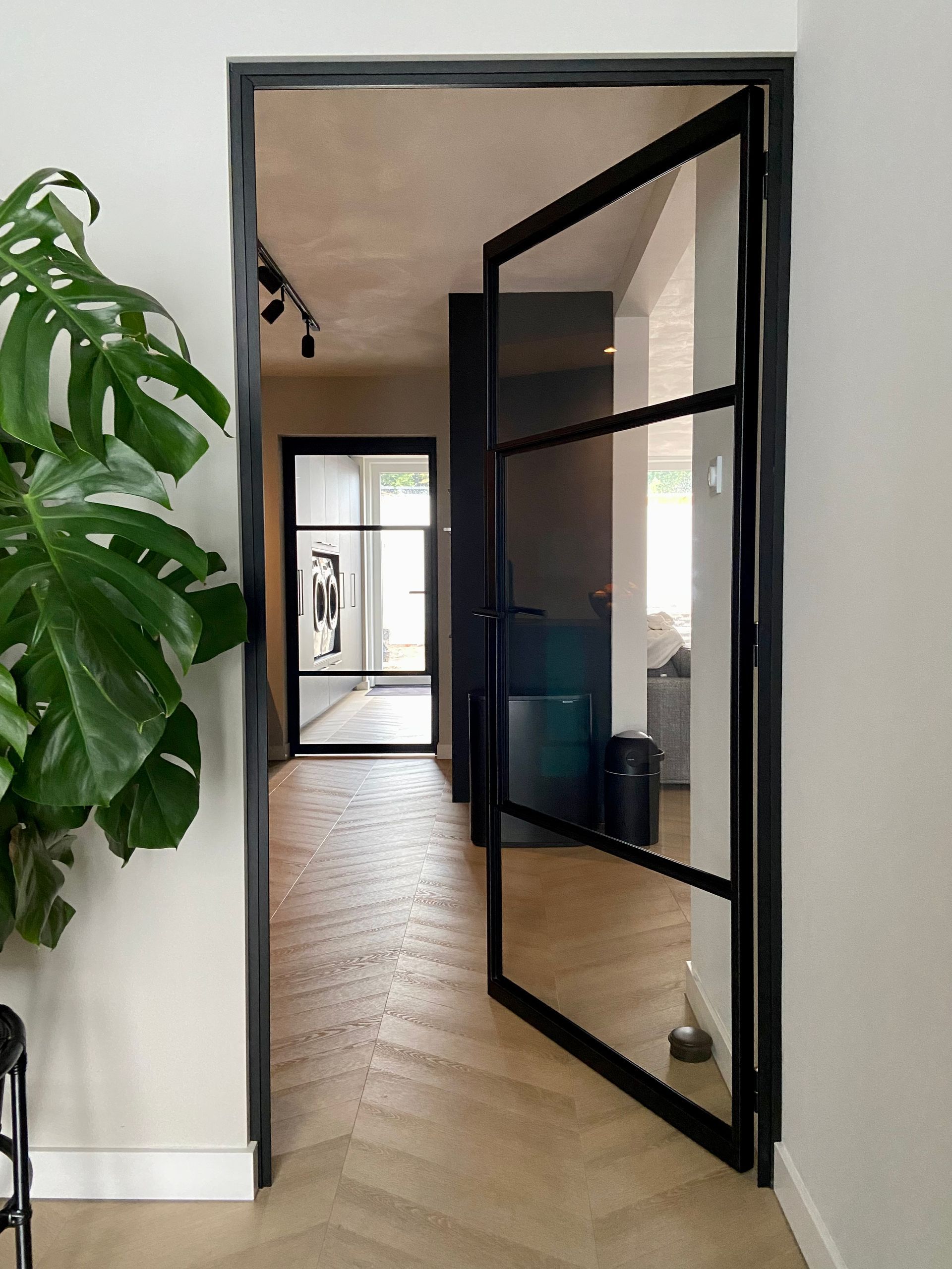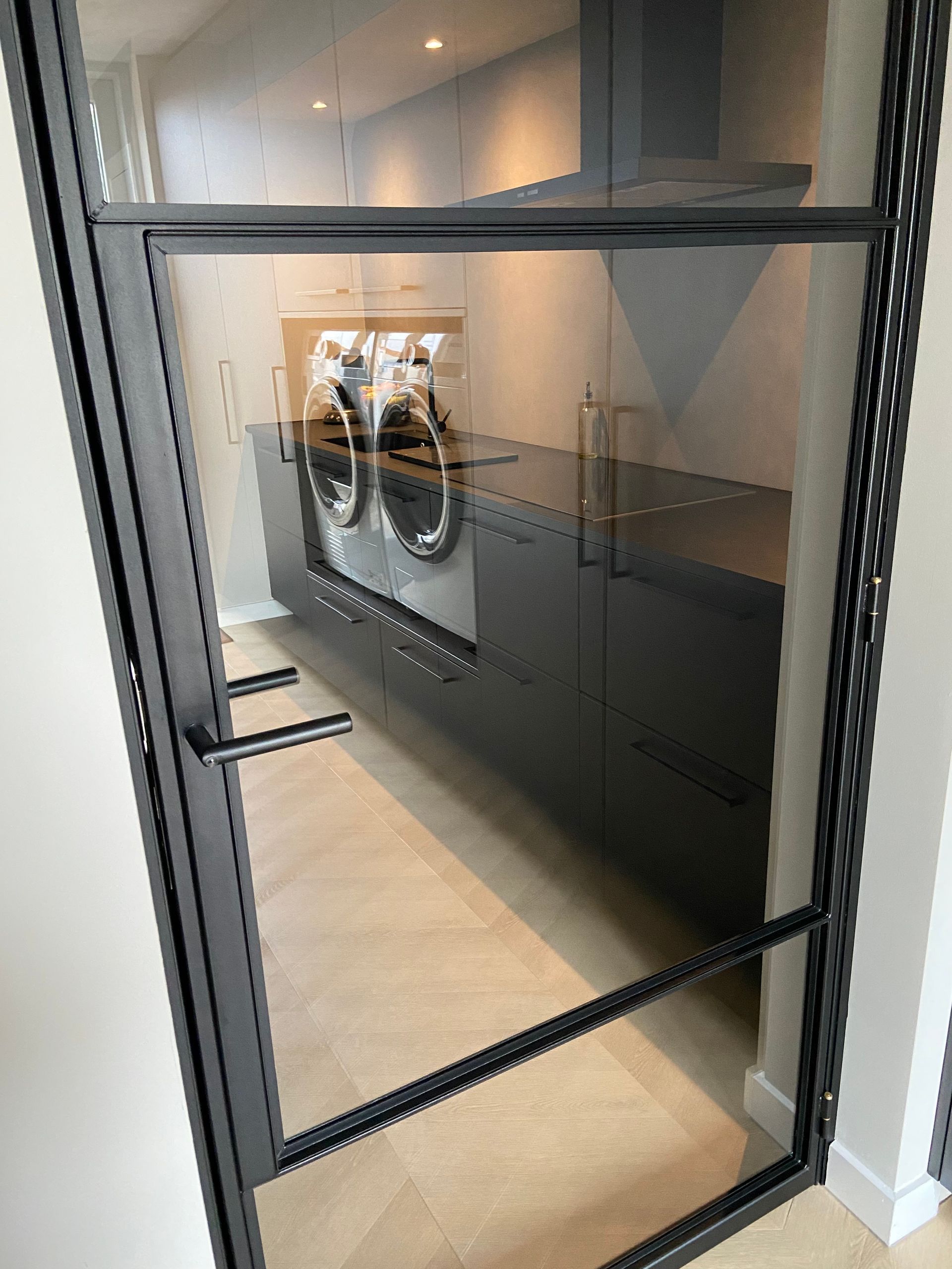 Twee scharnierdeuren in één zichtslijn. Aan beide kanten van de keuken een stalen deur voor extra licht en een mooi open geheel. Met een moderne, subtiele vakverdeling.