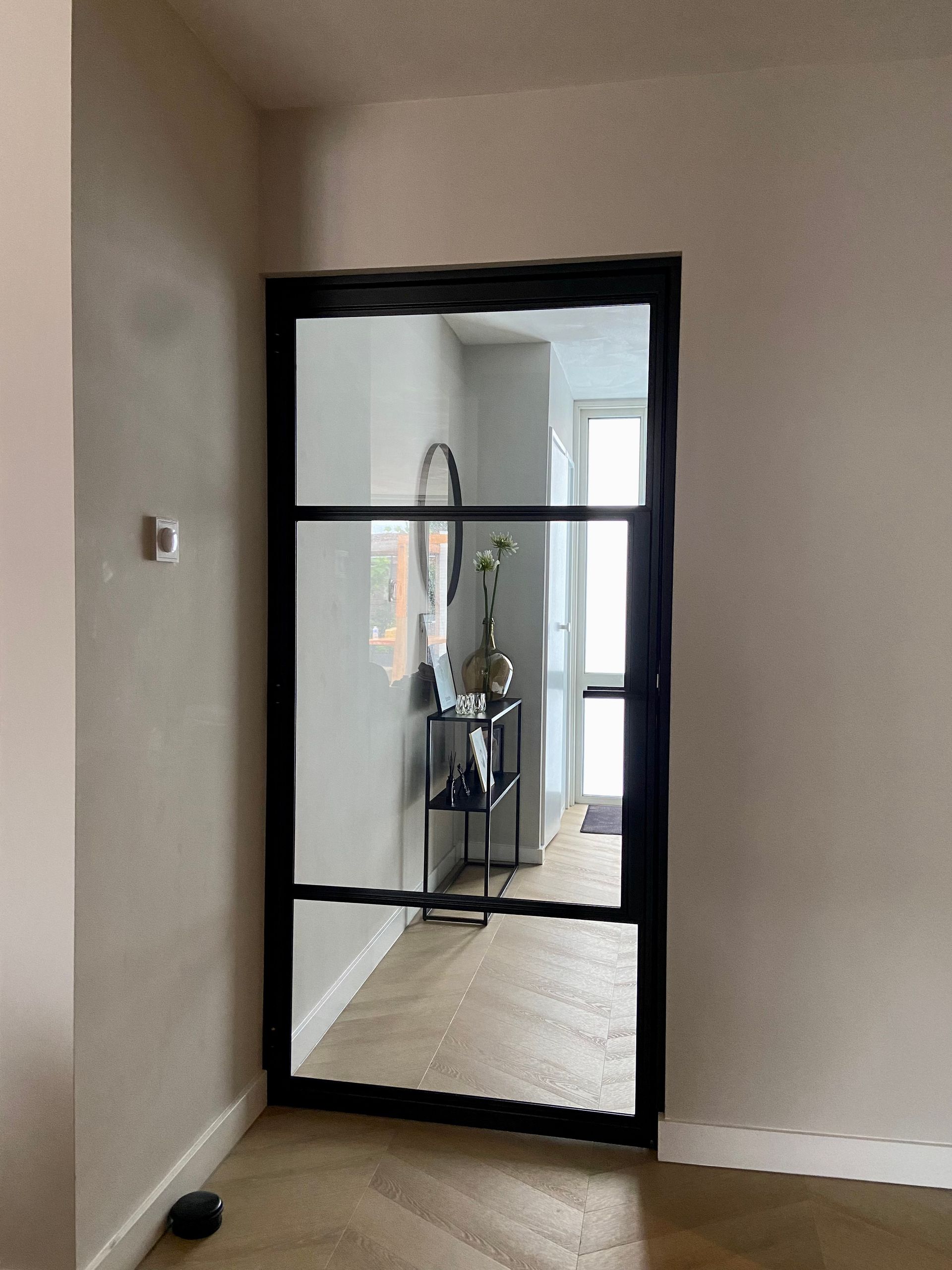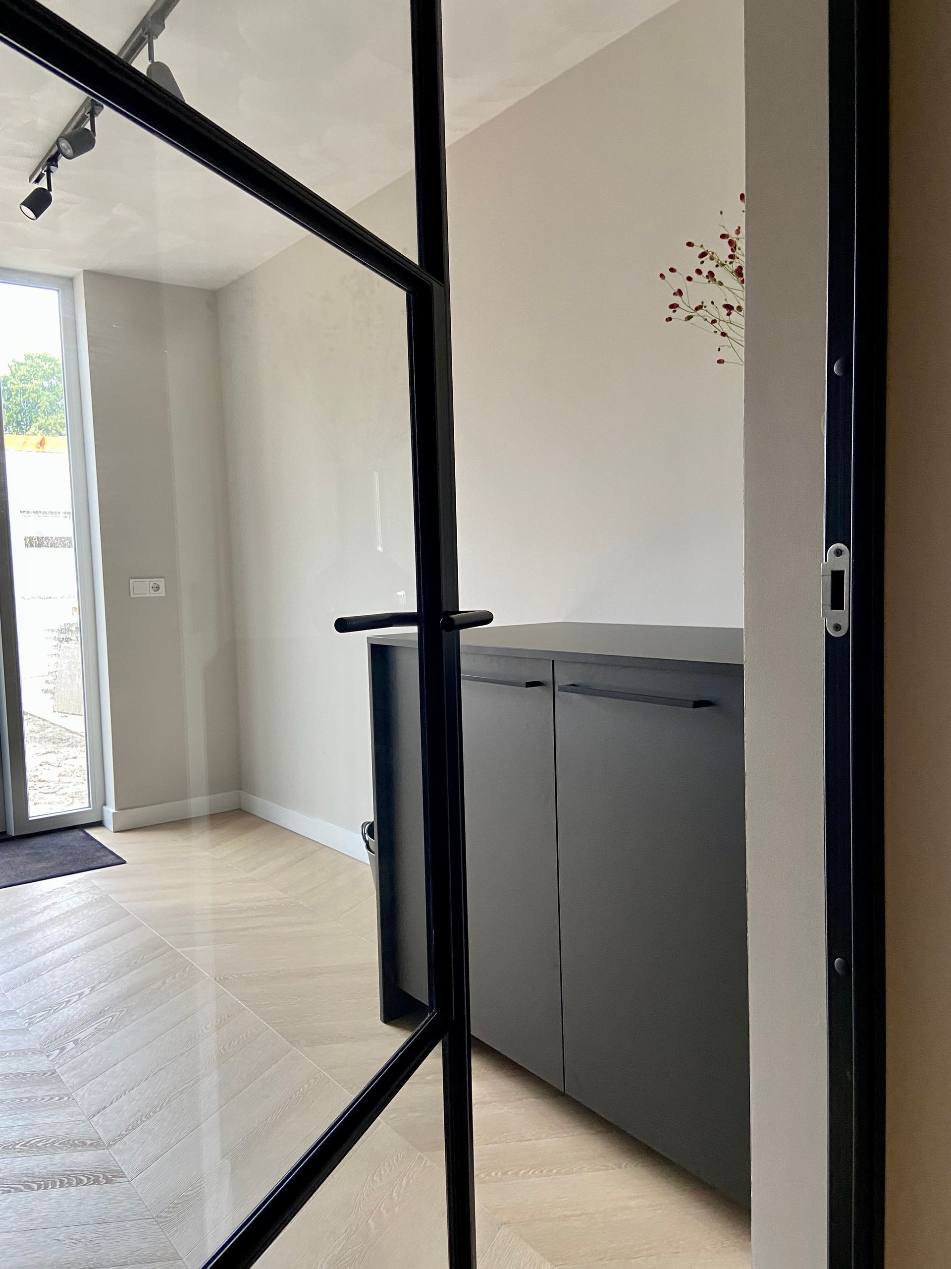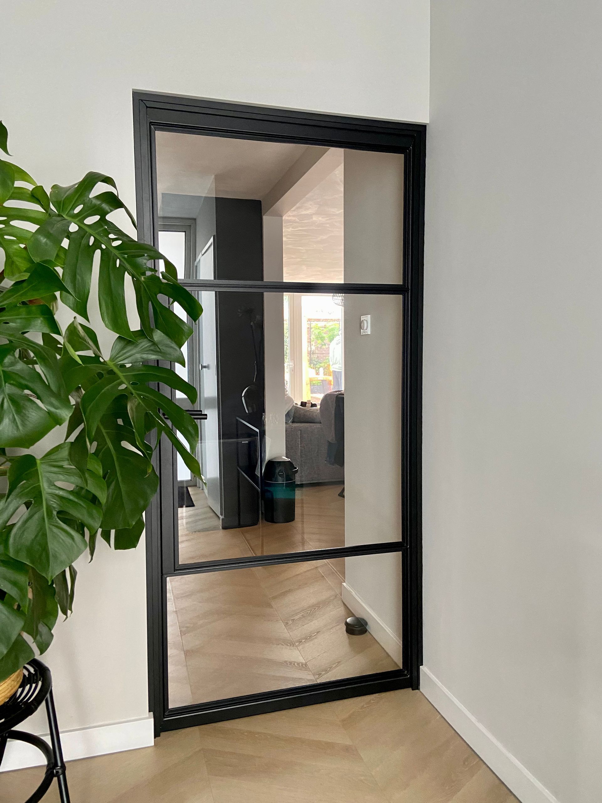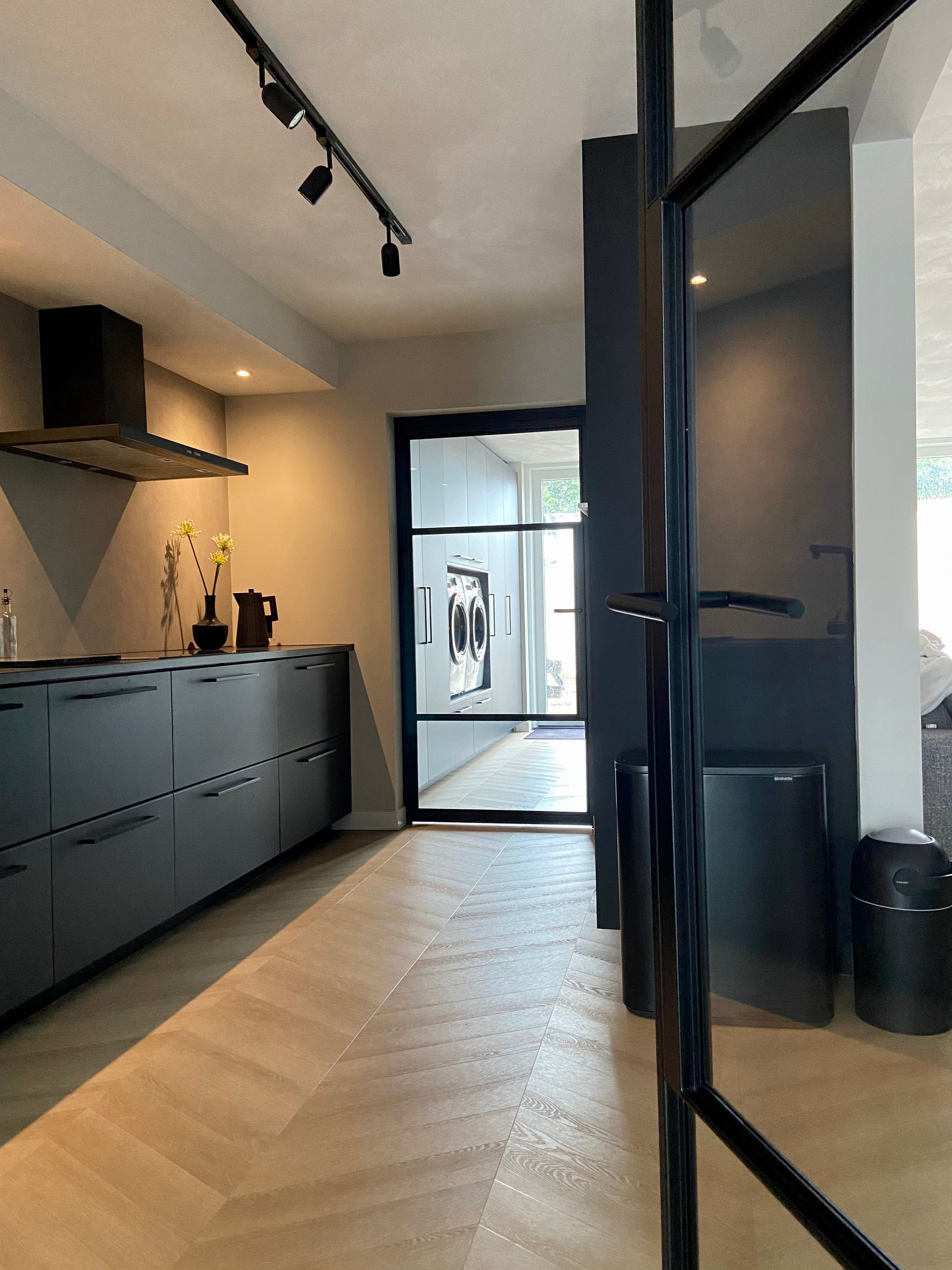 Twee scharnierdeuren in één zichtslijn. Aan beide kanten van de keuken een stalen deur voor extra licht en een mooi open geheel. Met een moderne, subtiele vakverdeling.