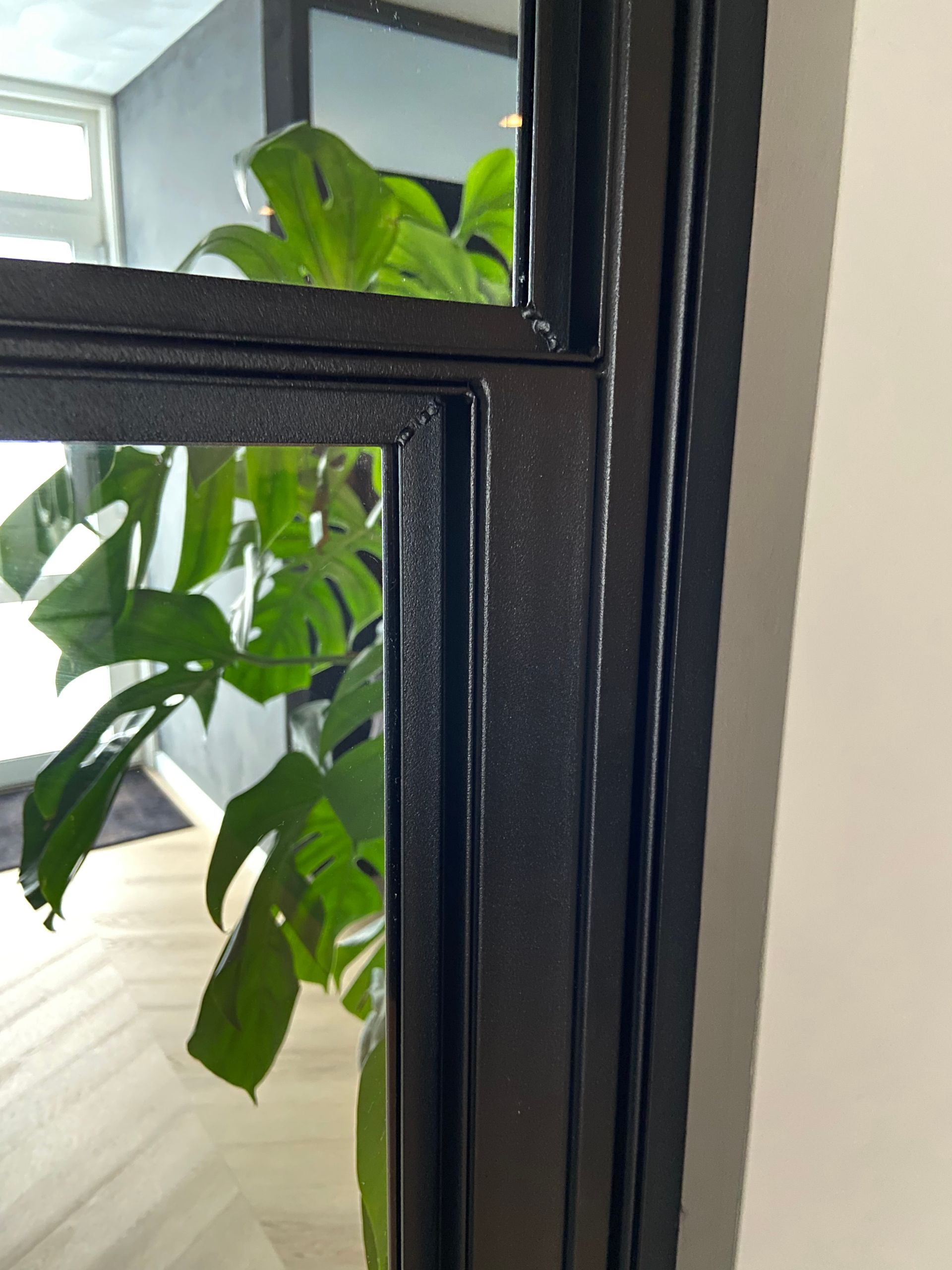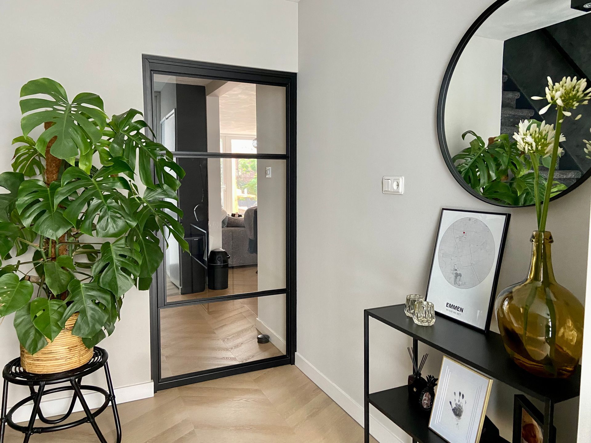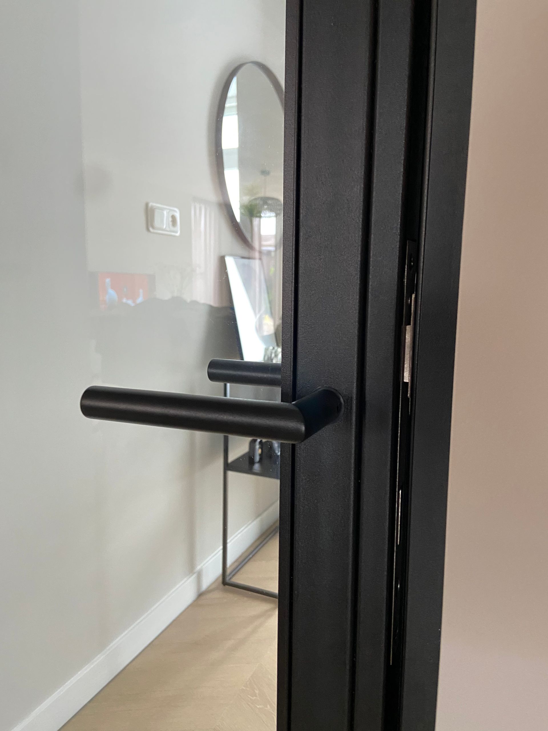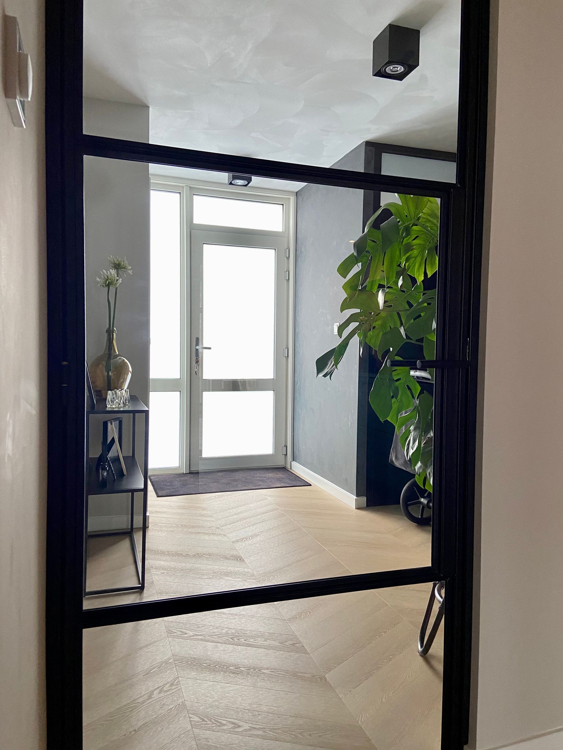 Twee scharnierdeuren in één zichtslijn. Aan beide kanten van de keuken een stalen deur voor extra licht en een mooi open geheel. Met een moderne, subtiele vakverdeling.