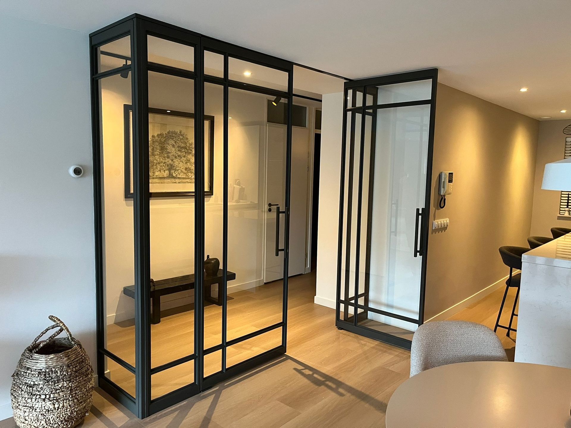 Een stalen wand met staatsdeuren en hoek. Voor een uniek en ruimtelijk effect. Met klassieke vakverdeling in een modern jasje.