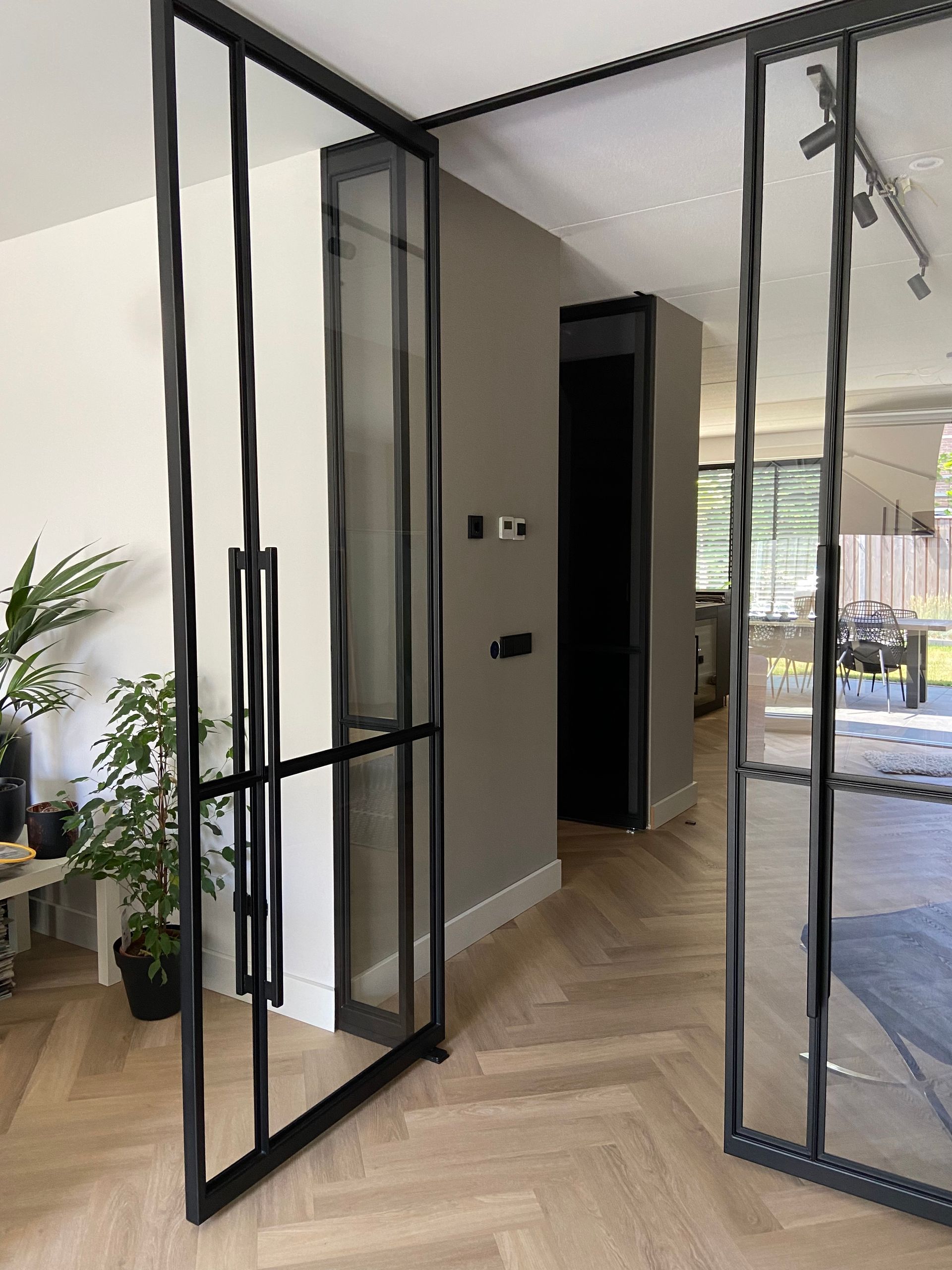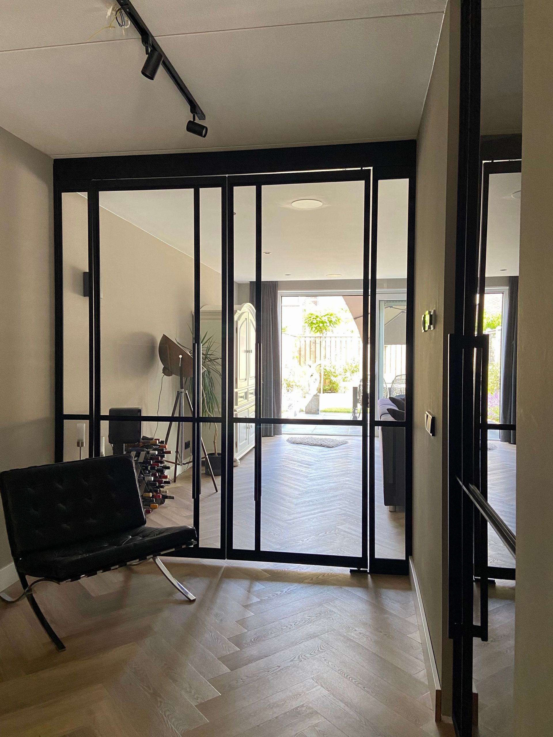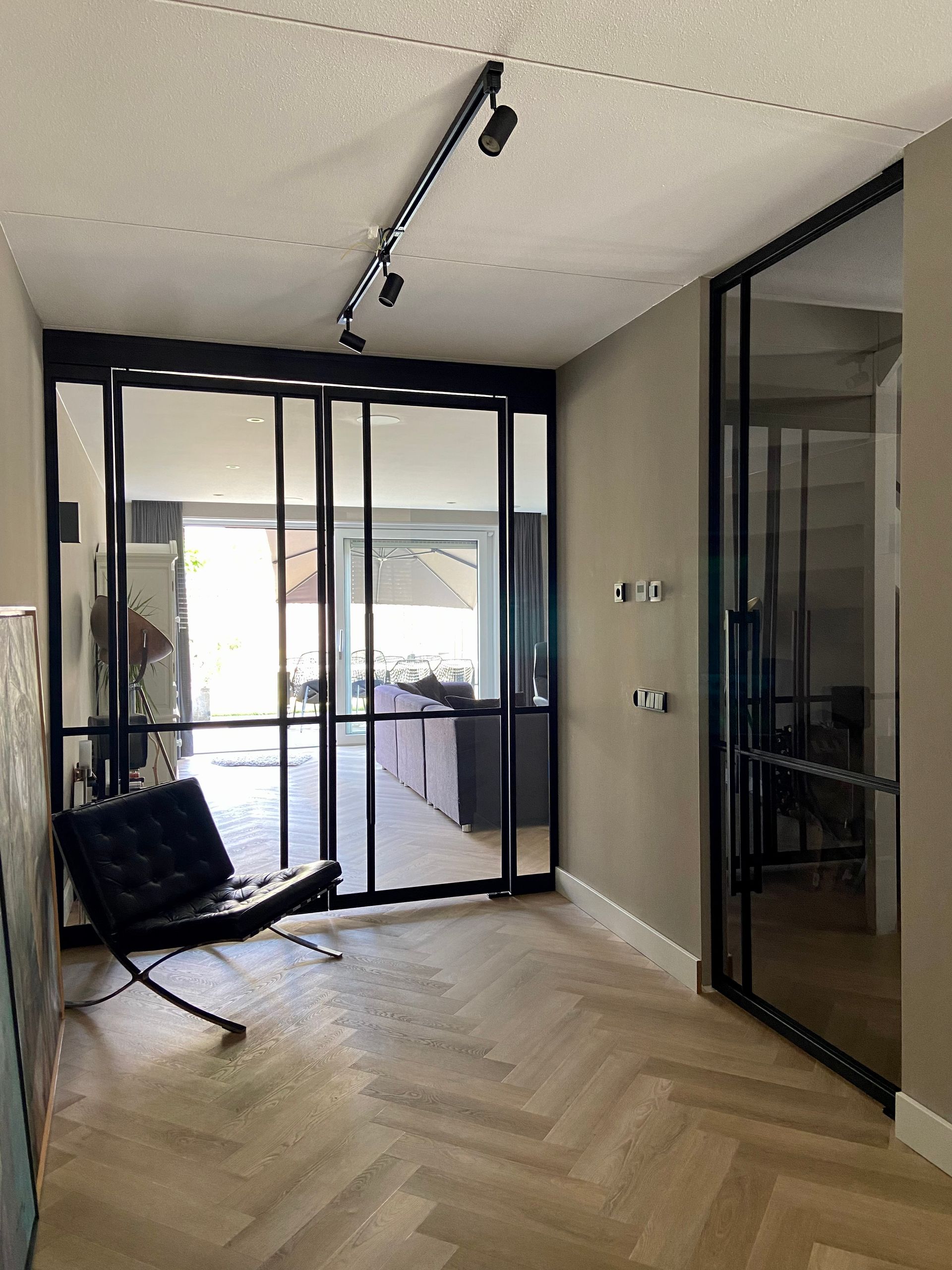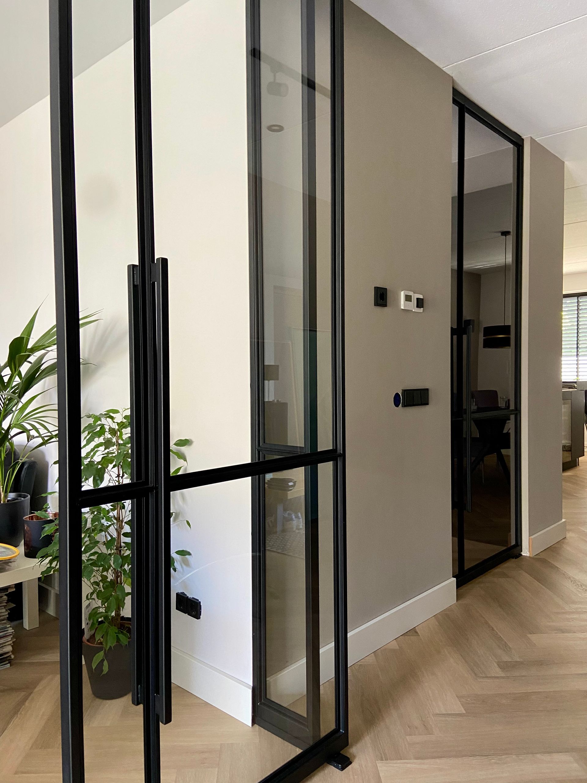 Wand met twee taatsdeuren met zijlichten. In combinatie met een taatsdeur met donker glas naar de hal toe. Een geheel met mooi, doorlopend lijnenspel.