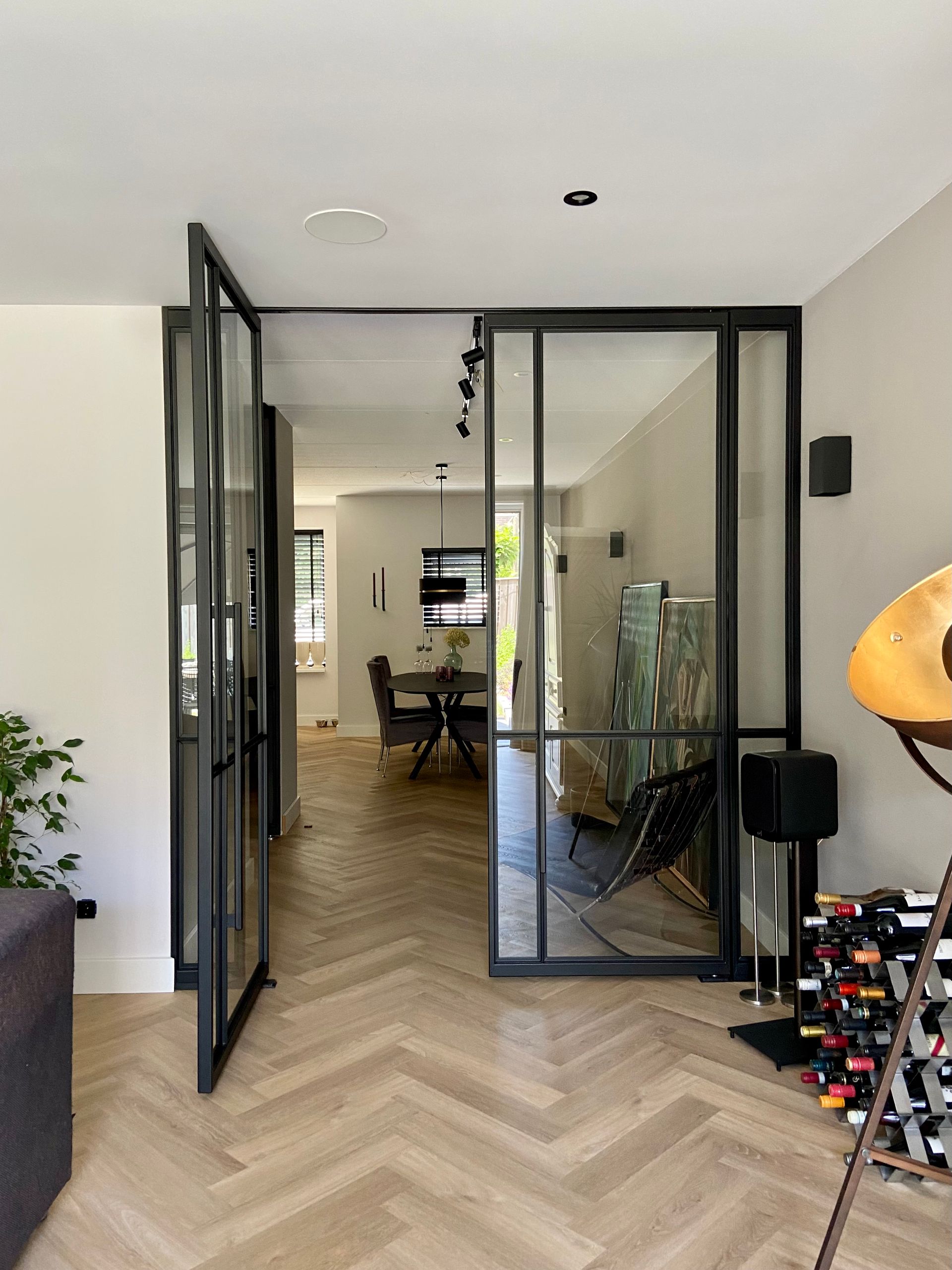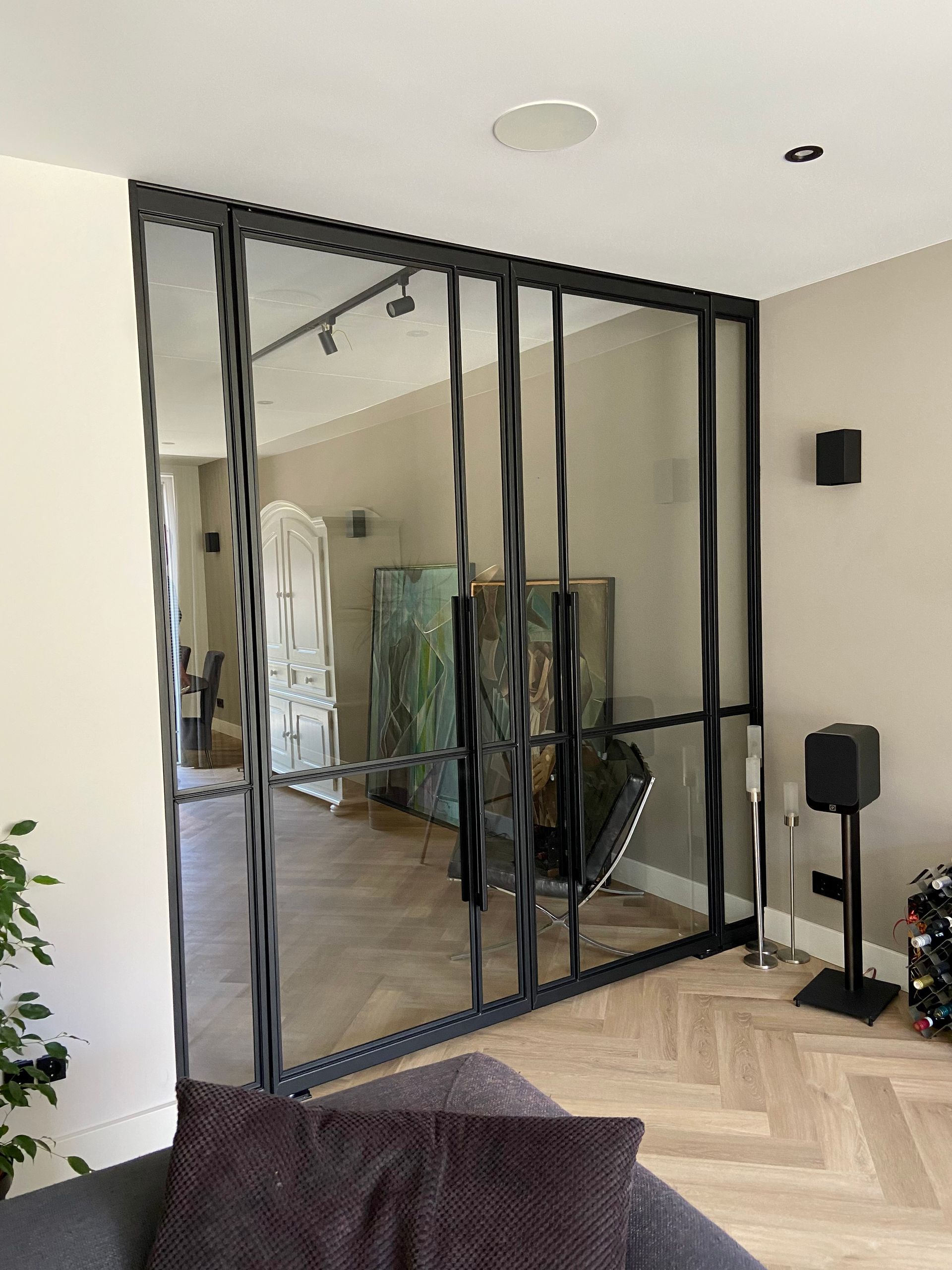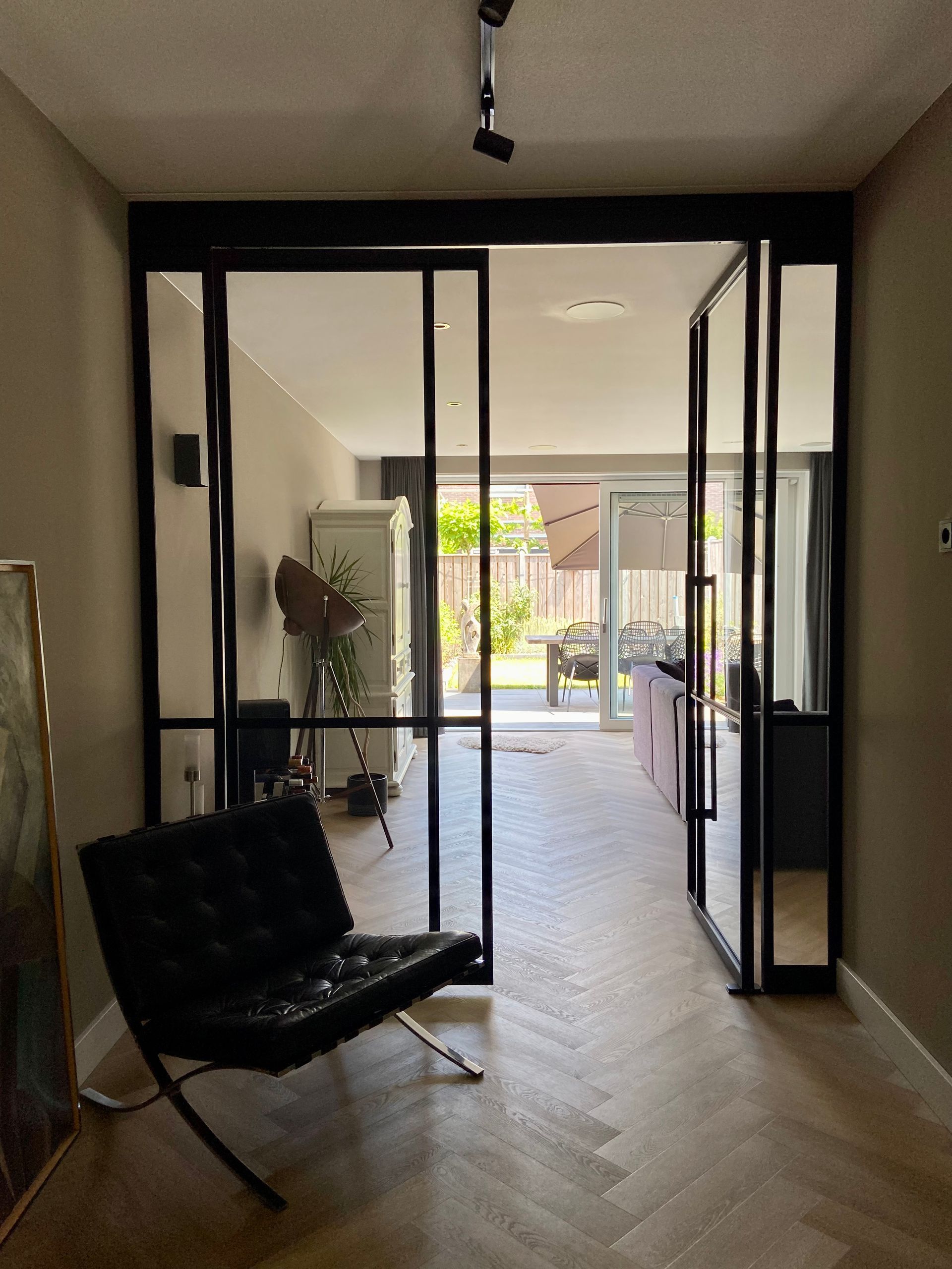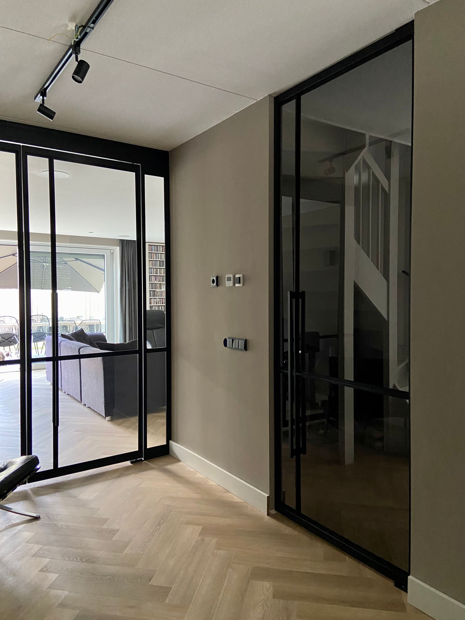 Wand met twee taatsdeuren met zijlichten. In combinatie met een taatsdeur met donker glas naar de hal toe. Een geheel met mooi, doorlopend lijnenspel.