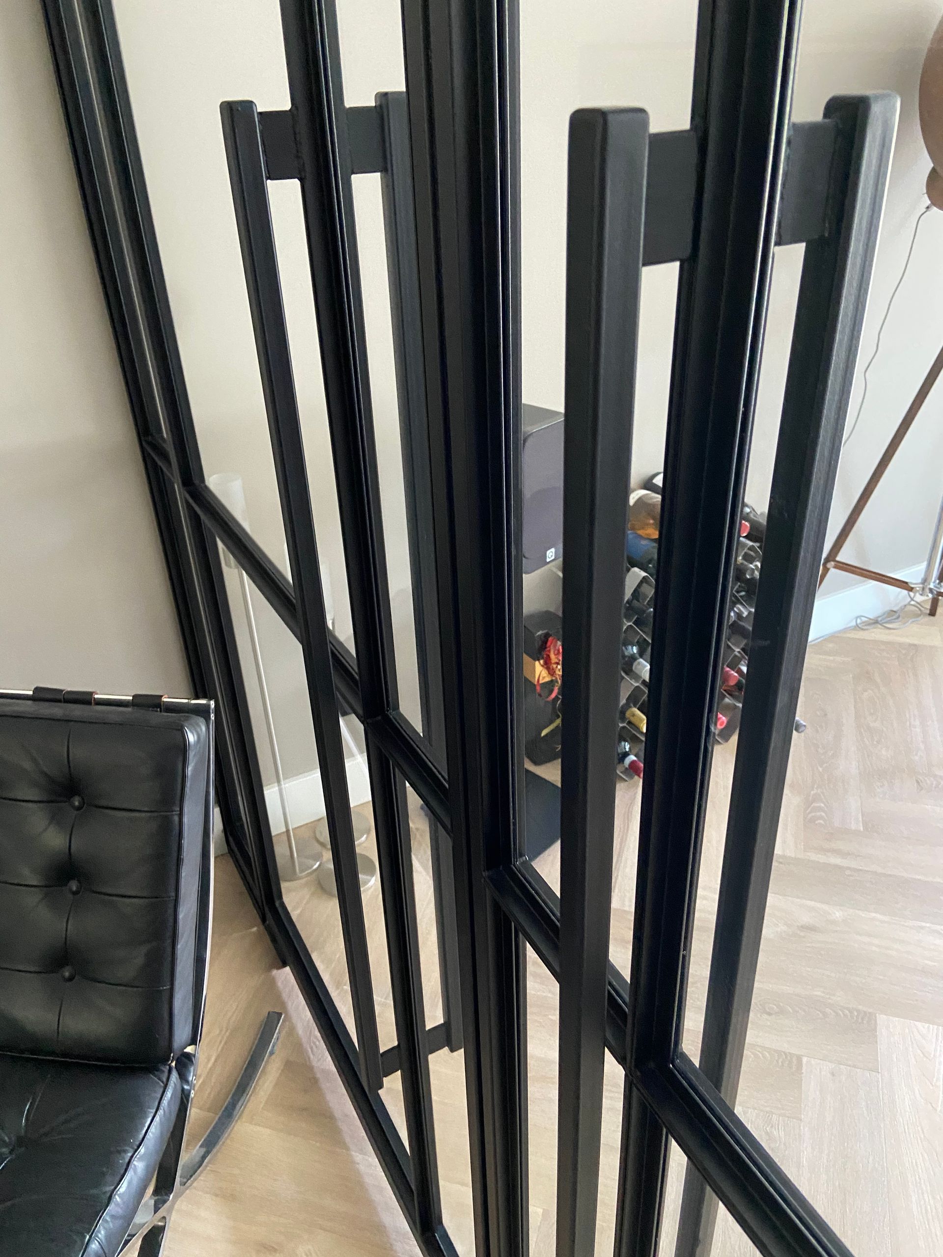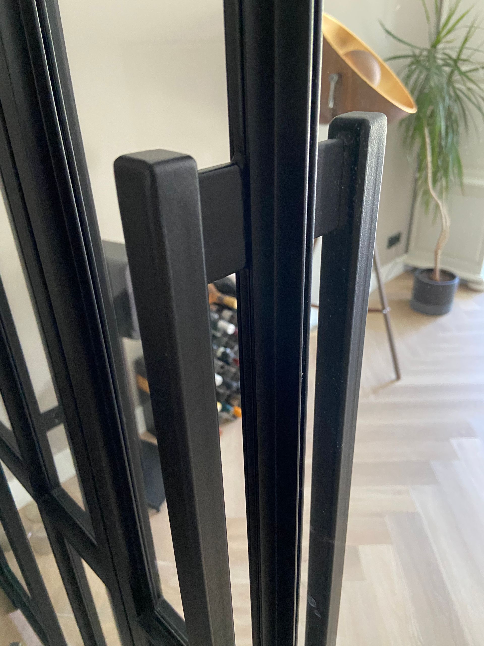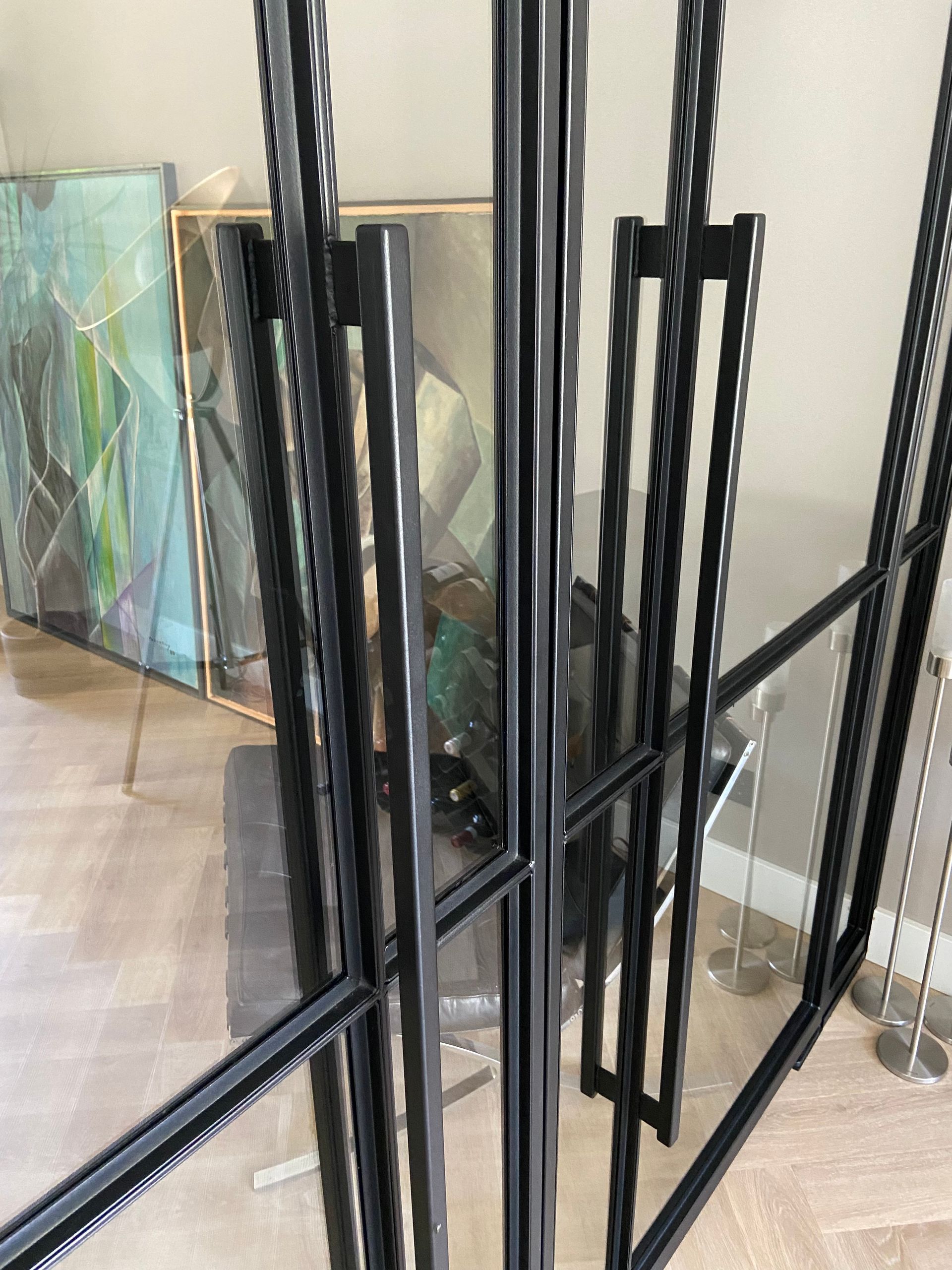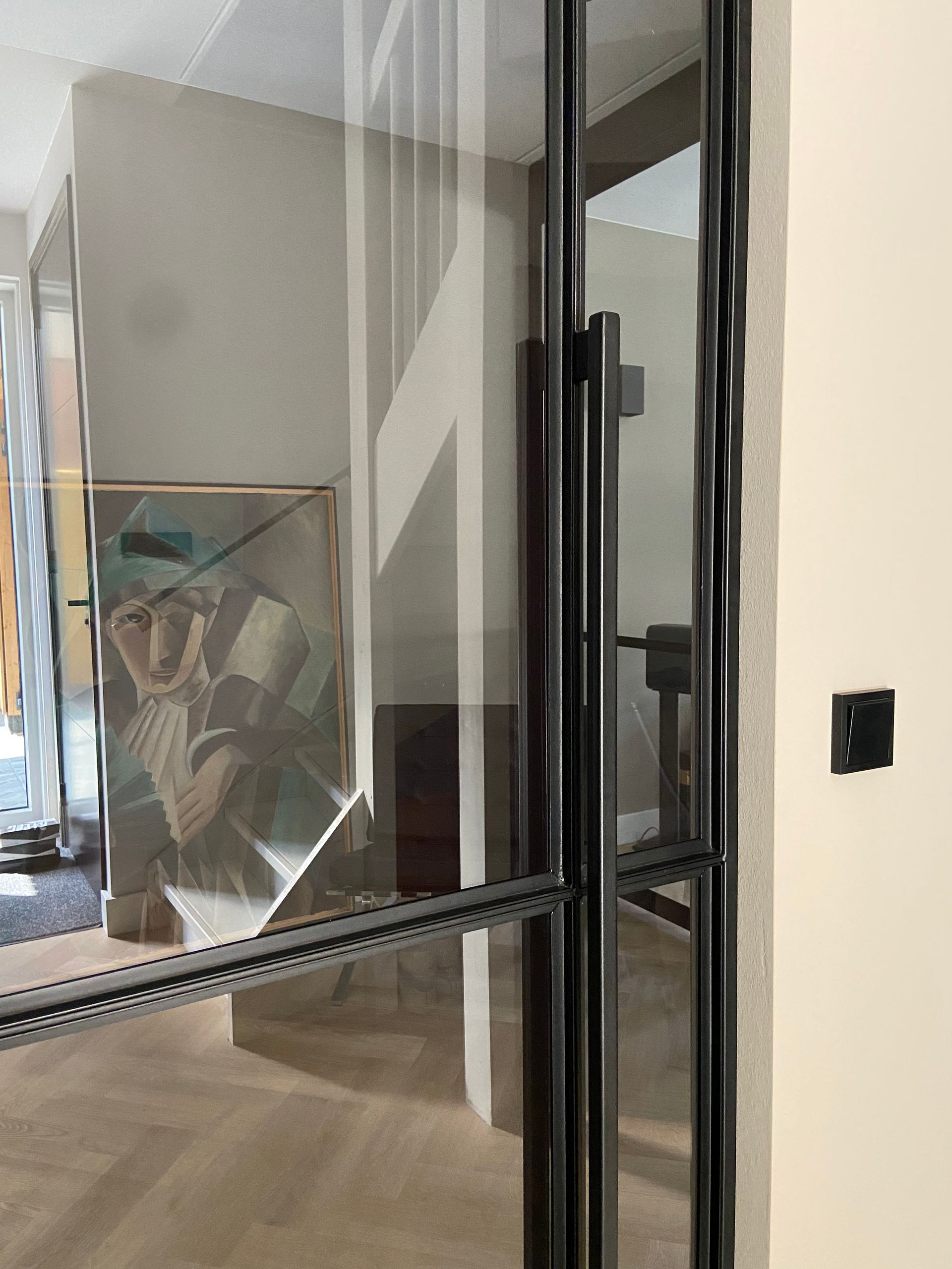 Wand met twee taatsdeuren met zijlichten. In combinatie met een taatsdeur met donker glas naar de hal toe. Een geheel met mooi, doorlopend lijnenspel.
