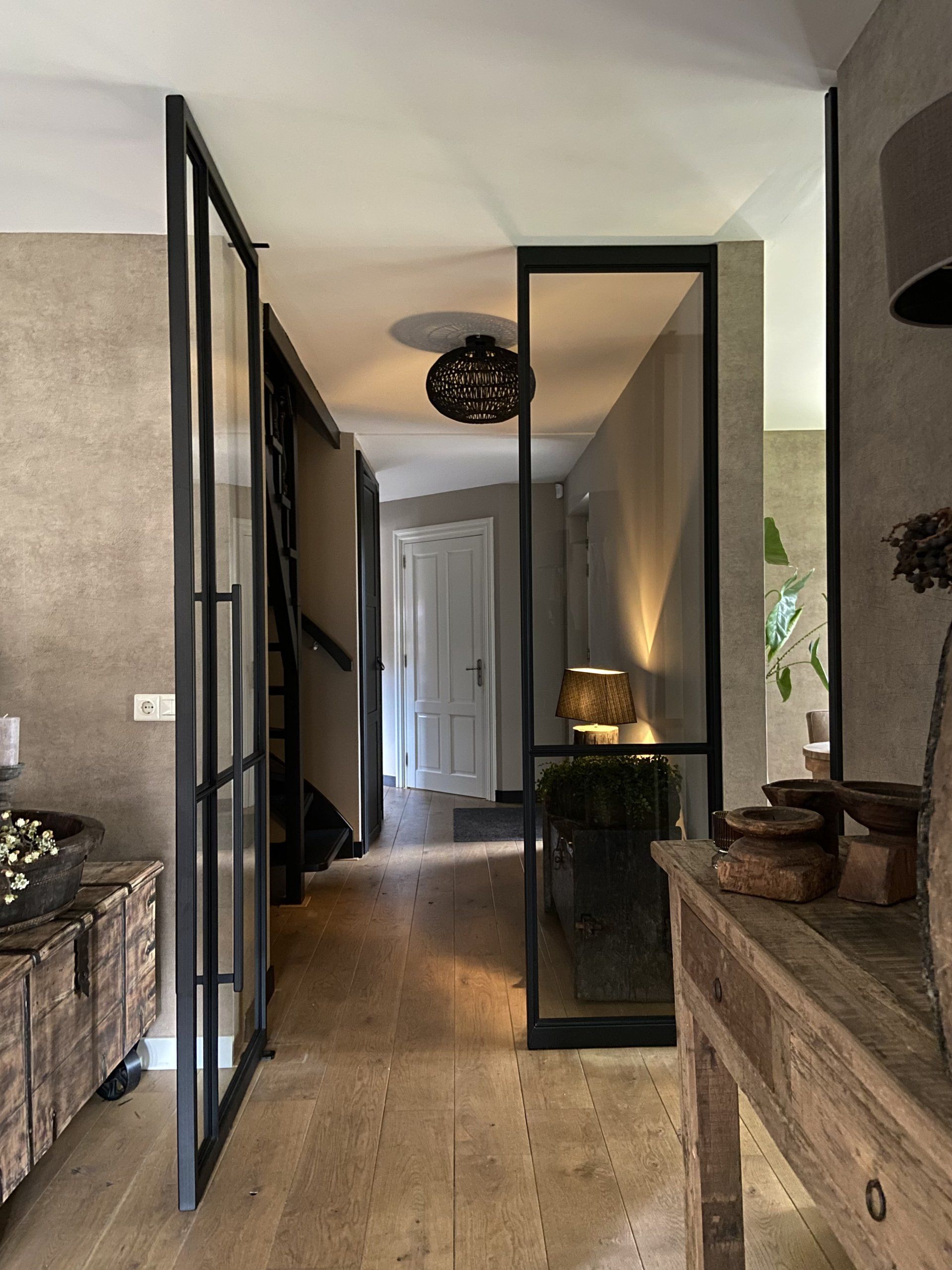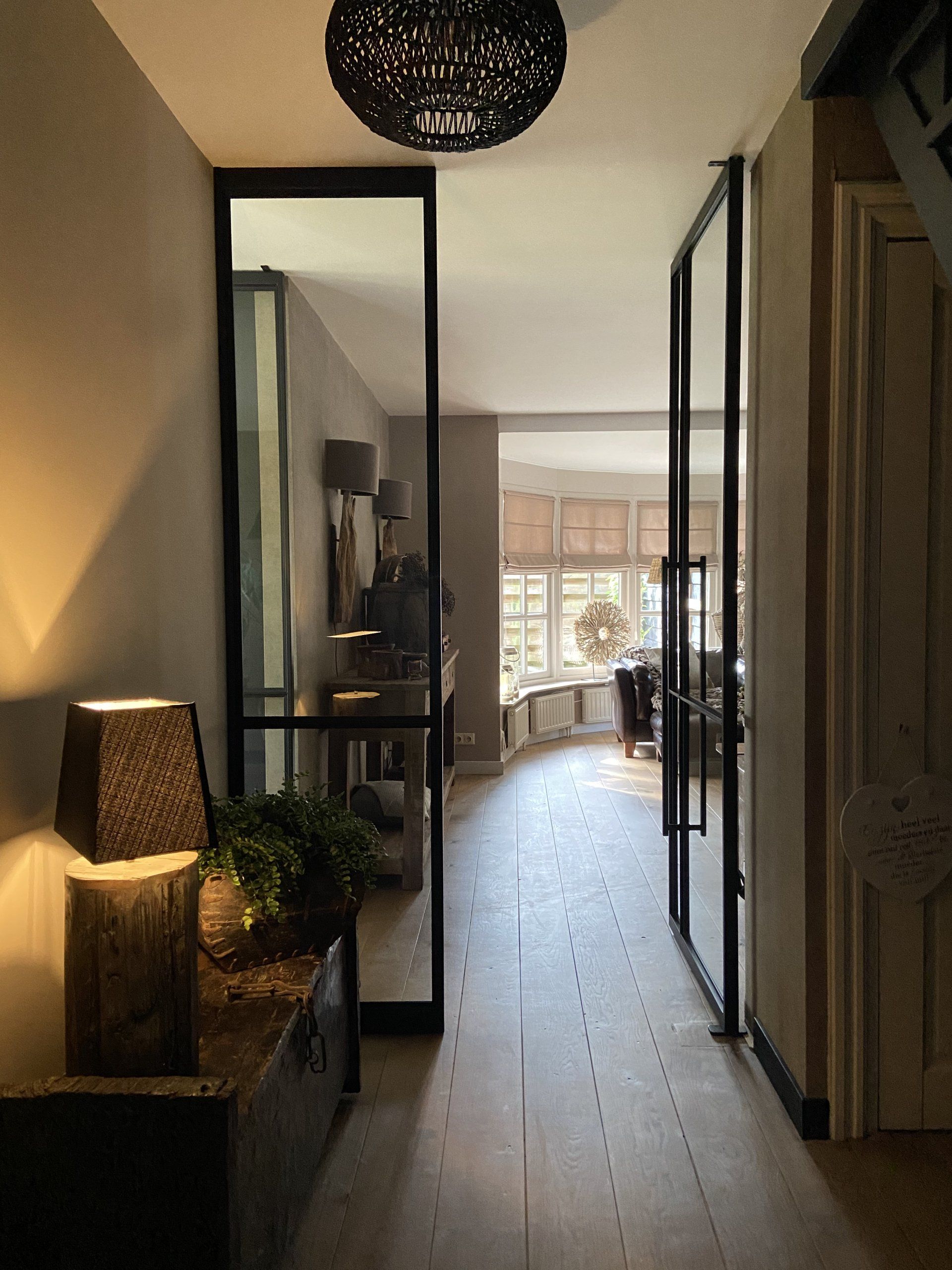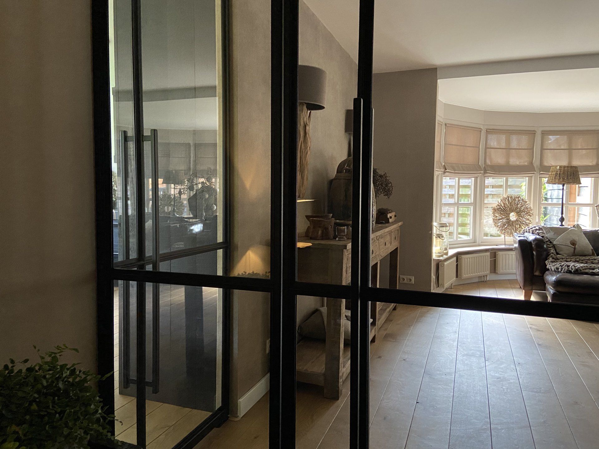 Een taatsdeur met zijlicht en een enkele taatsdeur. Het betrekken van de hal en keuken bij de woonkamer. Een mooi, open geheel voor een ruimtelijk gevoel.