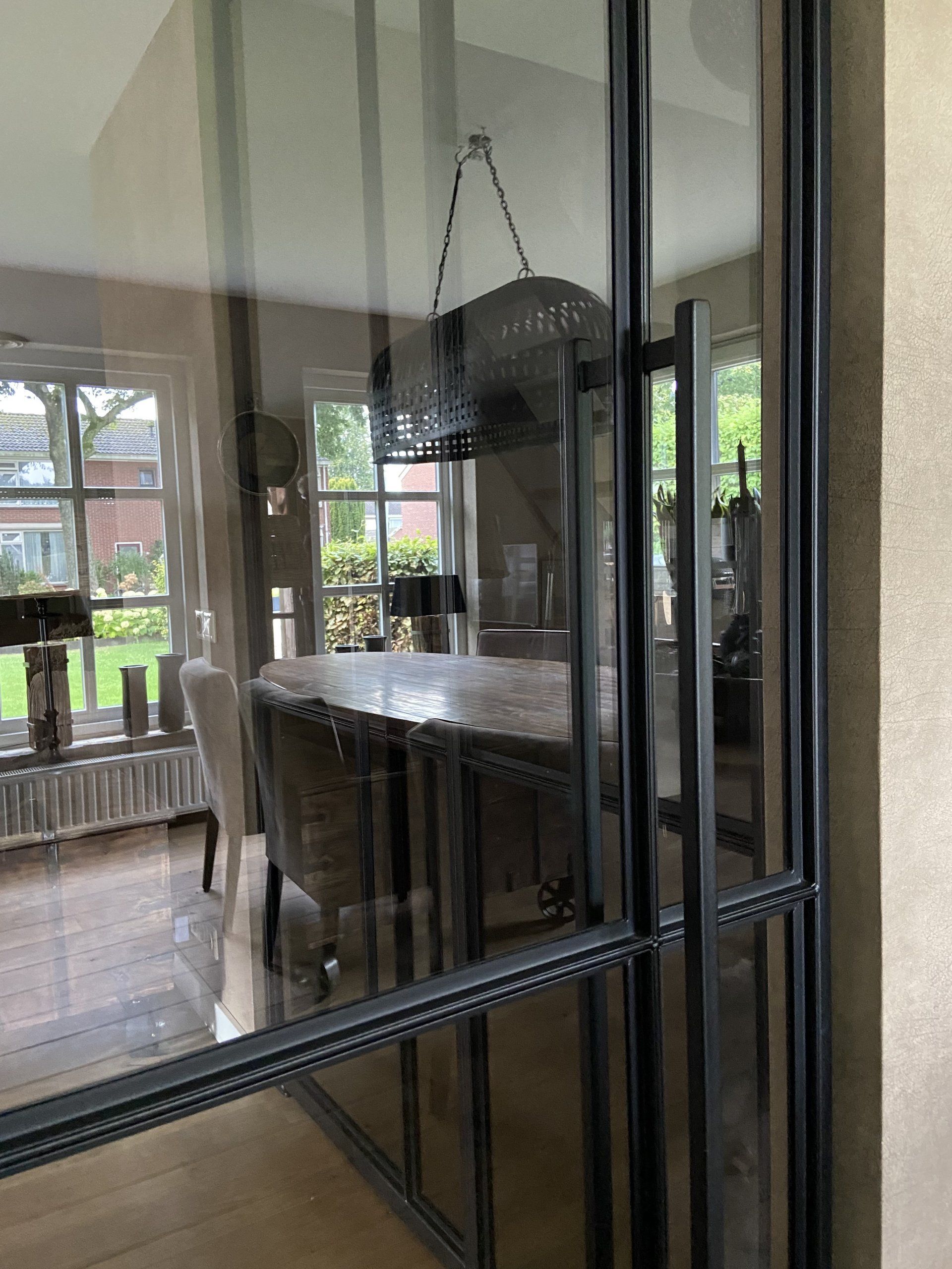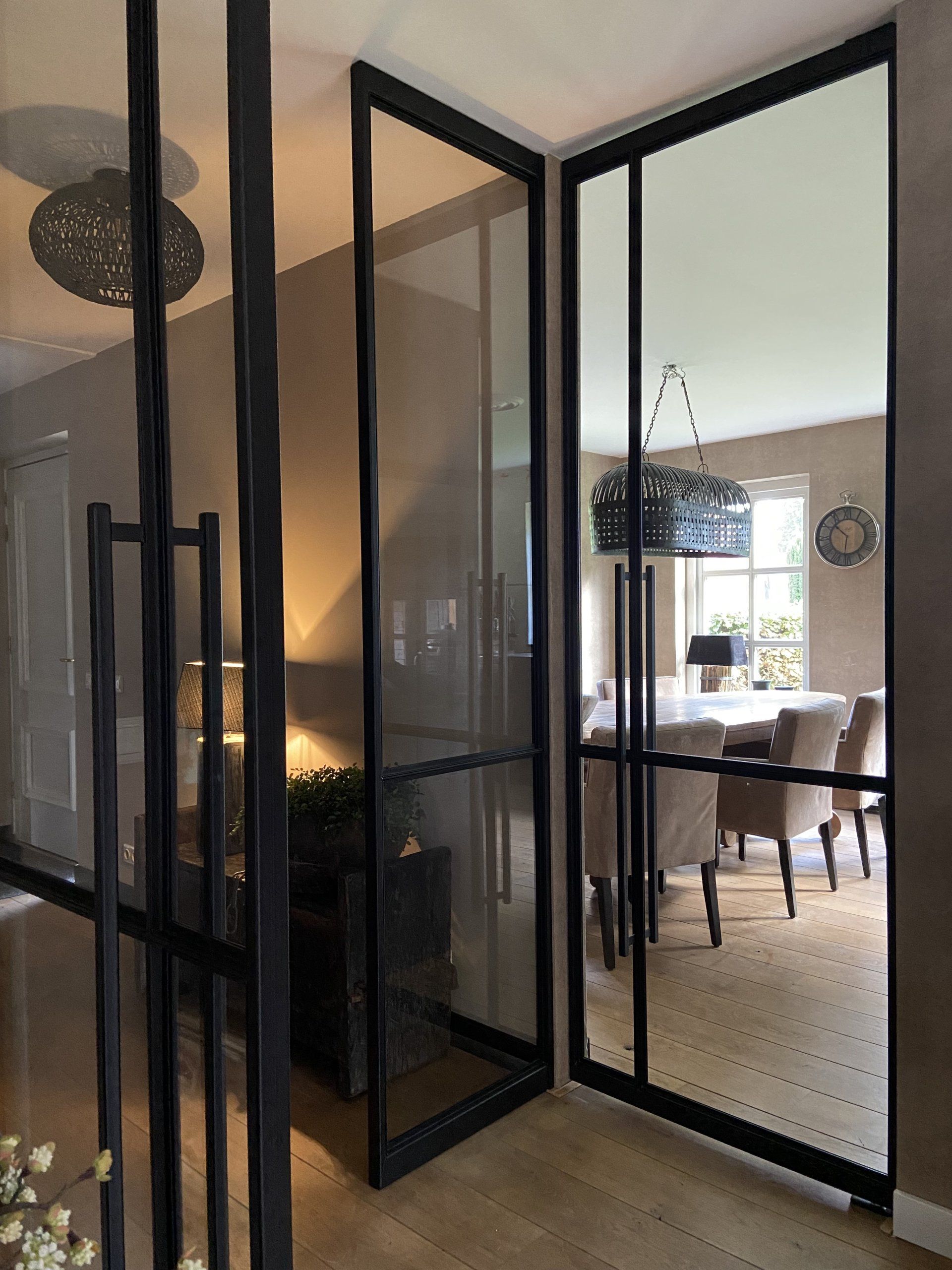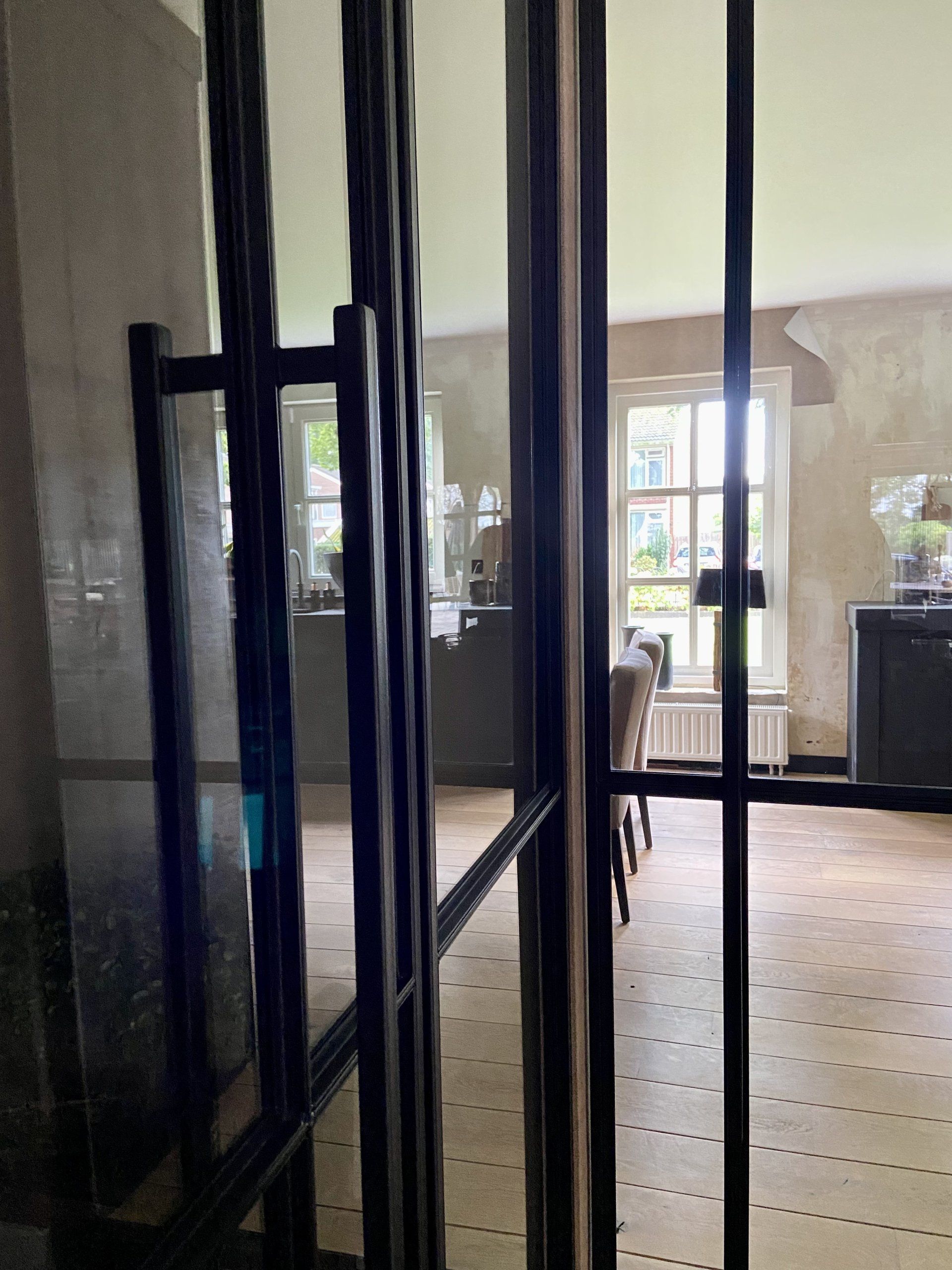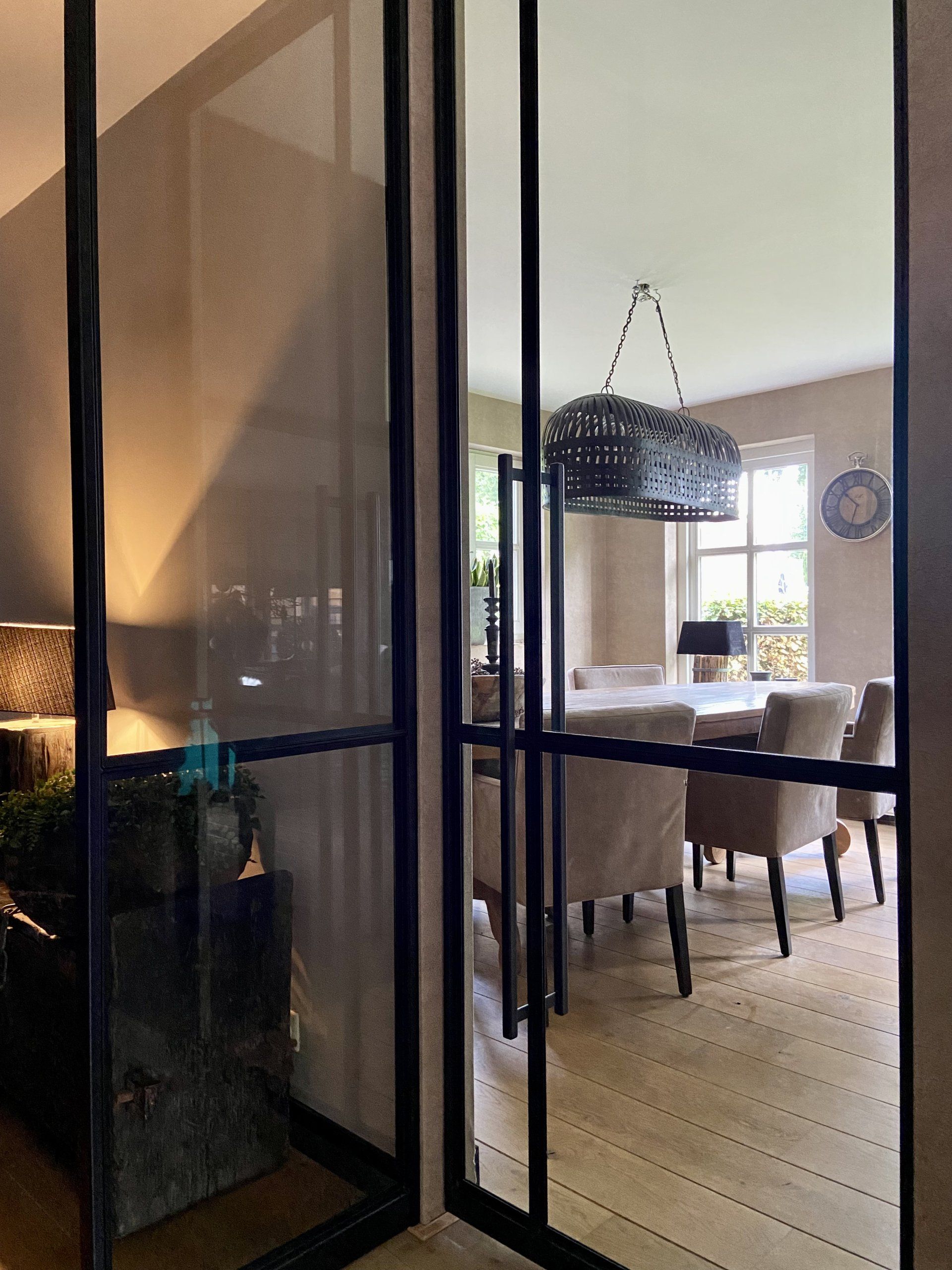 Een taatsdeur met zijlicht en een enkele taatsdeur. Het betrekken van de hal en keuken bij de woonkamer. Een mooi, open geheel voor een ruimtelijk gevoel.