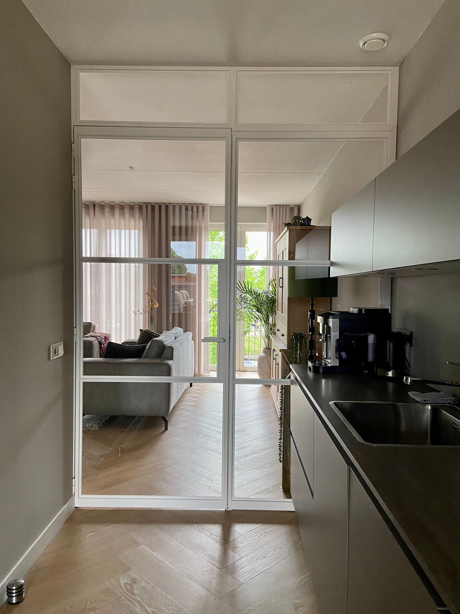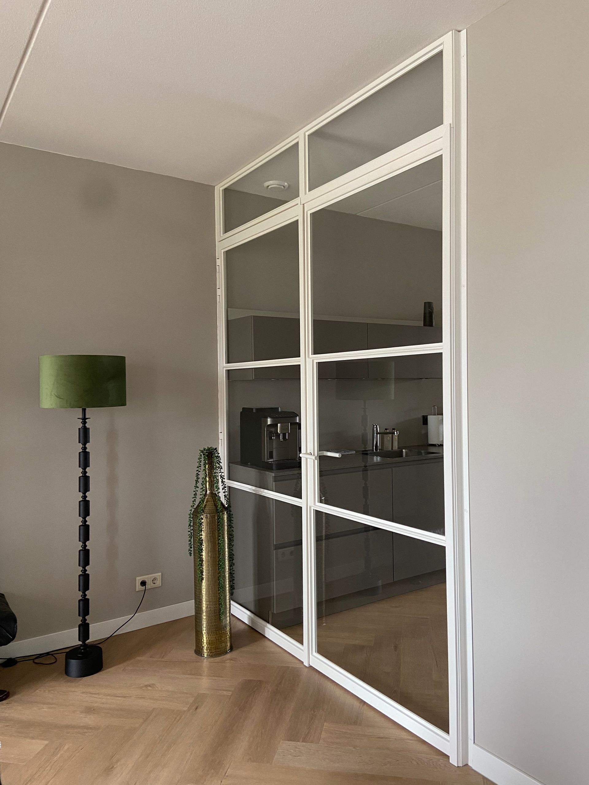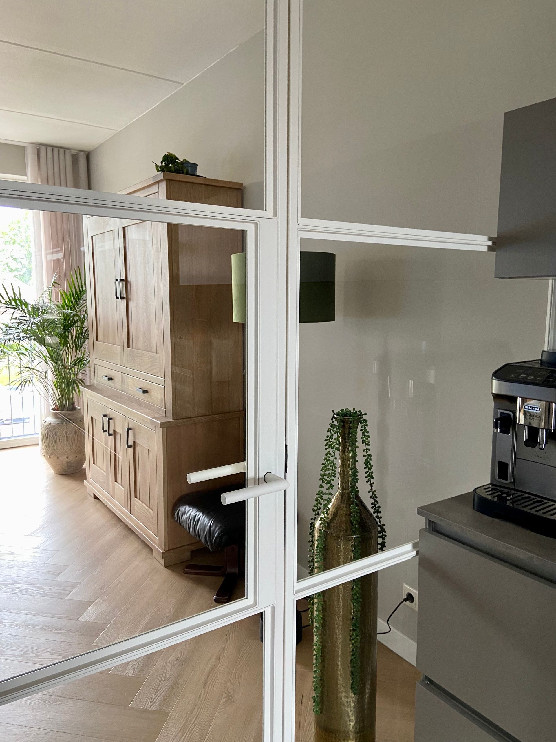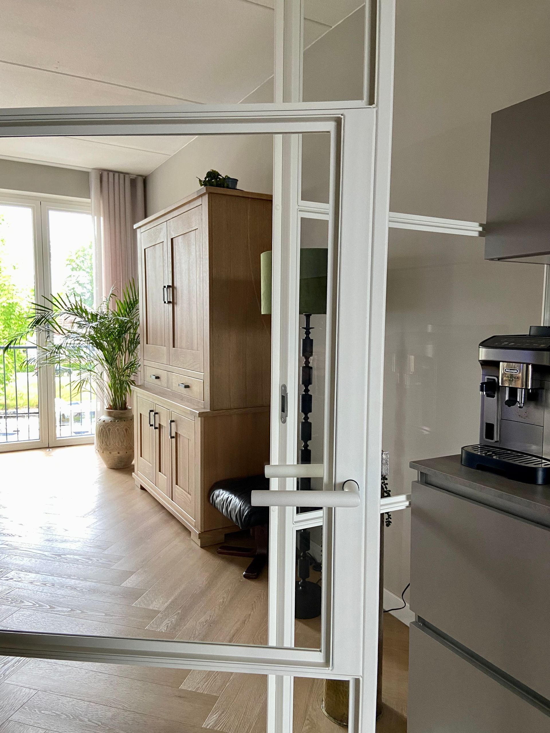 Een wand met scharnierdeur en scharnierend zijlicht. Wanneer nodig kan een extra ruime doorgang gecreëerd worden door het zijlicht ook open te zetten. In mooi wit voor een rustige, lichte uitstraling passend bij de woonkamer en keuken.