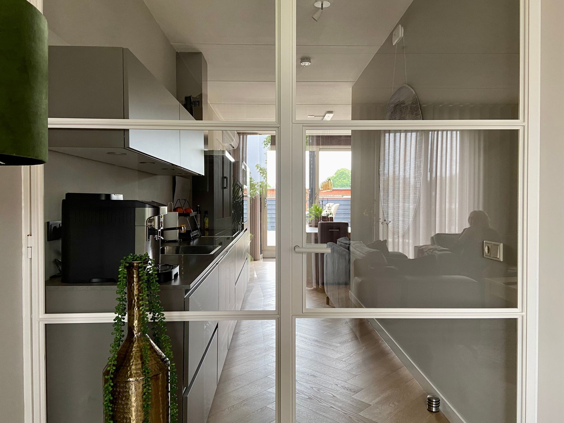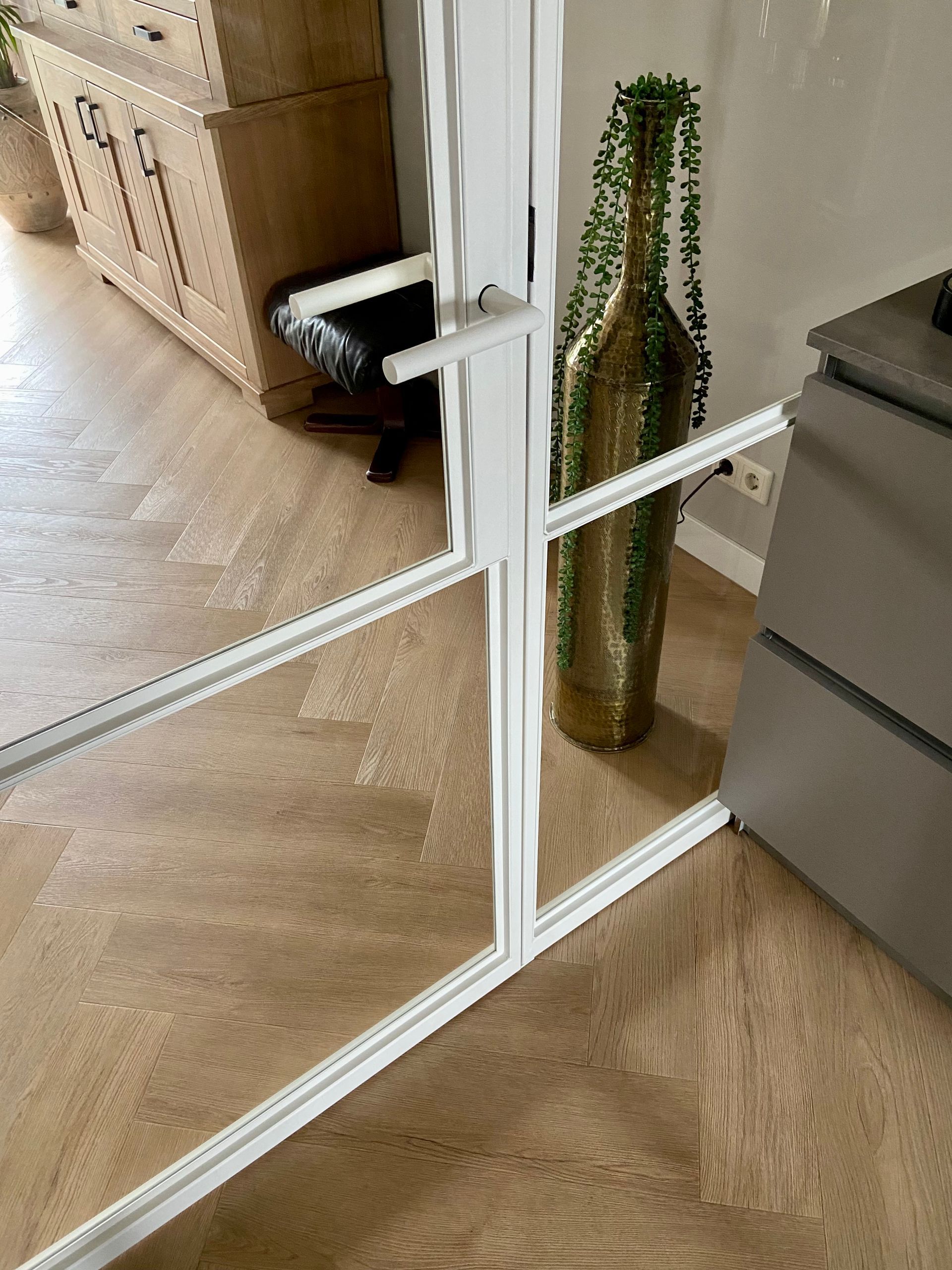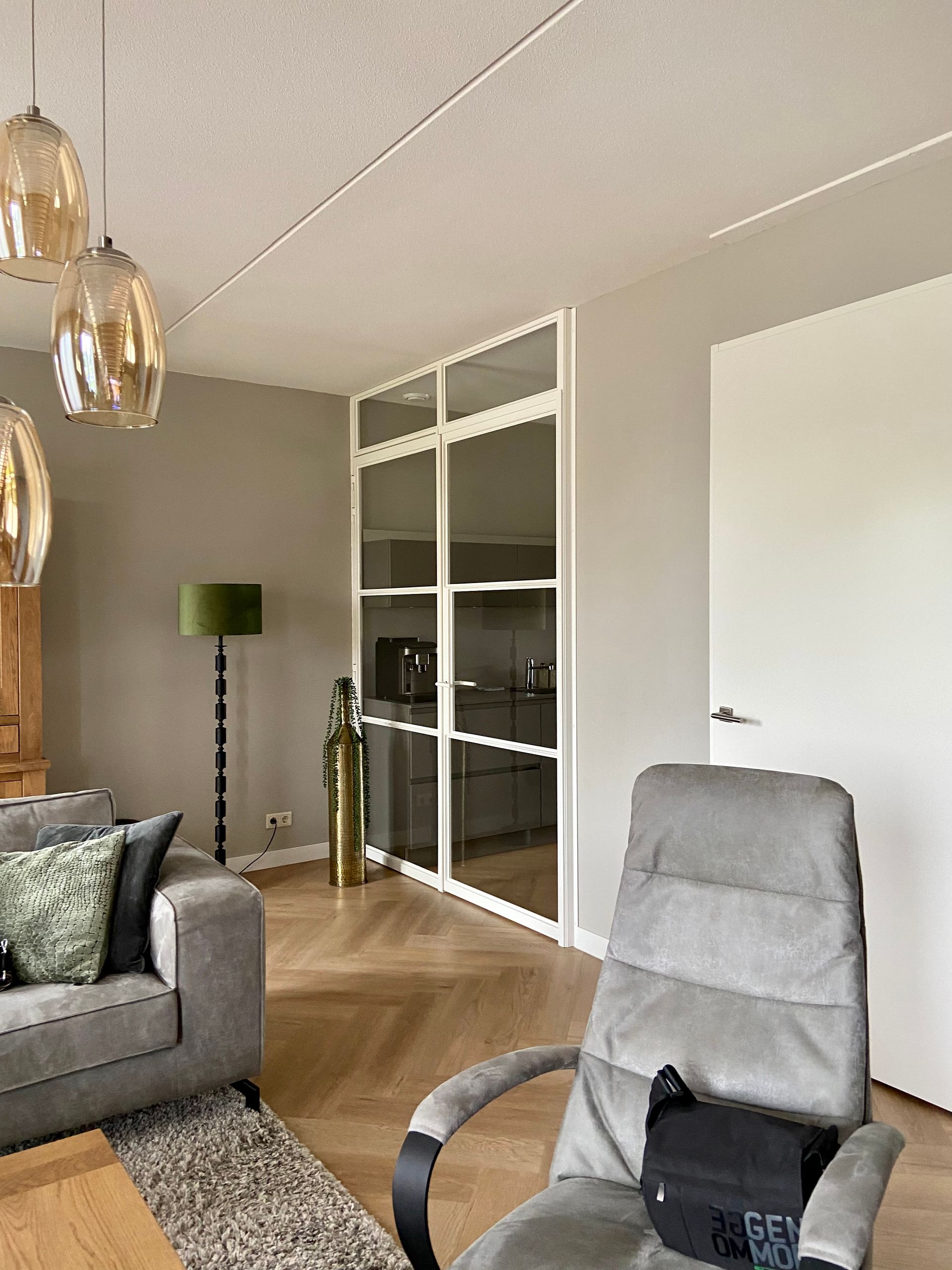 Een wand met scharnierdeur en scharnierend zijlicht. Wanneer nodig kan een extra ruime doorgang gecreëerd worden door het zijlicht ook open te zetten. In mooi wit voor een rustige, lichte uitstraling passend bij de woonkamer en keuken.