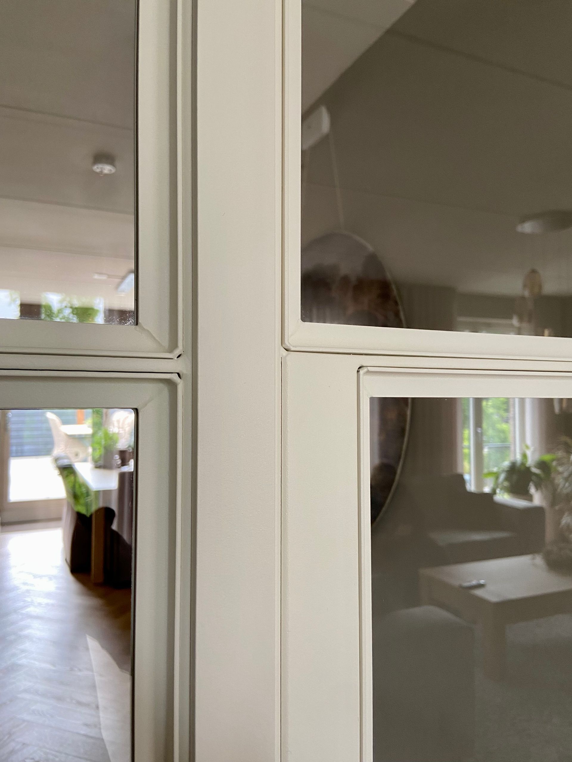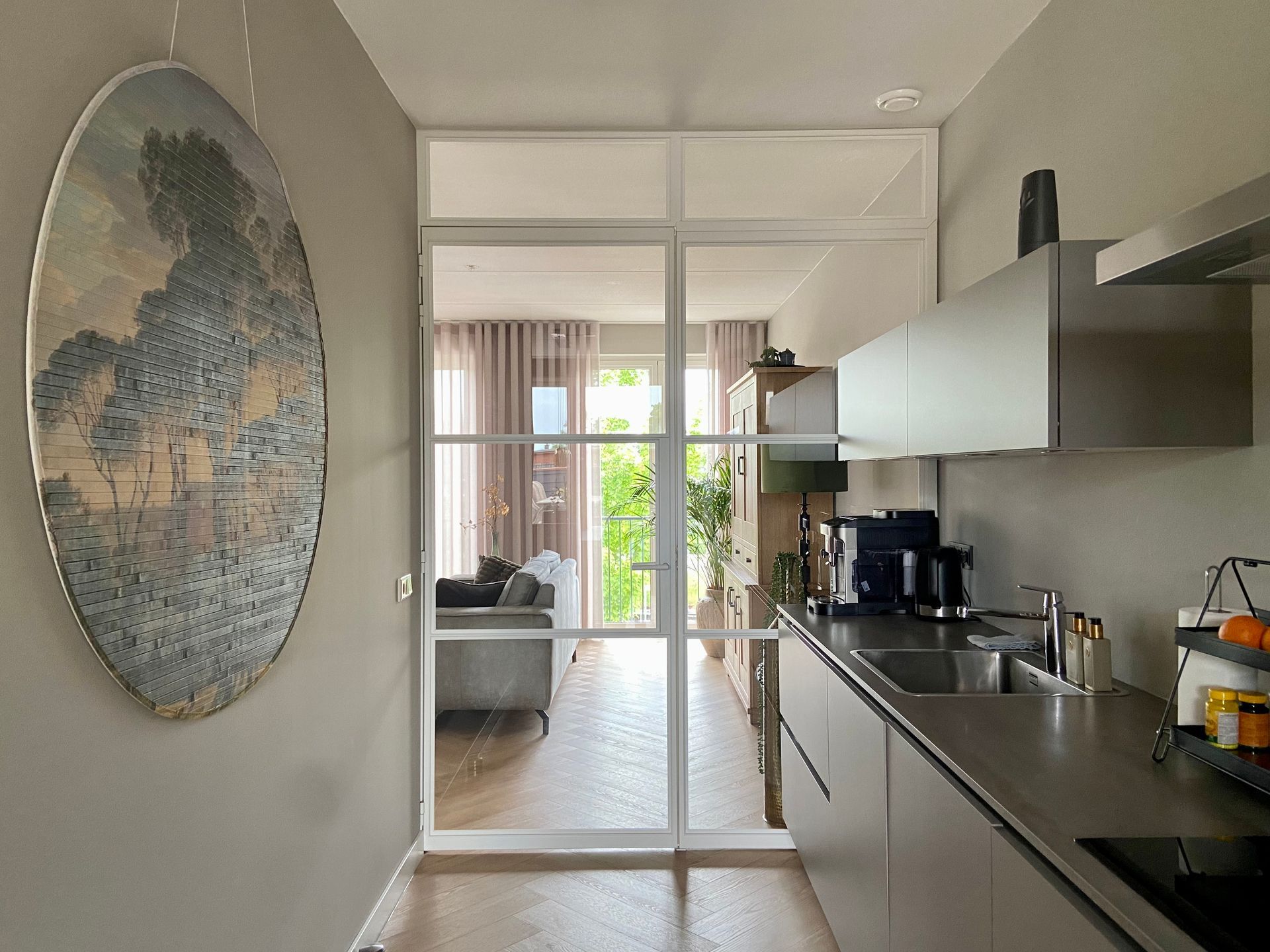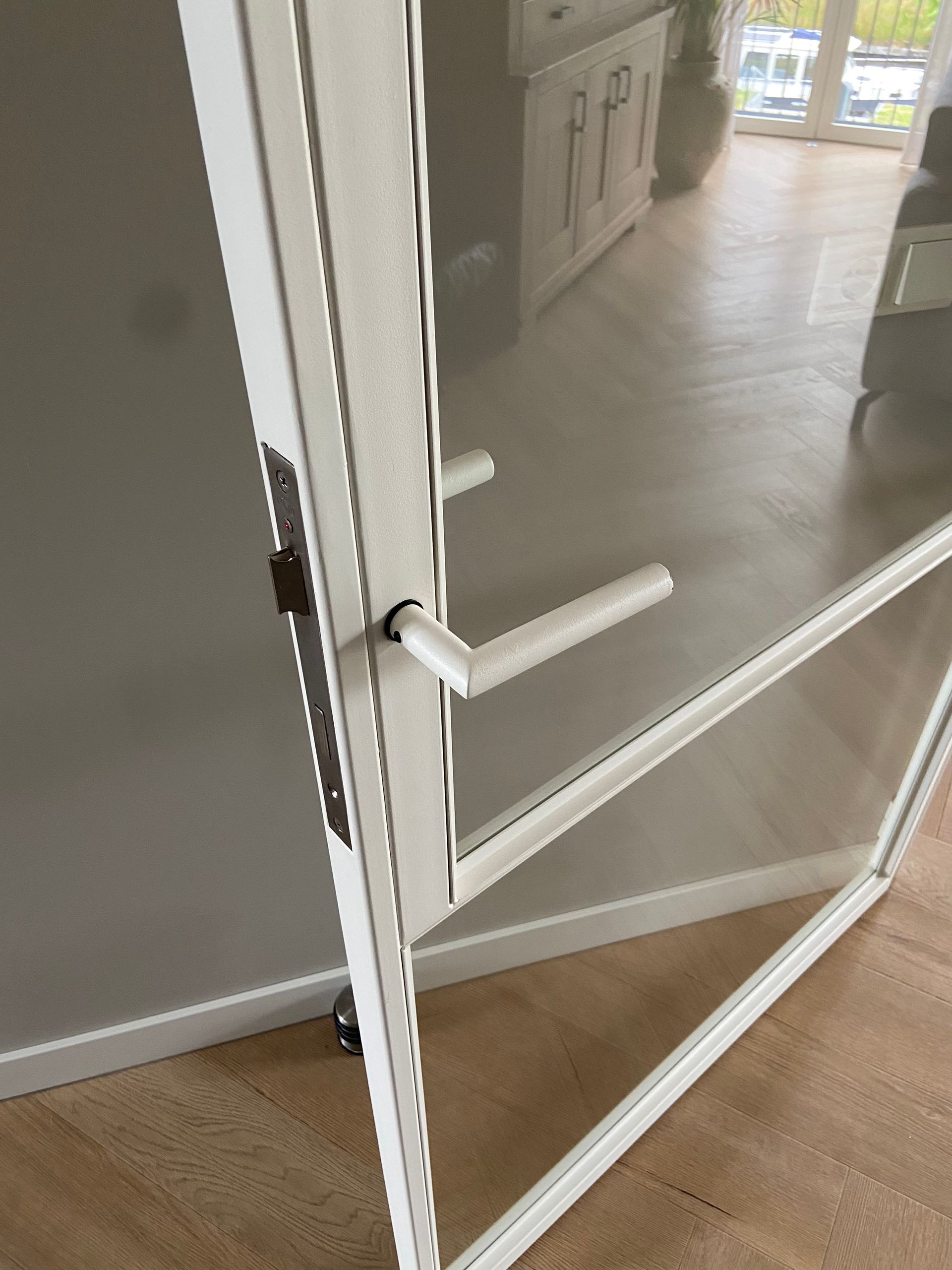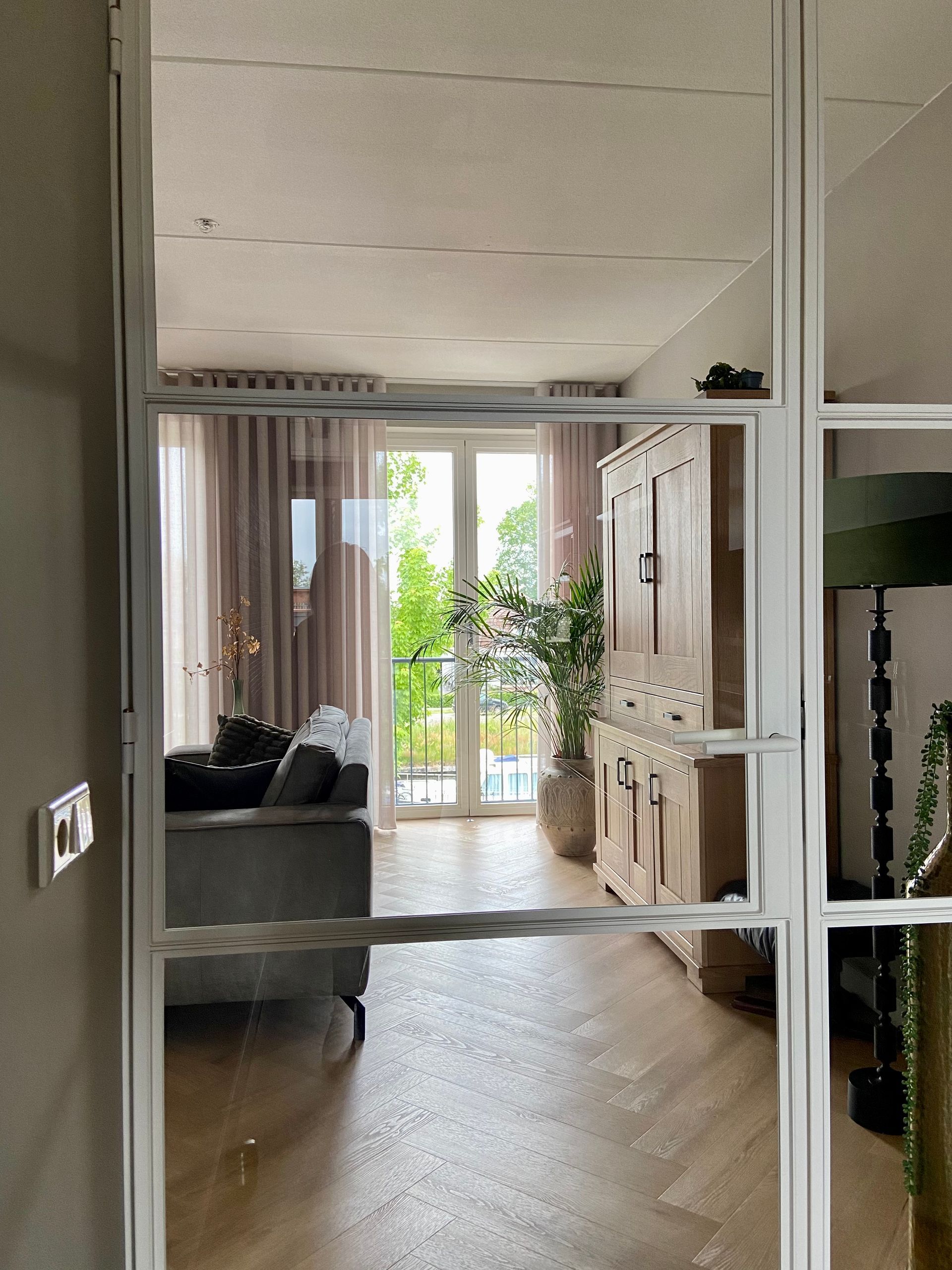 Een wand met scharnierdeur en scharnierend zijlicht. Wanneer nodig kan een extra ruime doorgang gecreëerd worden door het zijlicht ook open te zetten. In mooi wit voor een rustige, lichte uitstraling passend bij de woonkamer en keuken.