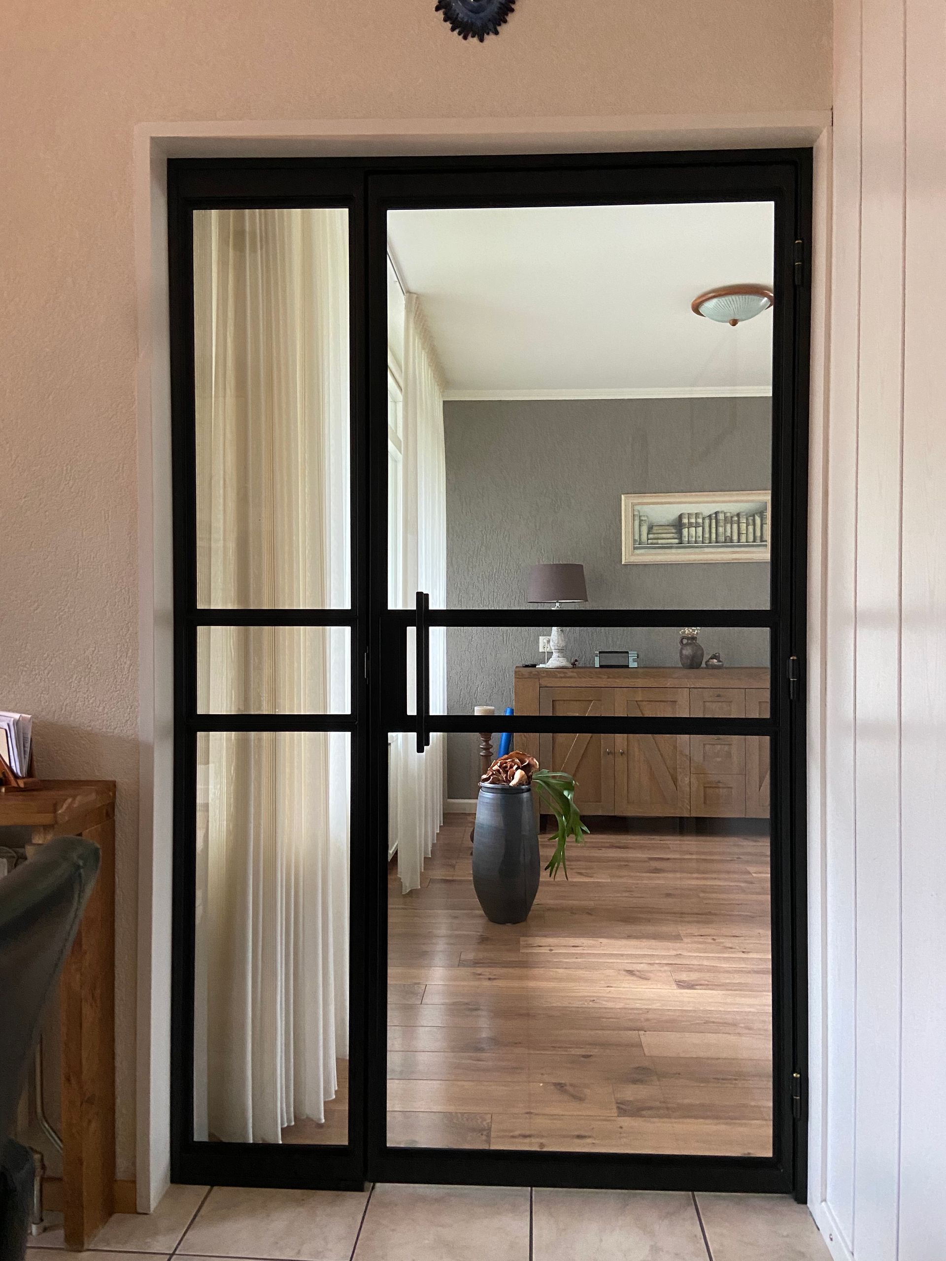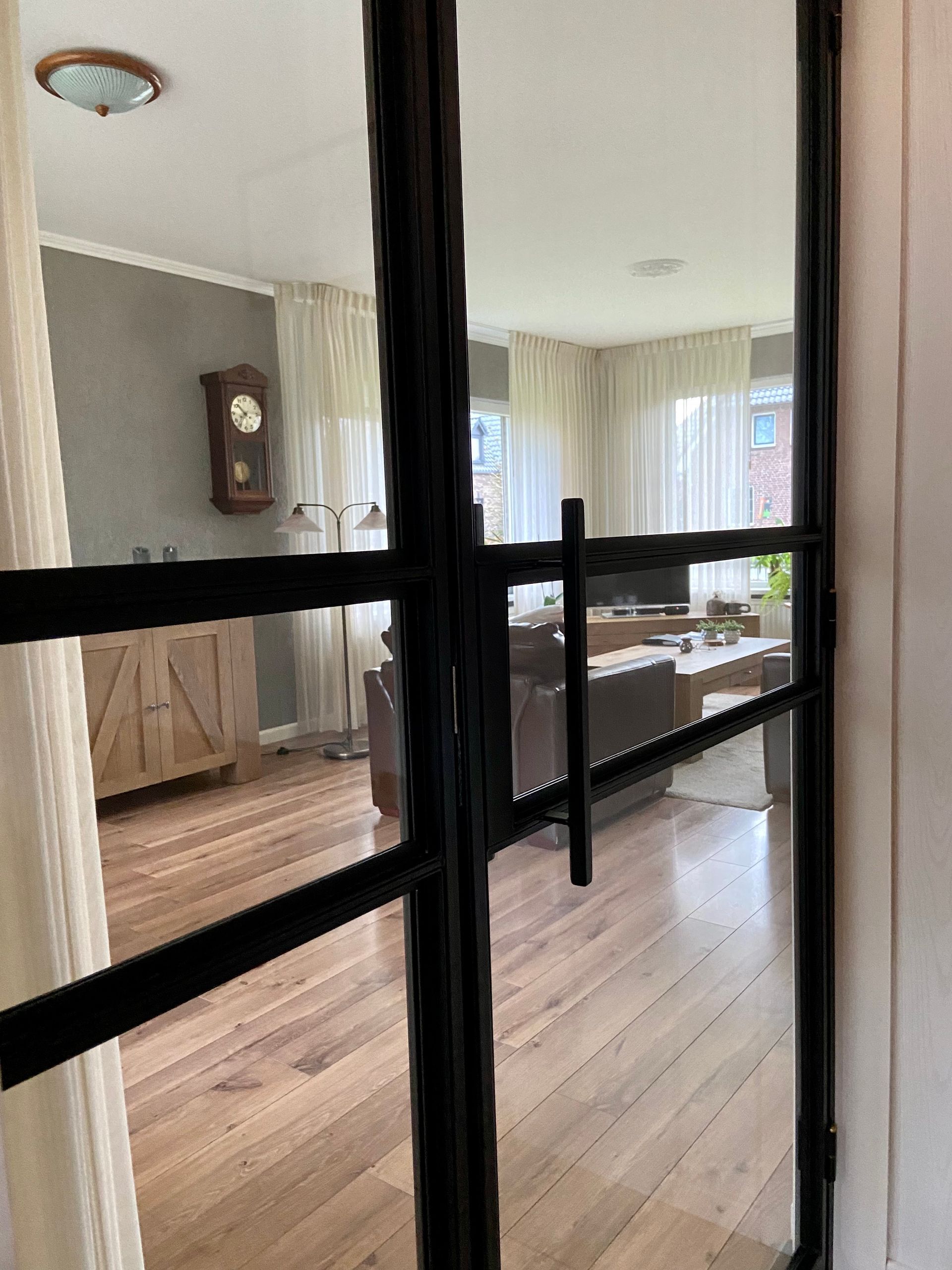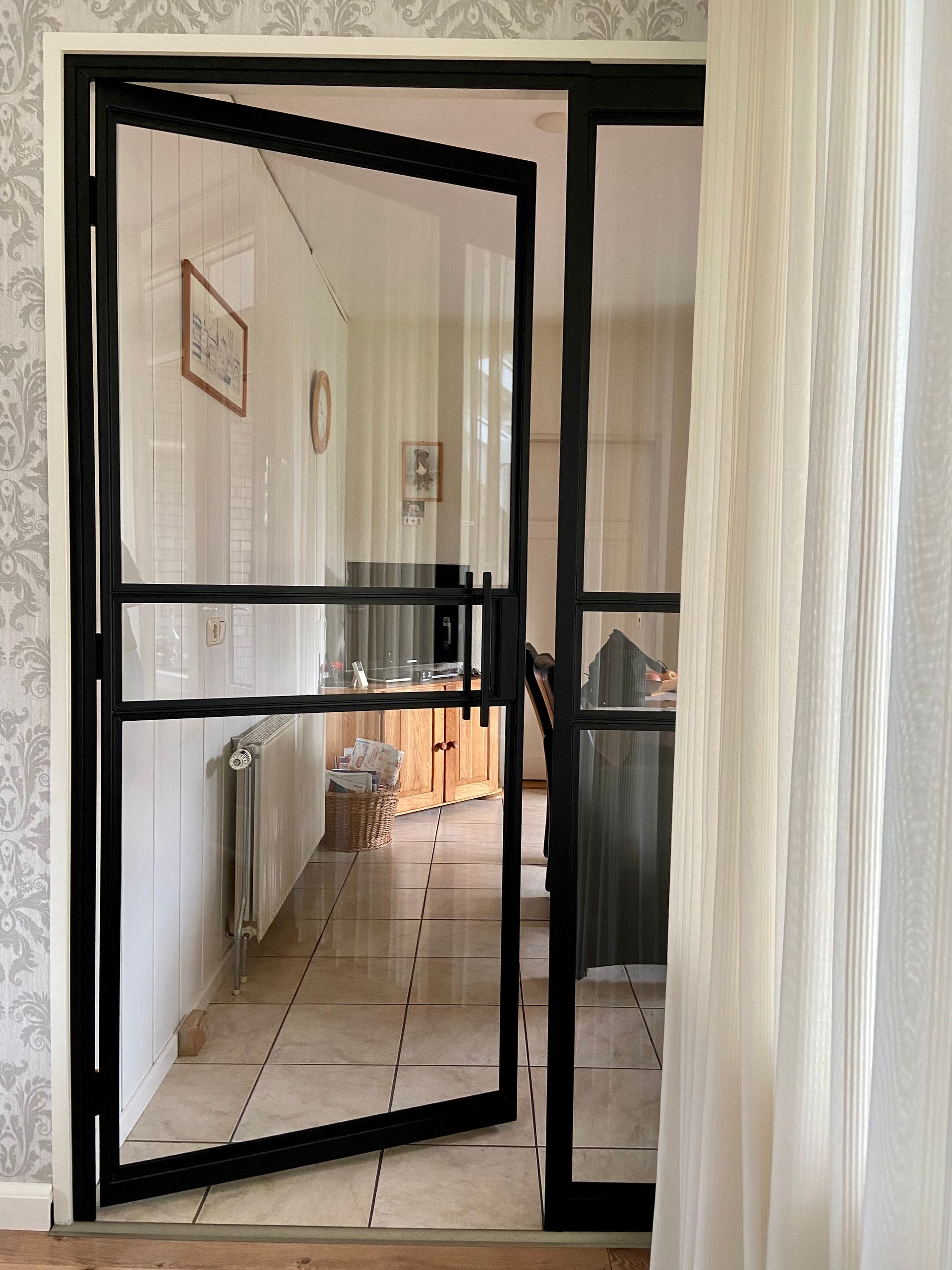 Een scharnierdeur met zijlicht tussen woonkamer en keuken als oplossing voor tocht en geluid. Scharnierdeur met rolslot wat zorgt voor een makkelijke doorgang.