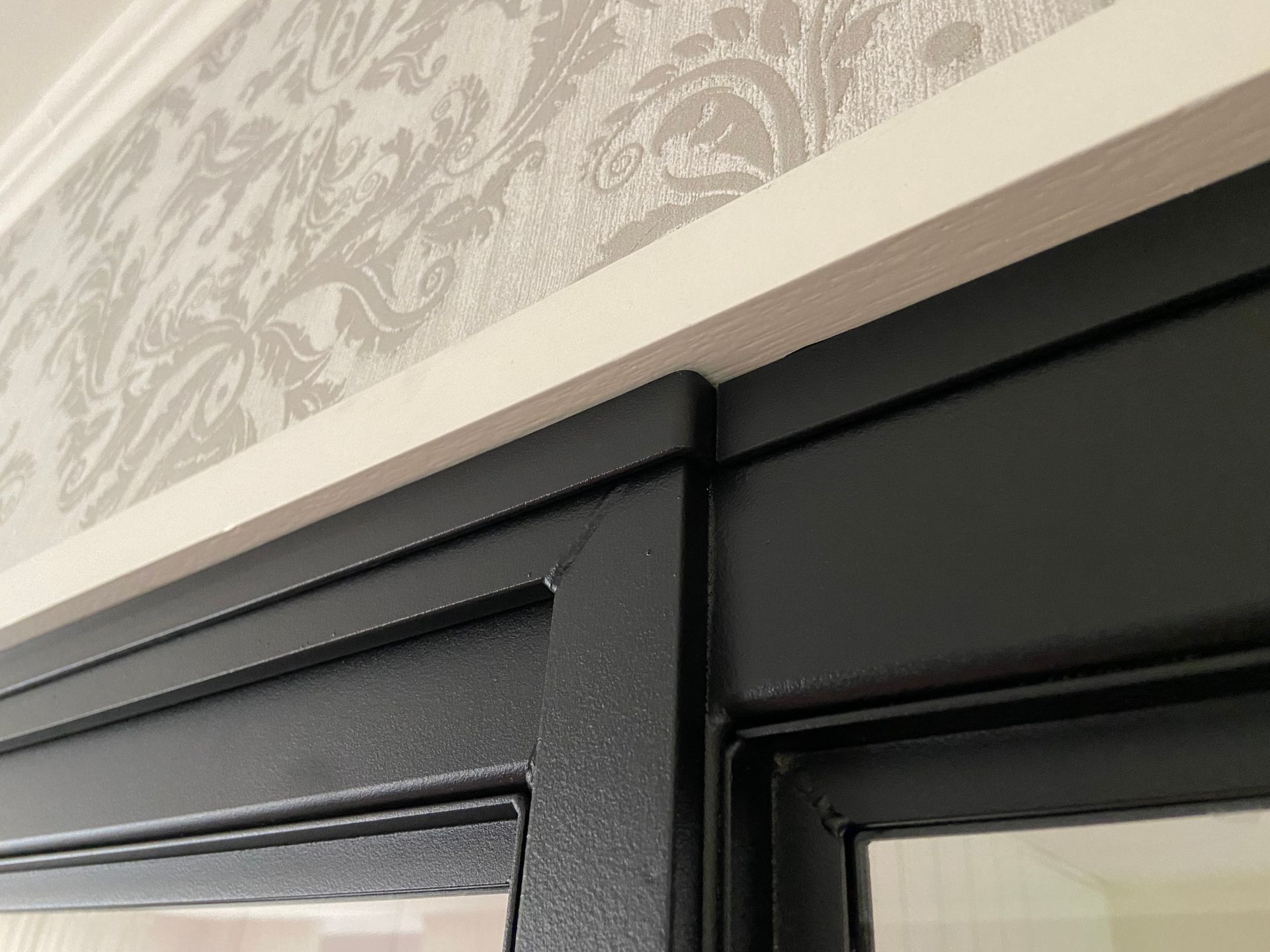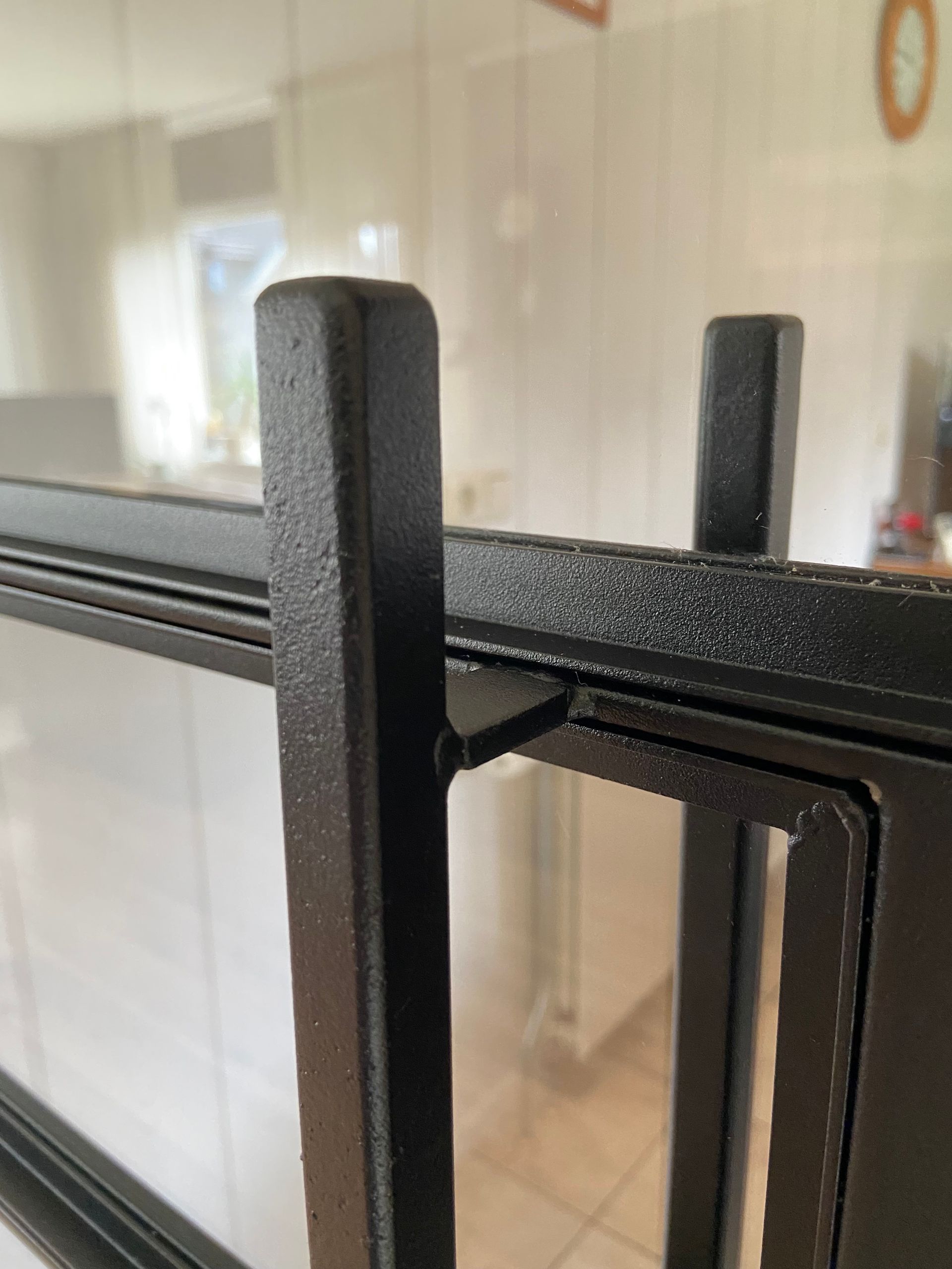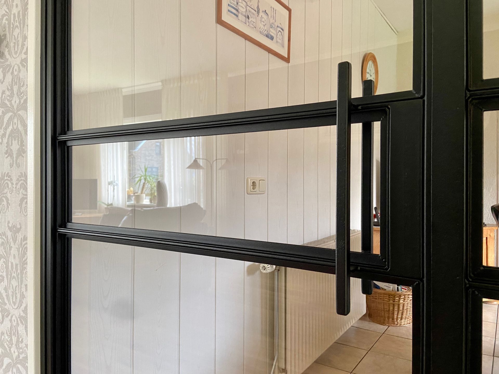 Een scharnierdeur met zijlicht tussen woonkamer en keuken als oplossing voor tocht en geluid. Scharnierdeur met rolslot wat zorgt voor een makkelijke doorgang.