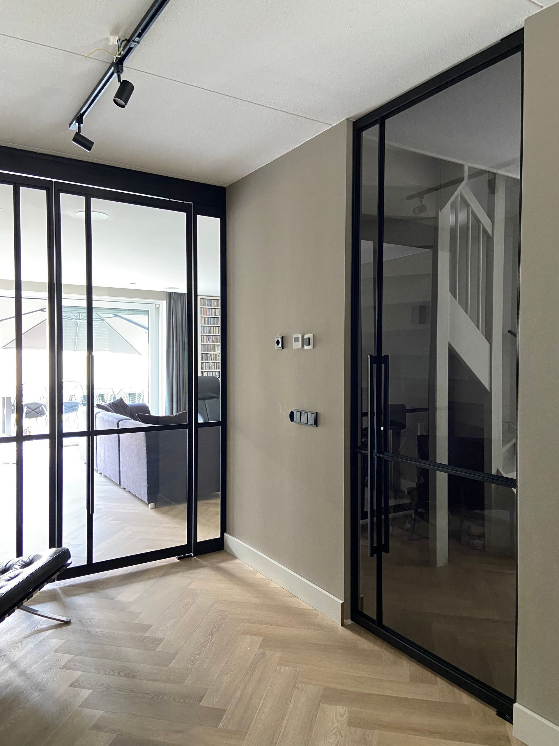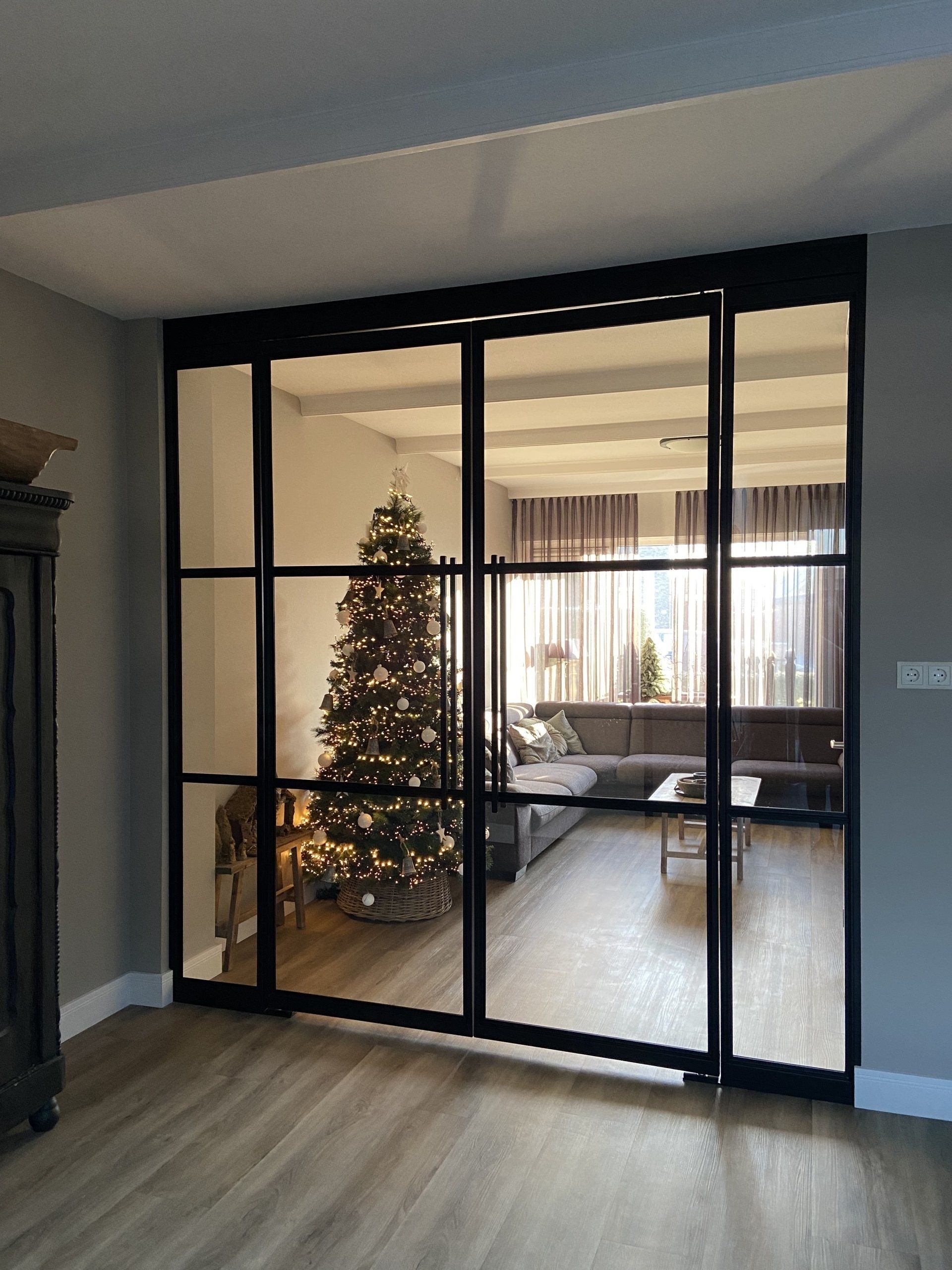 Brede stalen schuifdeur met zijlicht tussen woonkamer en keuken