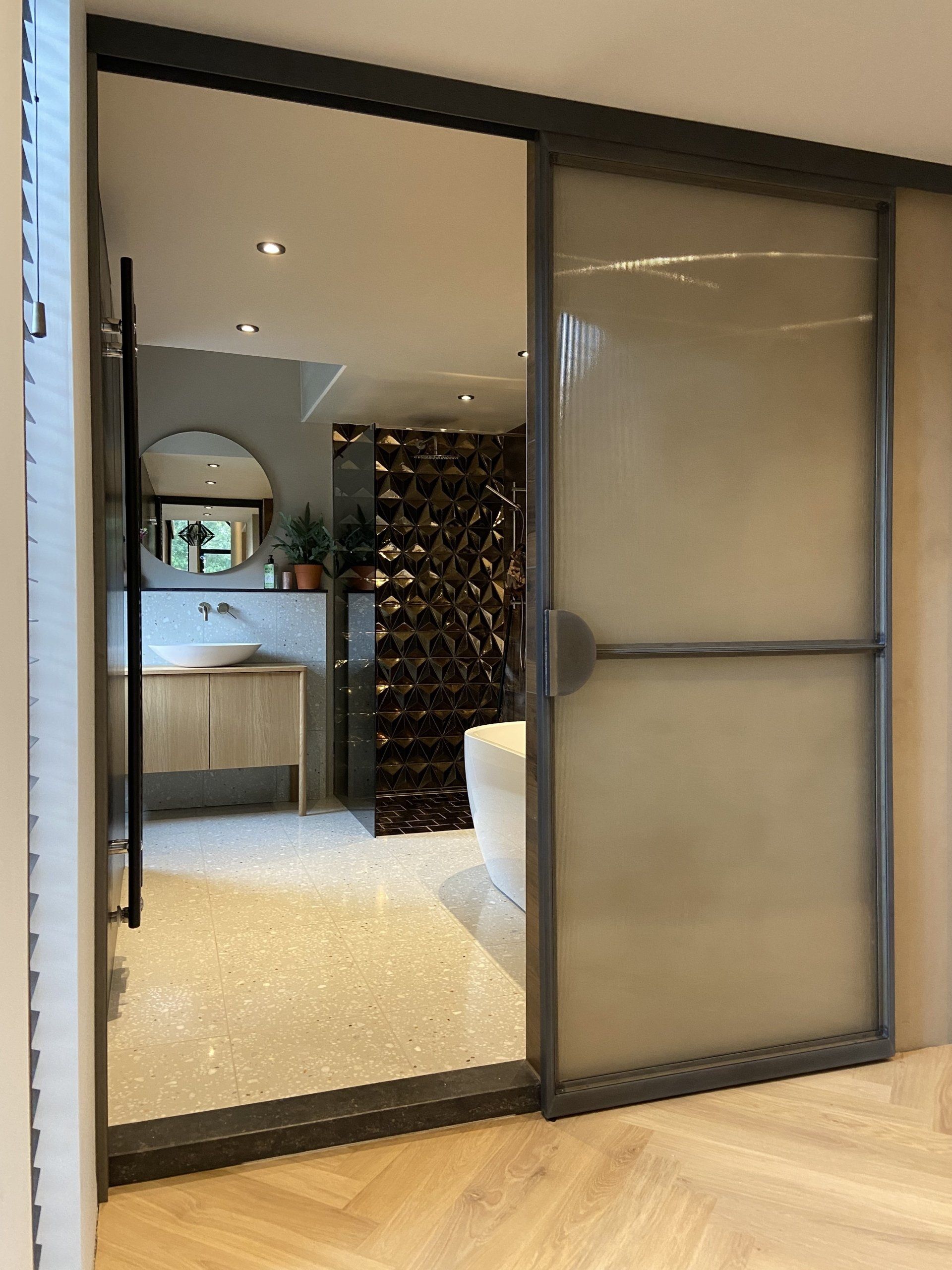 Bronzen wand met schuifdeur